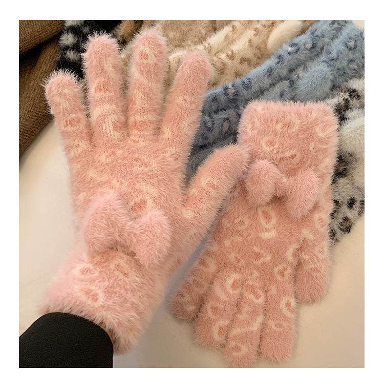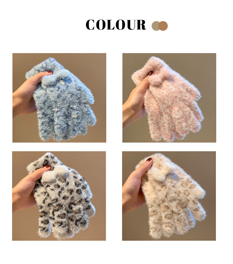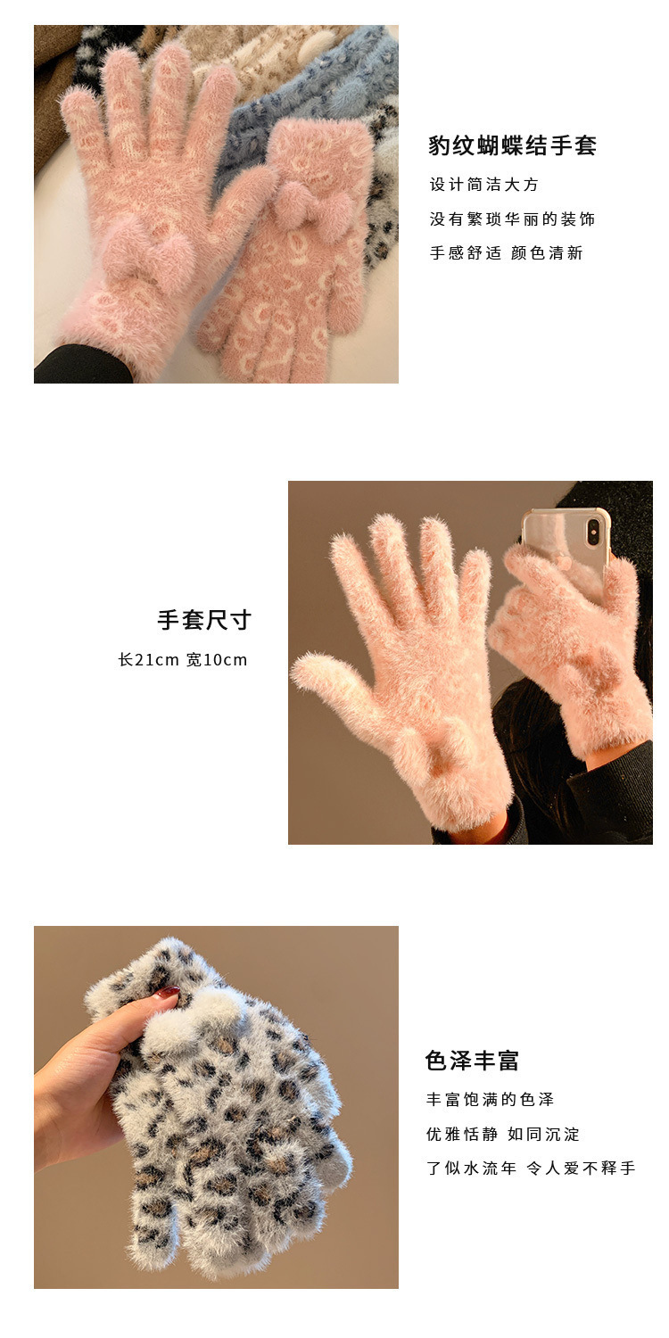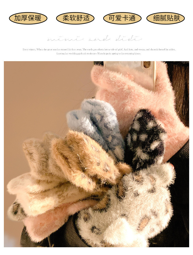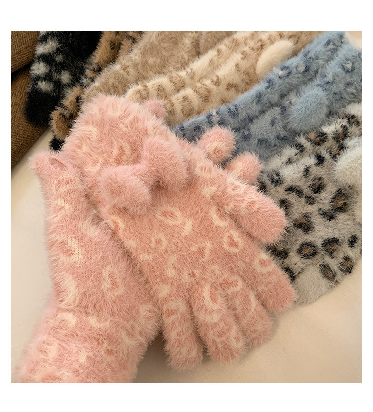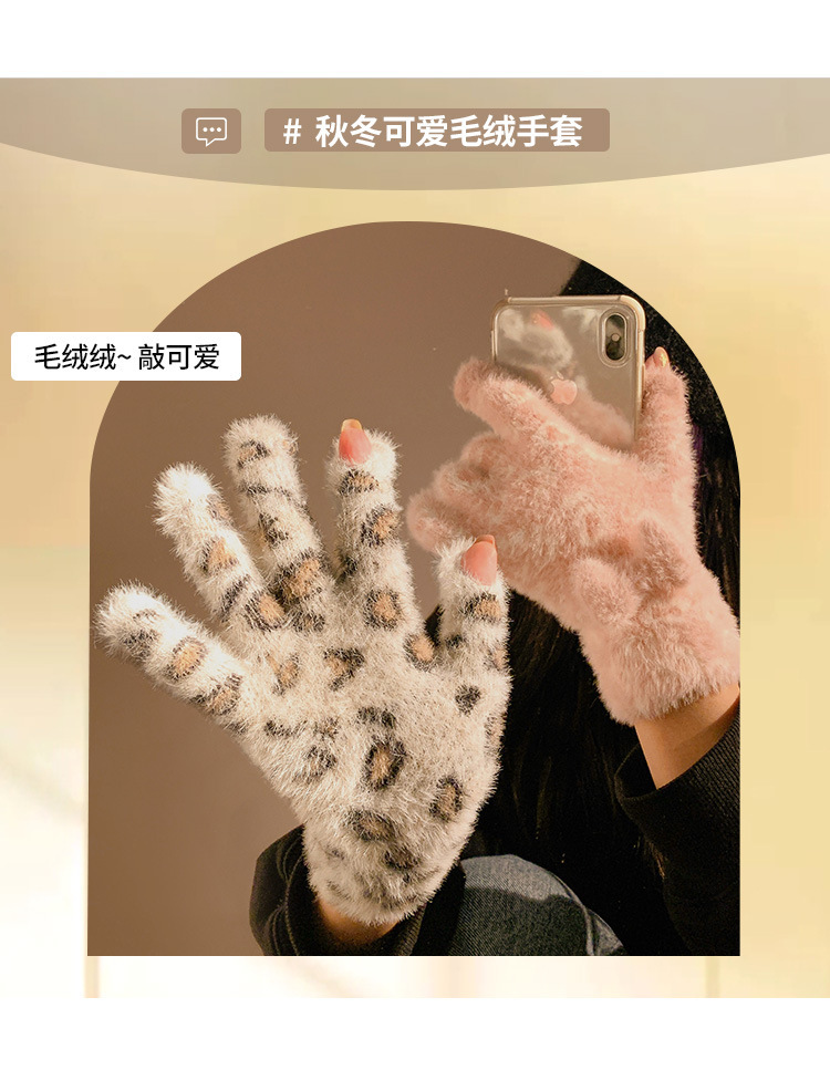 保暖韩版毛线手套女冬季兔毛绒全指可爱骑行豹纹弹力连指防寒防风