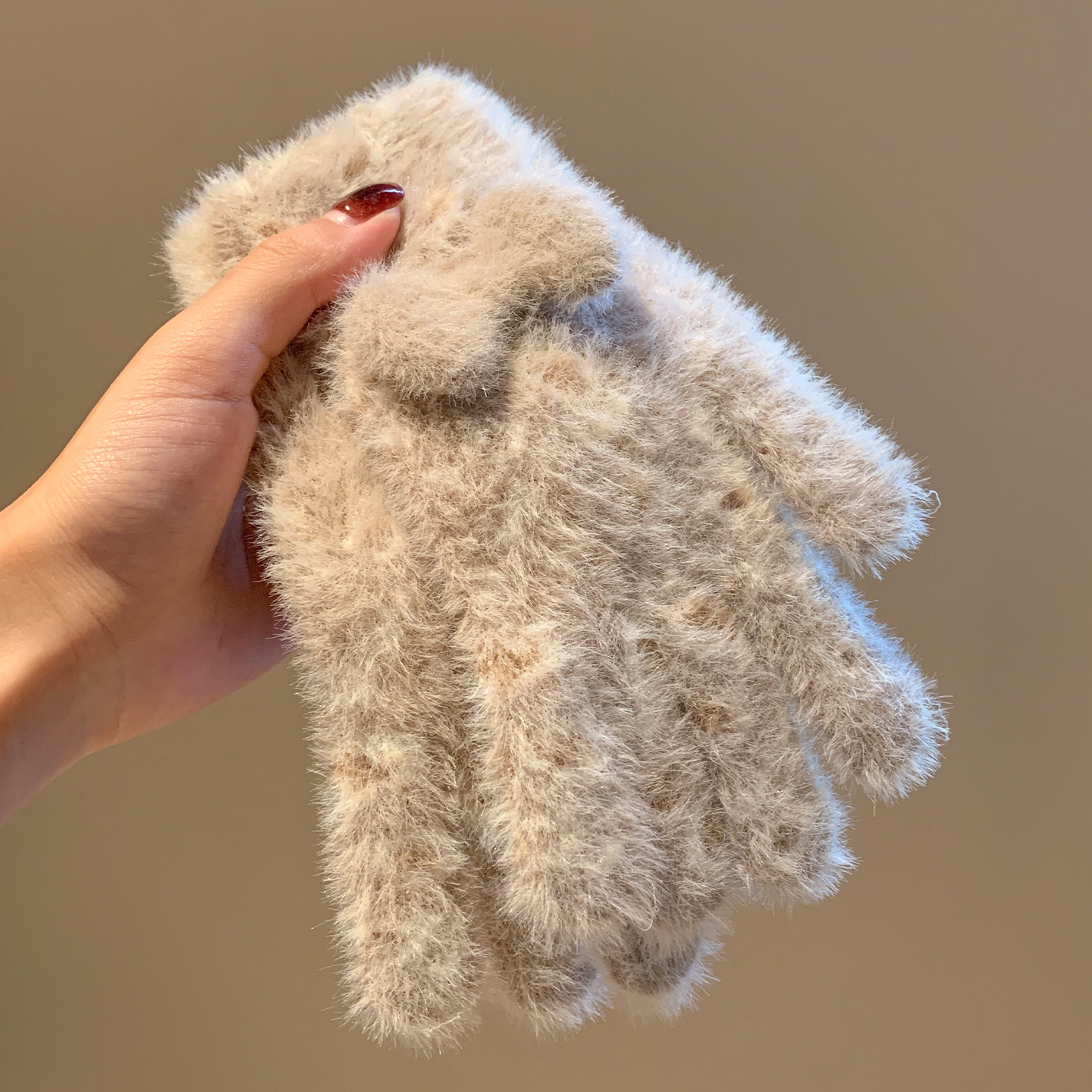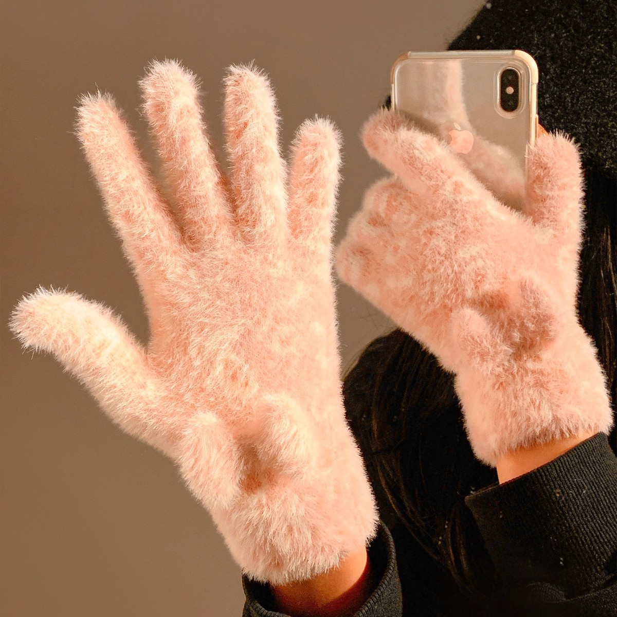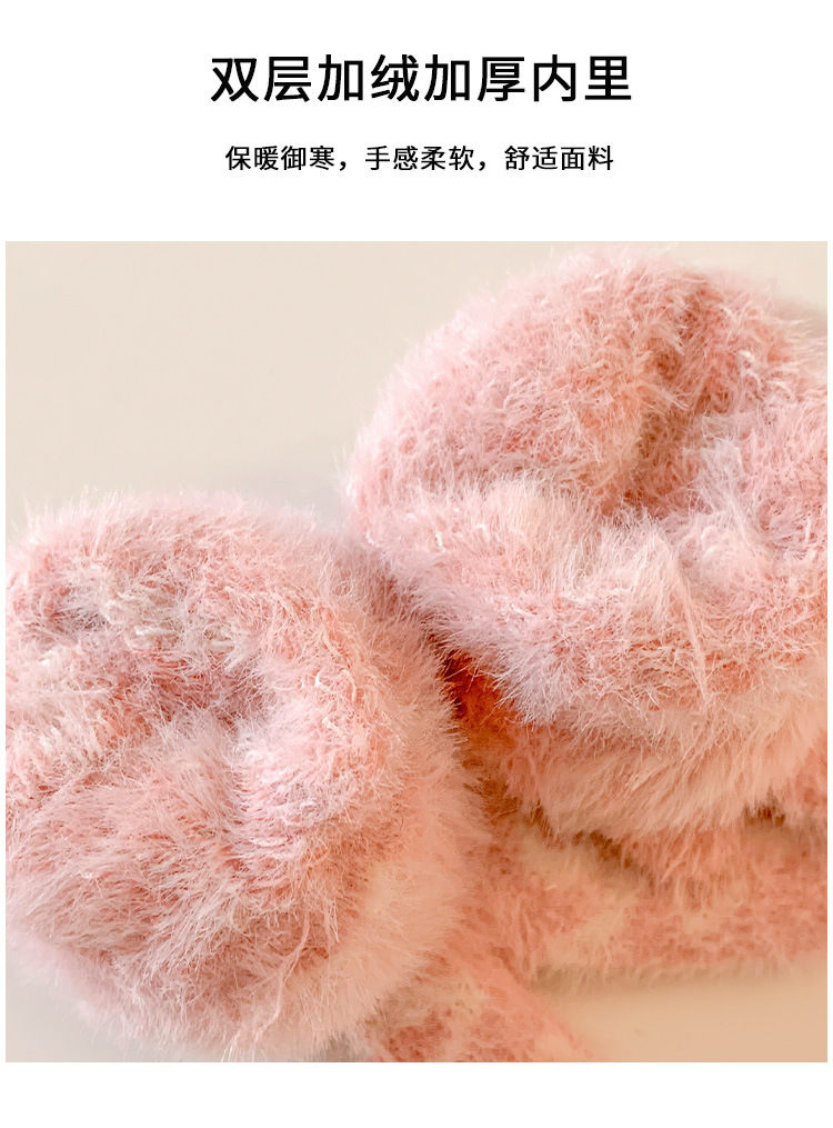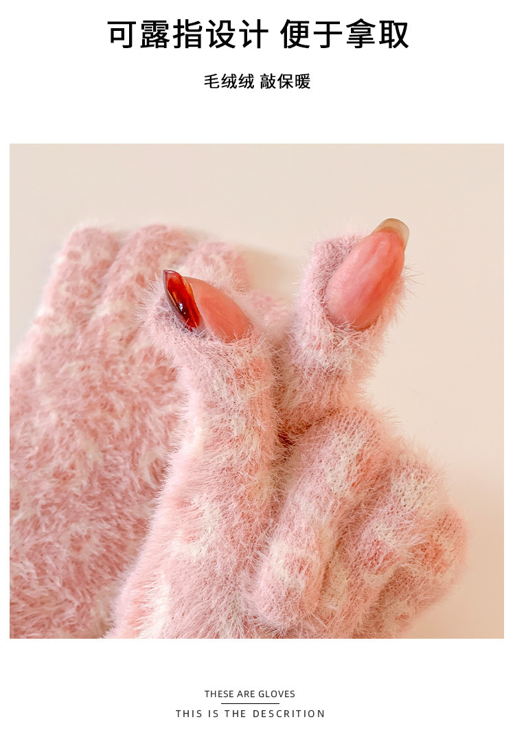 保暖韩版毛线手套女冬季兔毛绒全指可爱骑行豹纹弹力连指防寒防风
