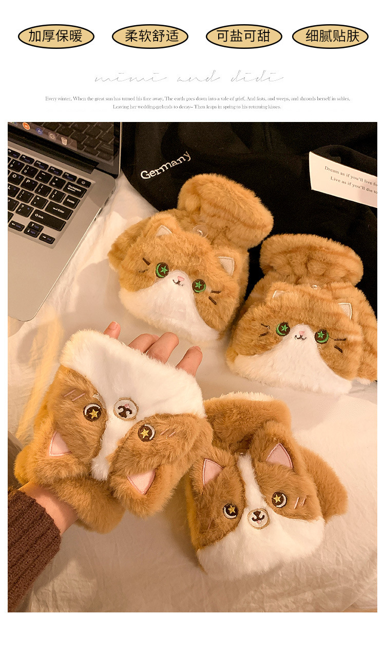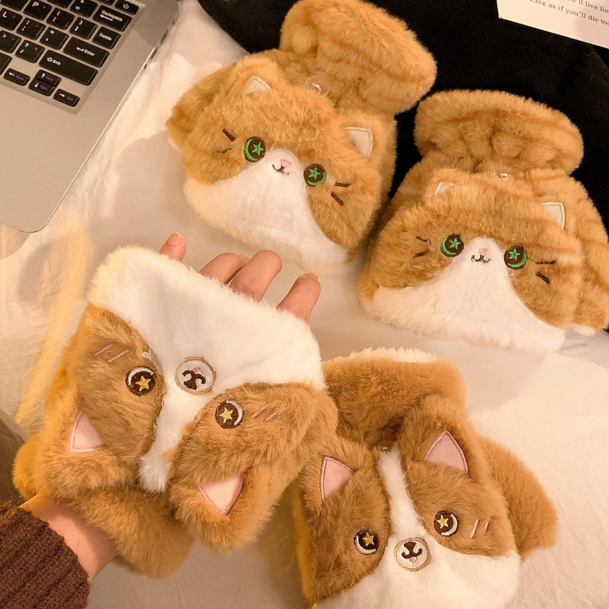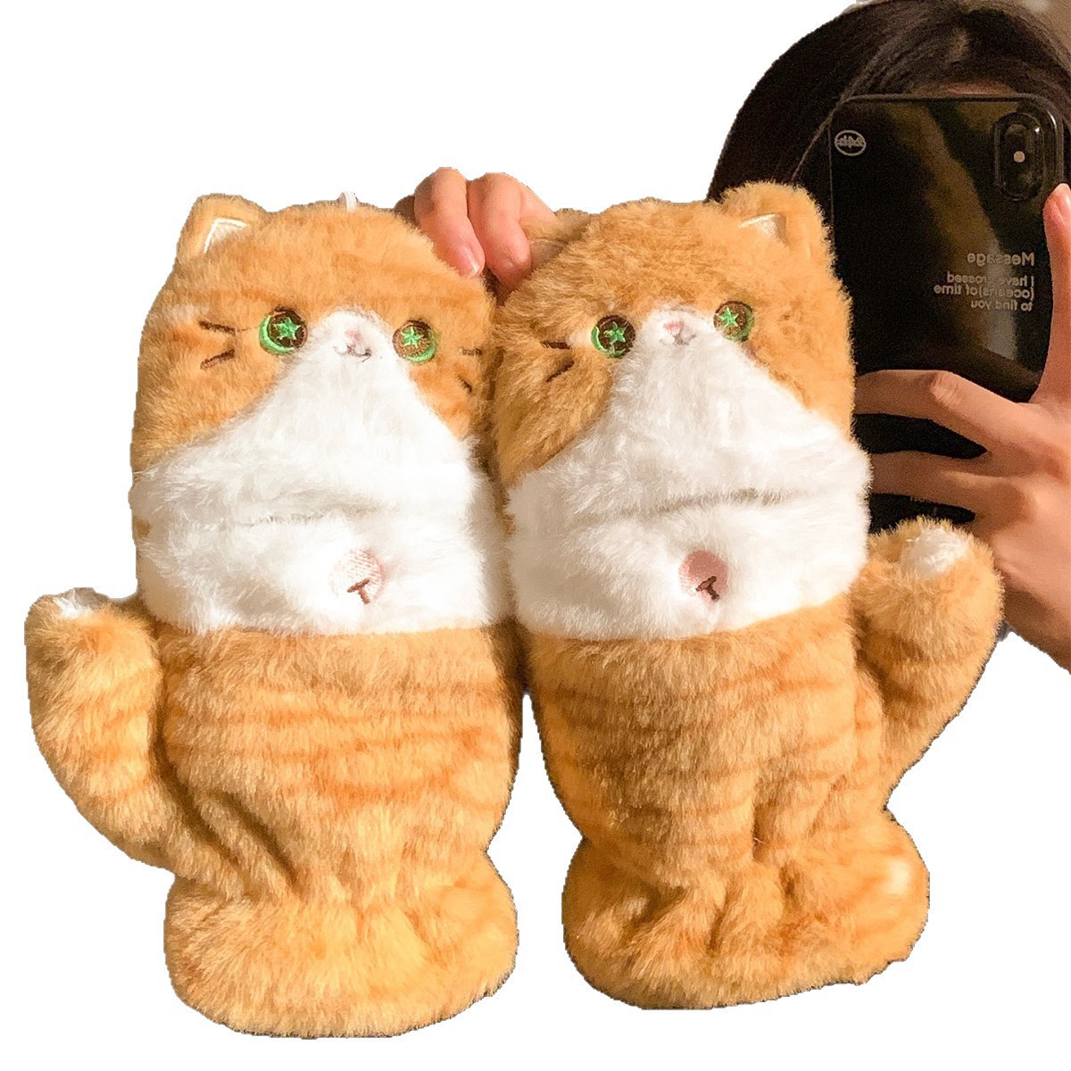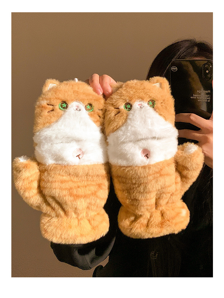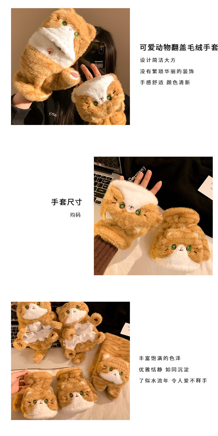 可爱黄色小猫翻盖加厚保暖手套女半指加绒防冻可触屏学生写字冬季