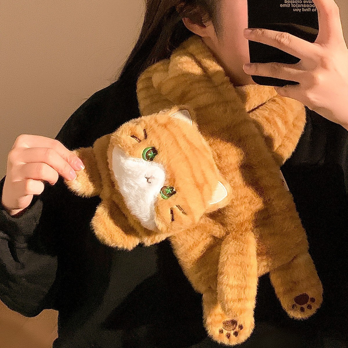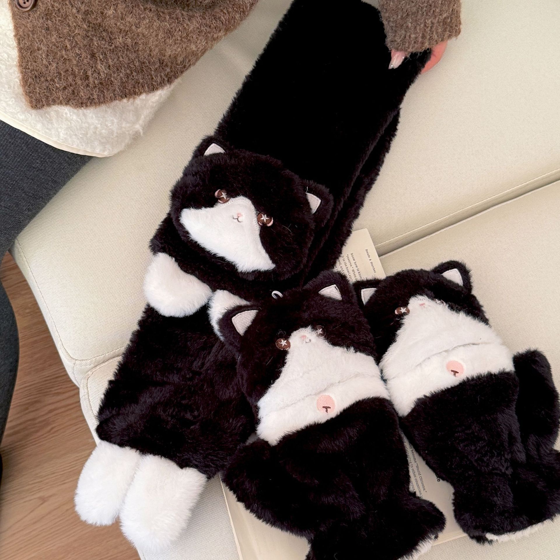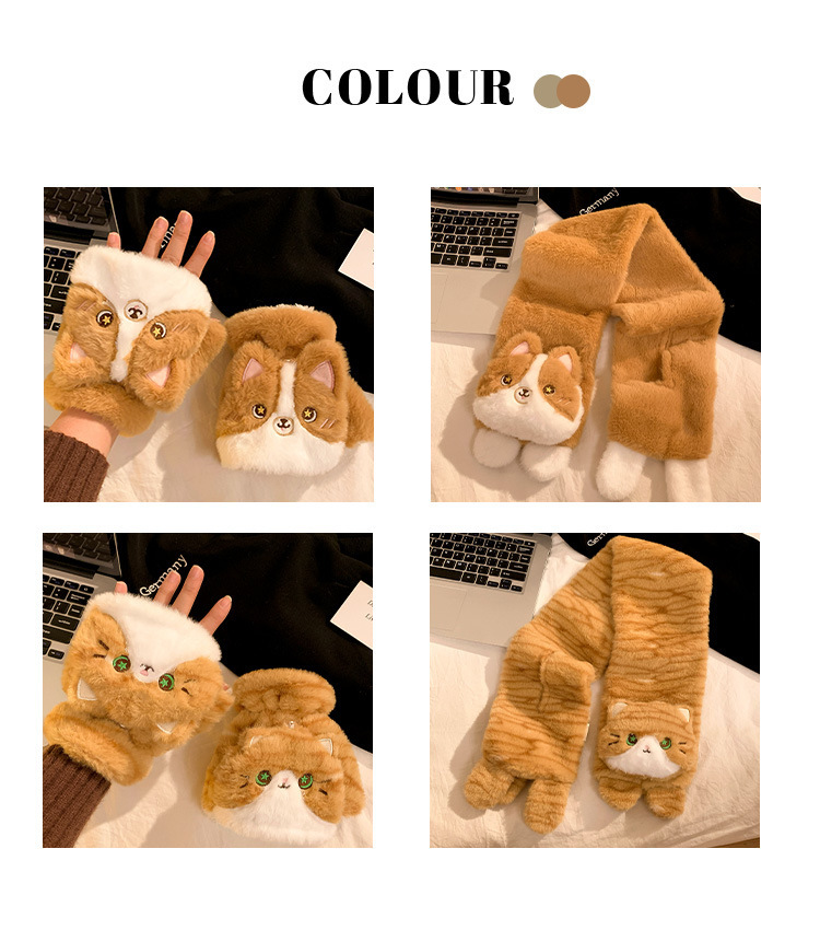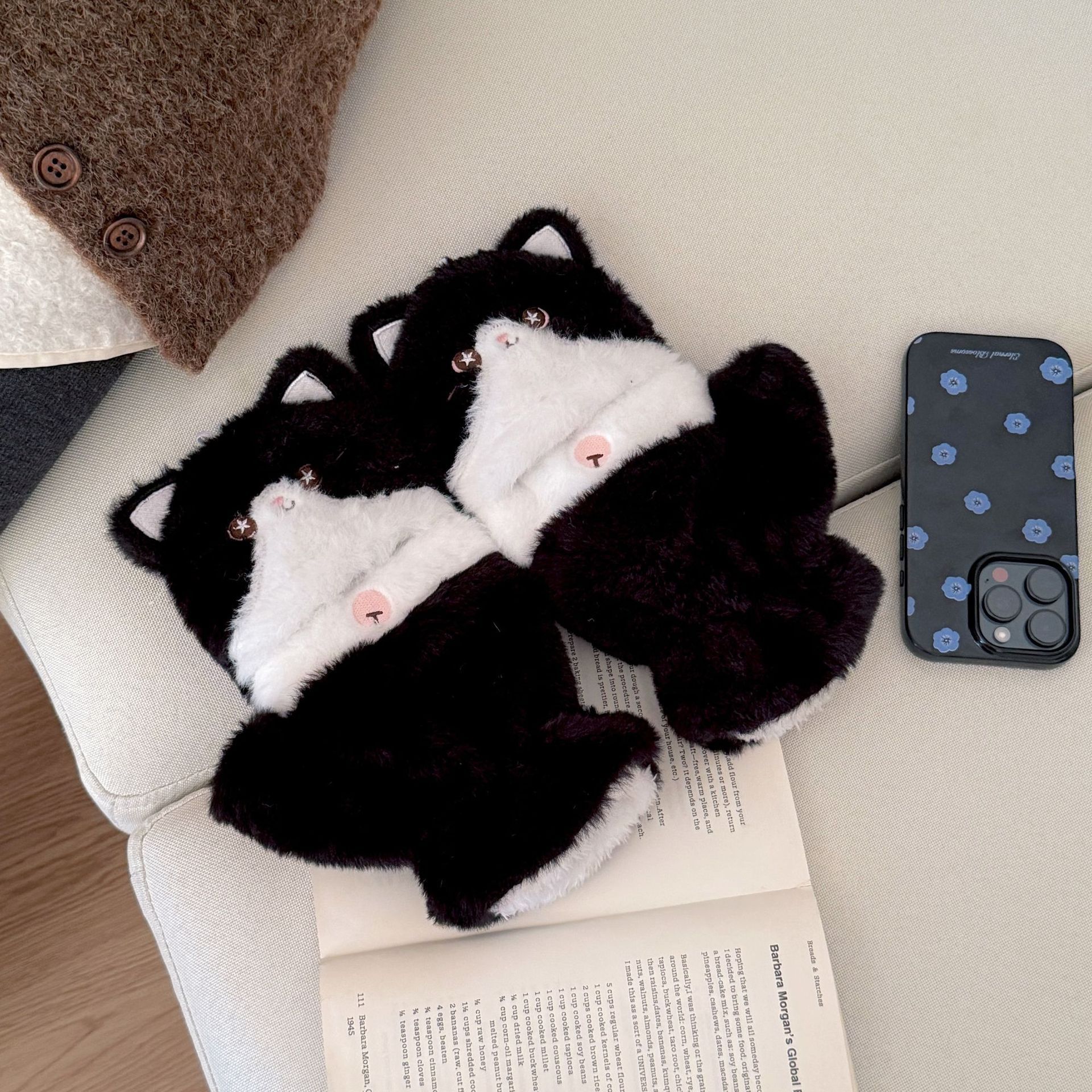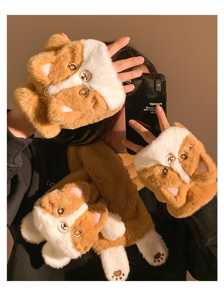 可爱黄色小猫翻盖加厚保暖手套女半指加绒防冻可触屏学生写字冬季