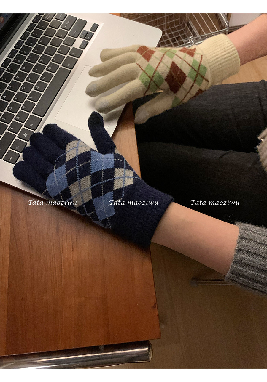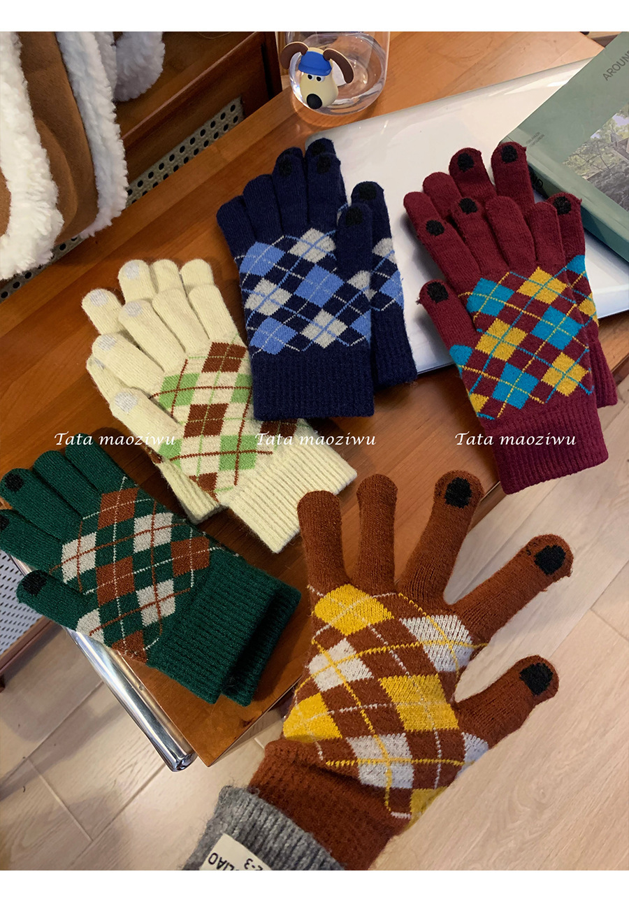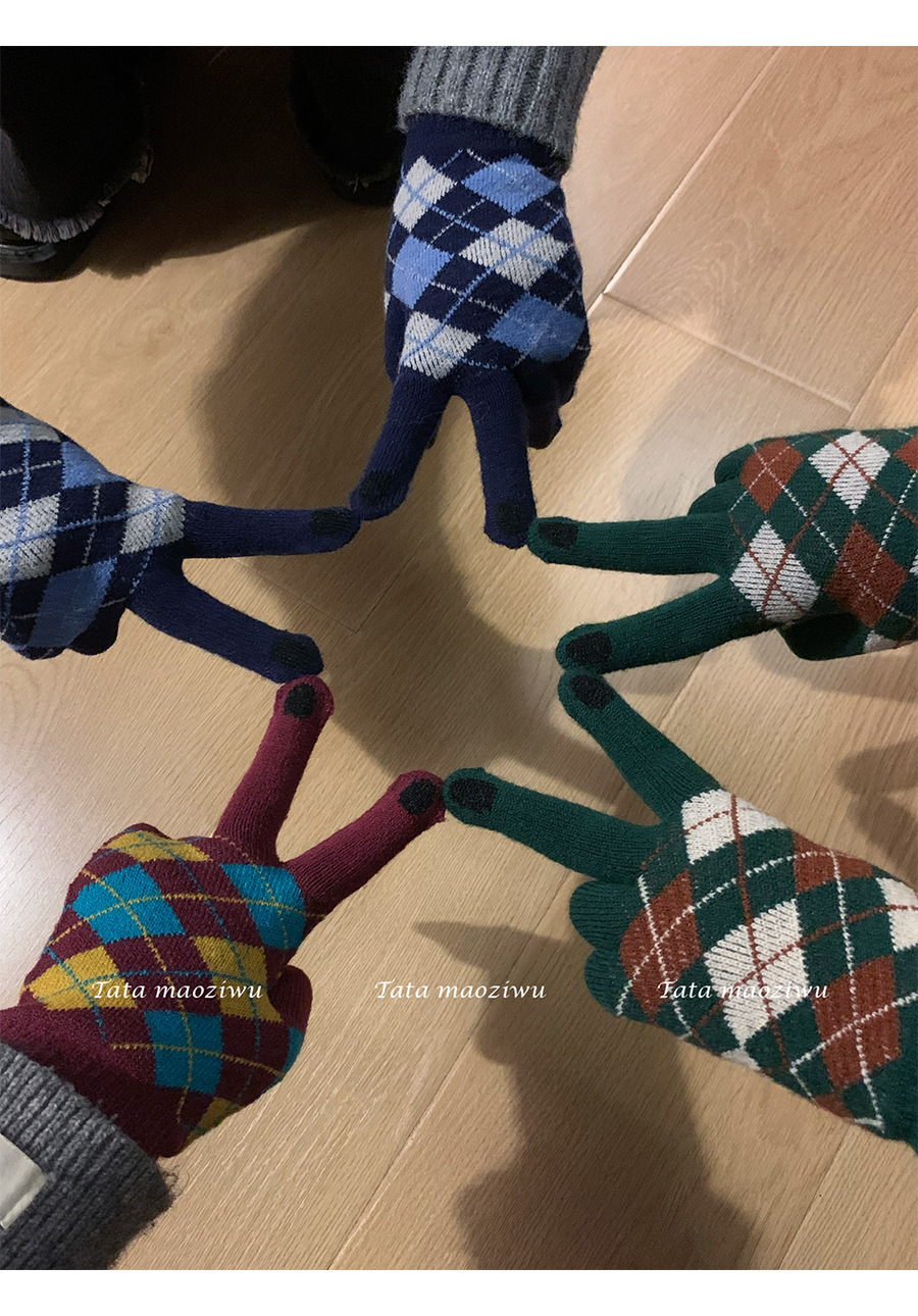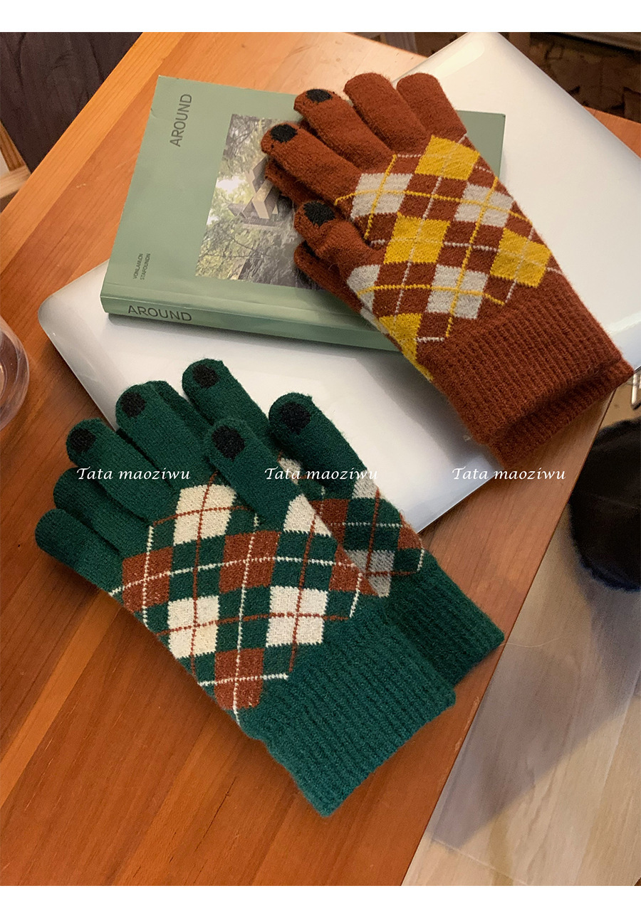 保暖手套女冬季毛线针织拼色菱形格子防寒加绒五指学生骑行可触屏