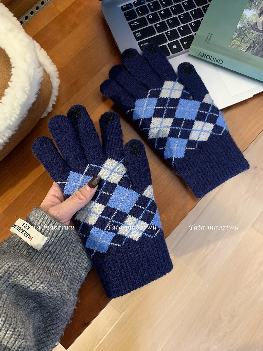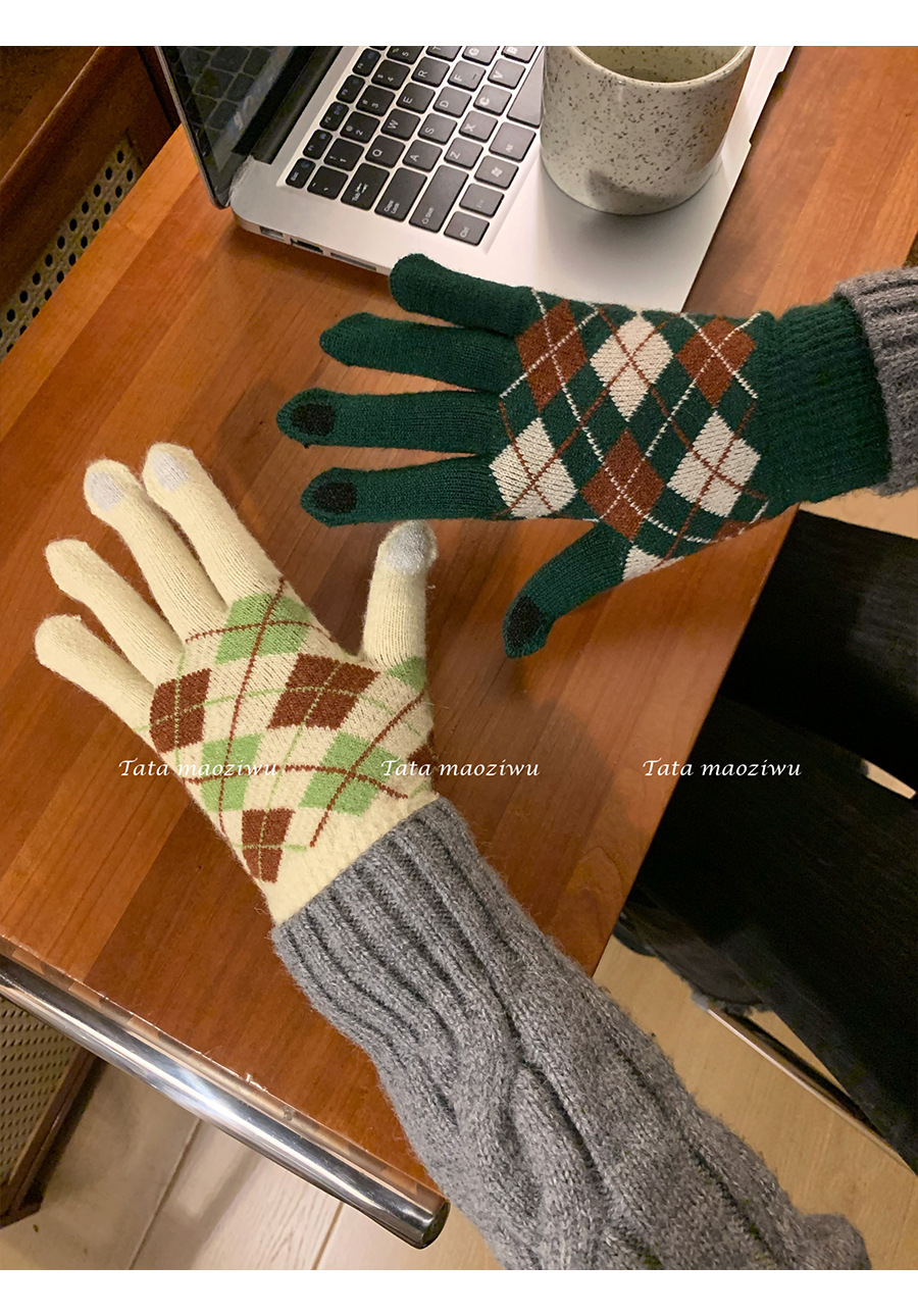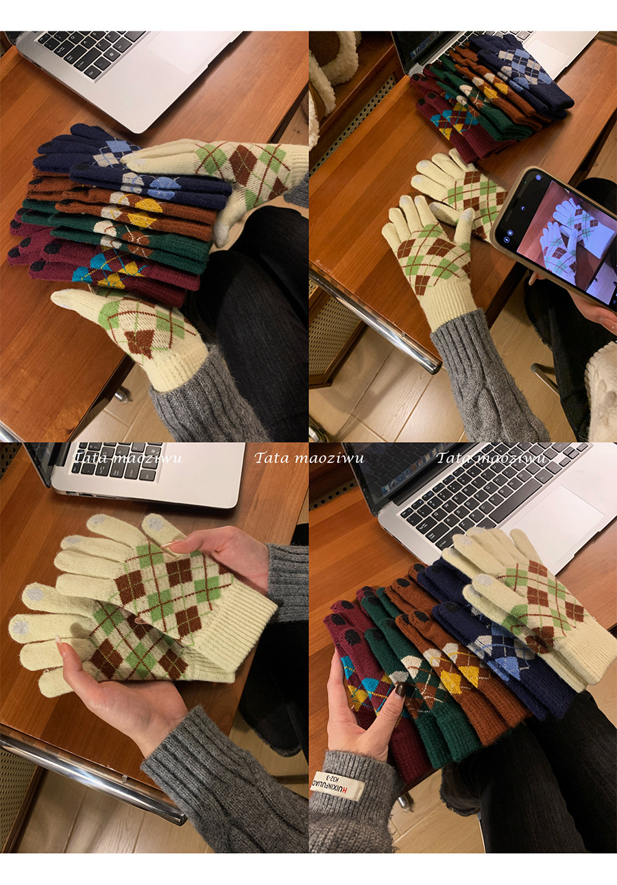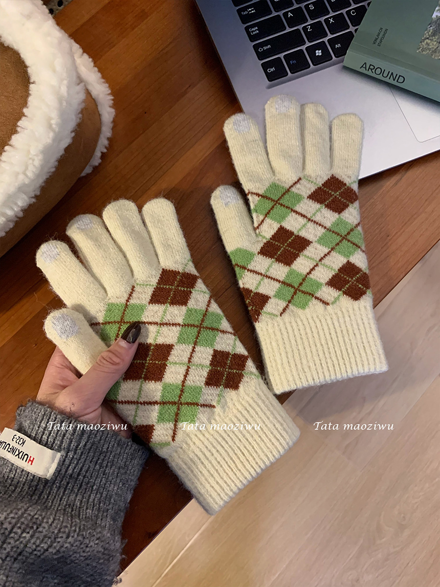 保暖手套女冬季毛线针织拼色菱形格子防寒加绒五指学生骑行可触屏