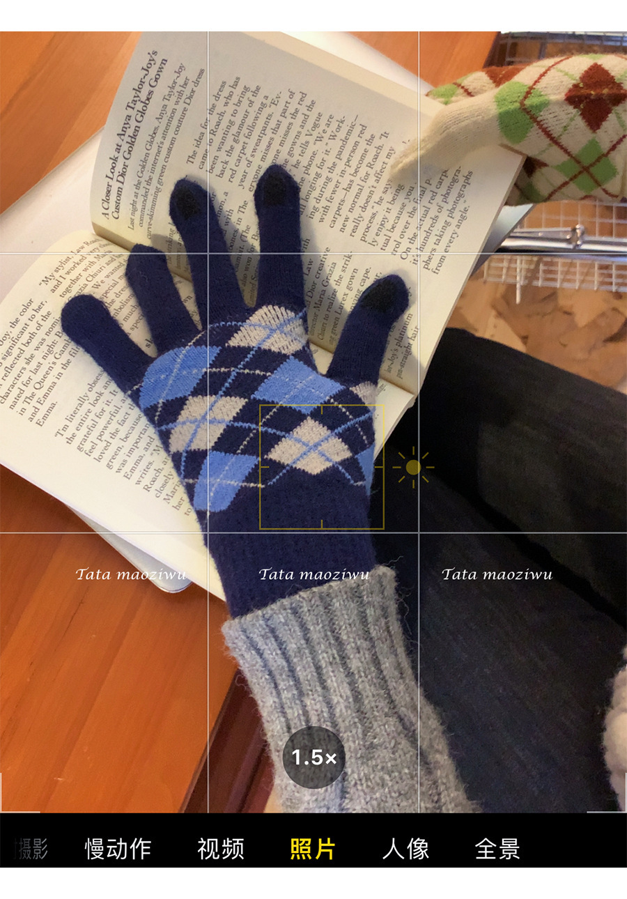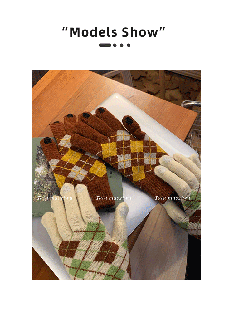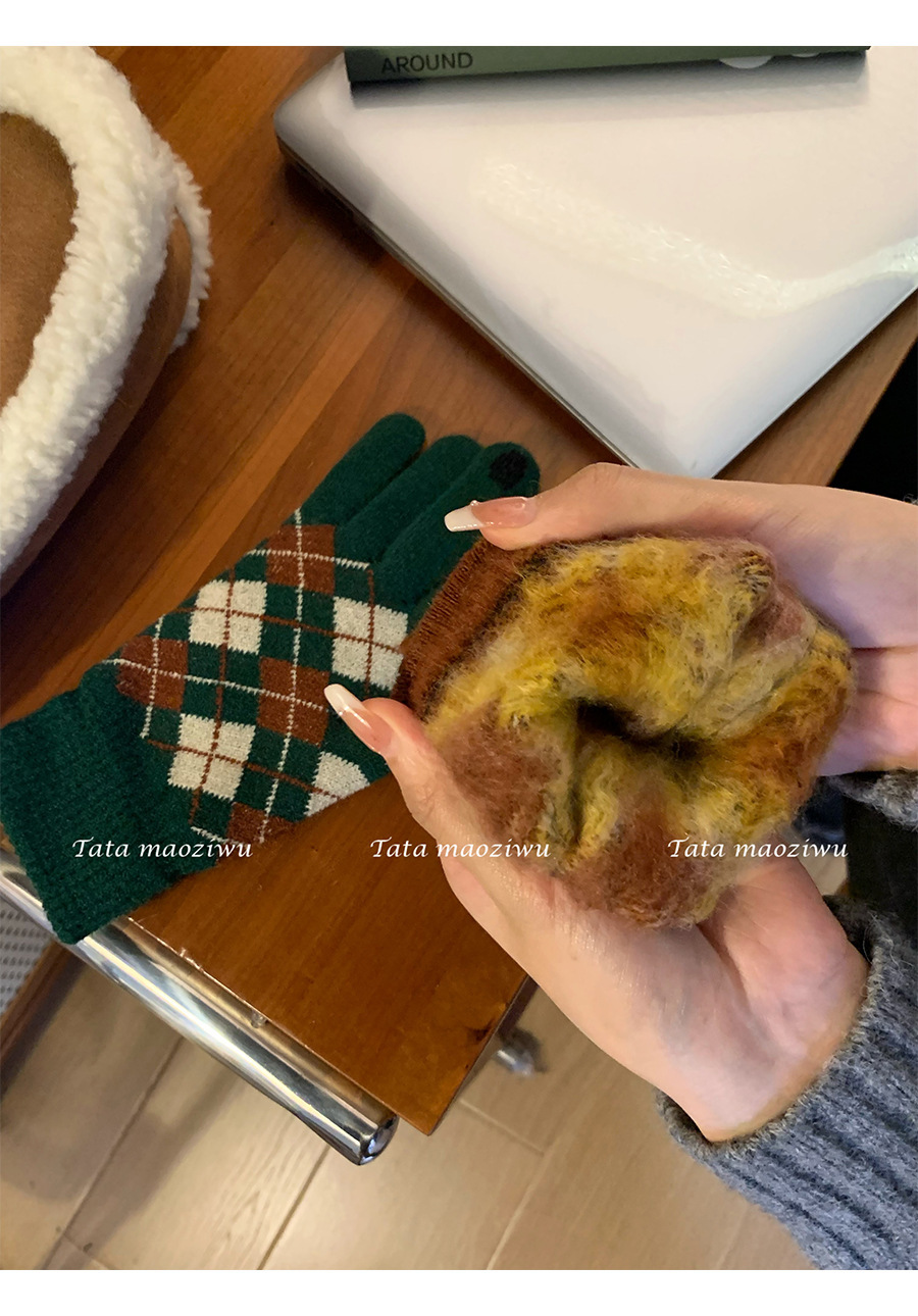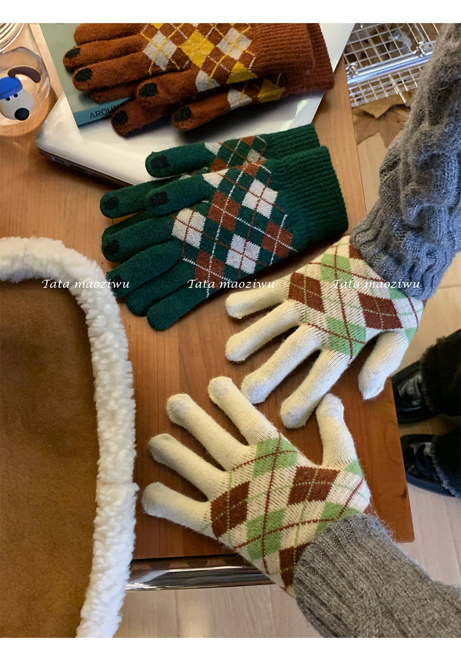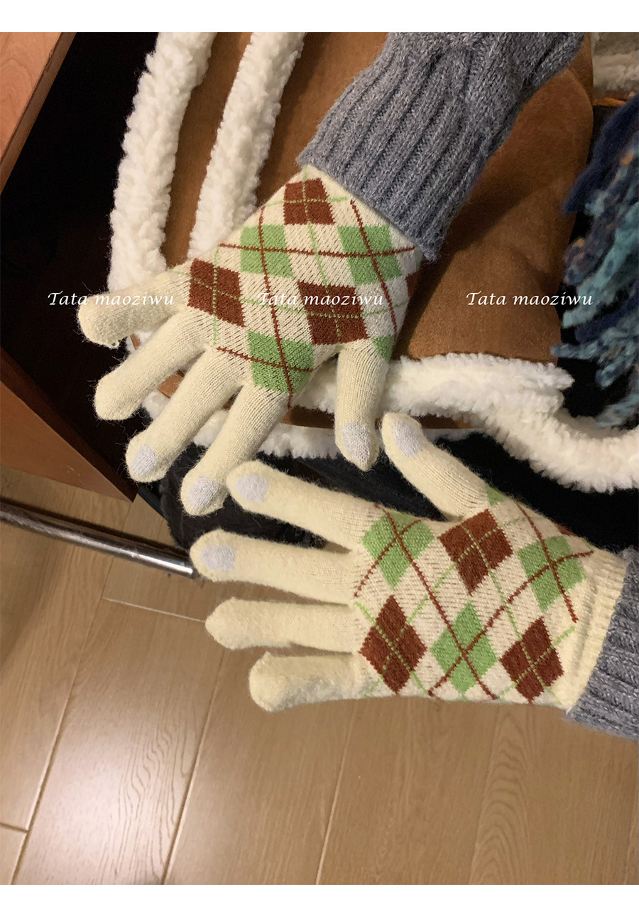 保暖手套女冬季毛线针织拼色菱形格子防寒加绒五指学生骑行可触屏