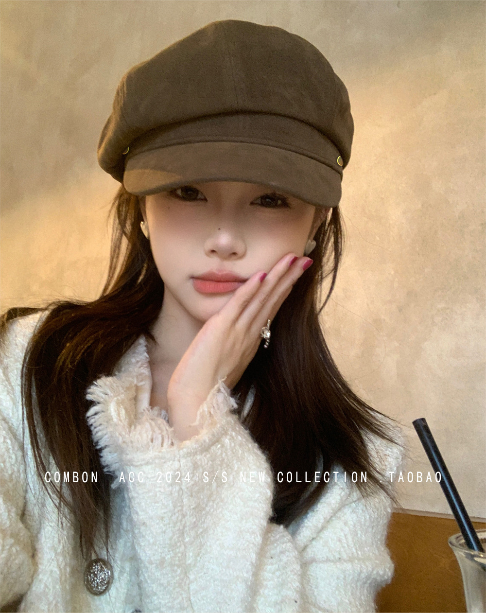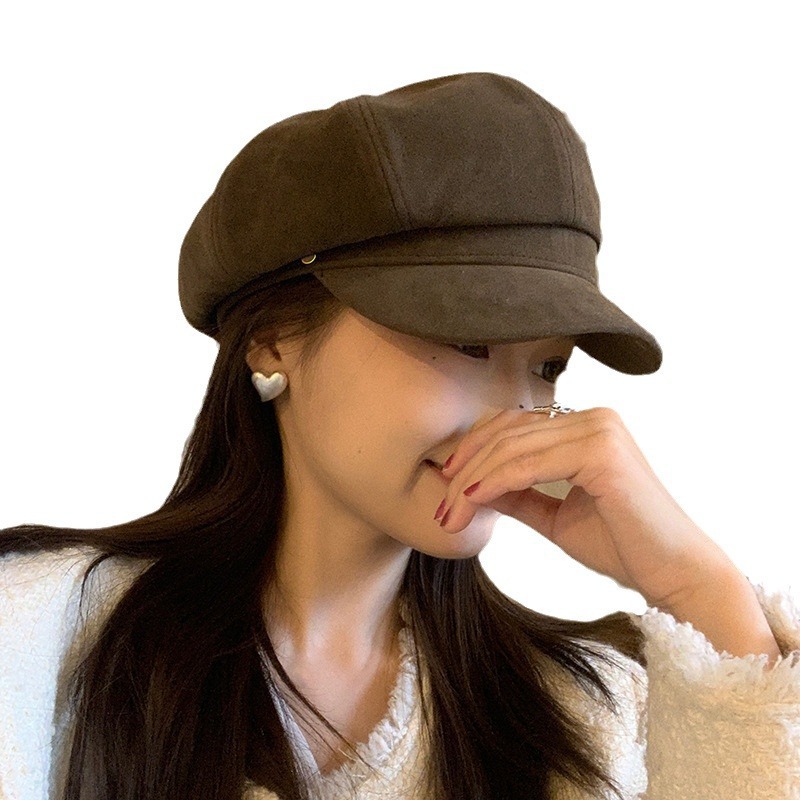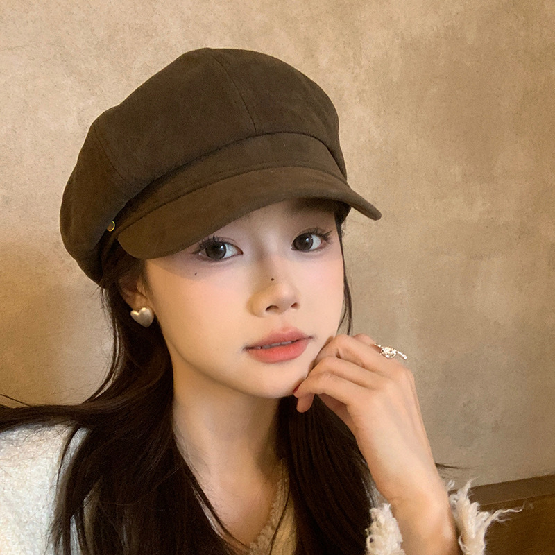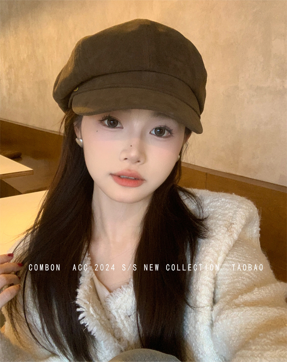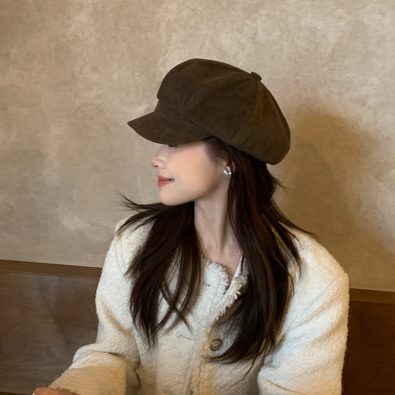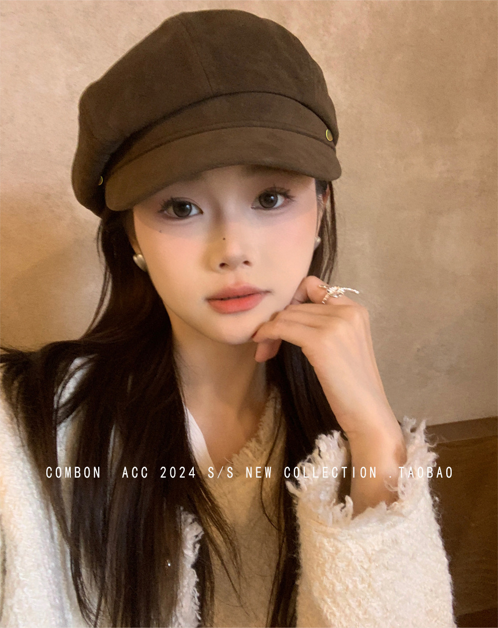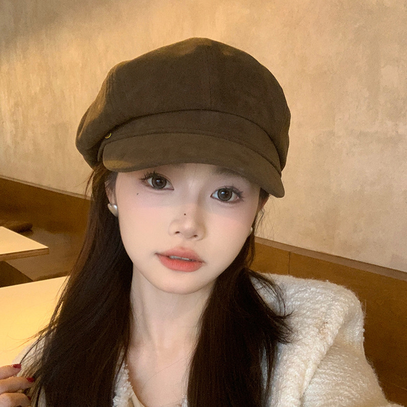 贝雷帽子女秋季日系棕色皮质文艺画家帽复古报童帽显瘦英伦八角帽
