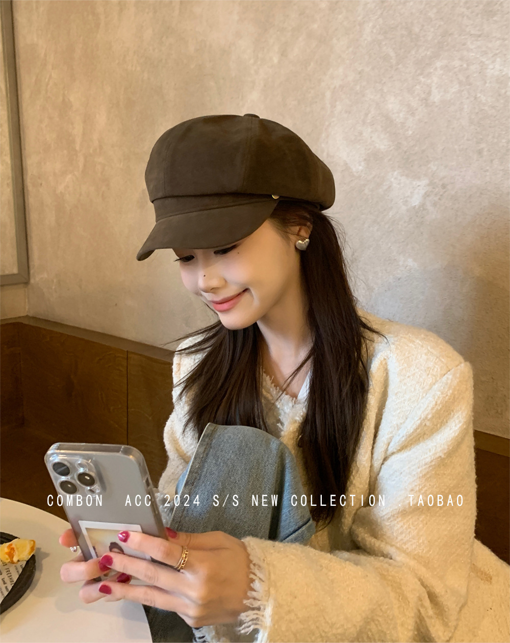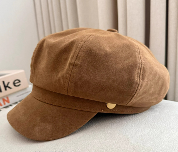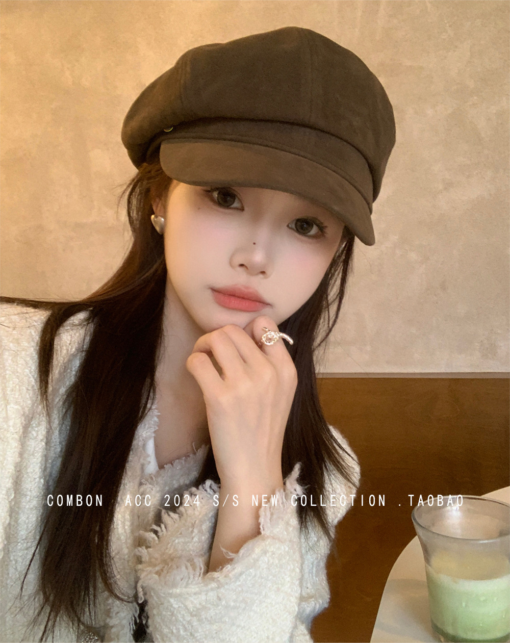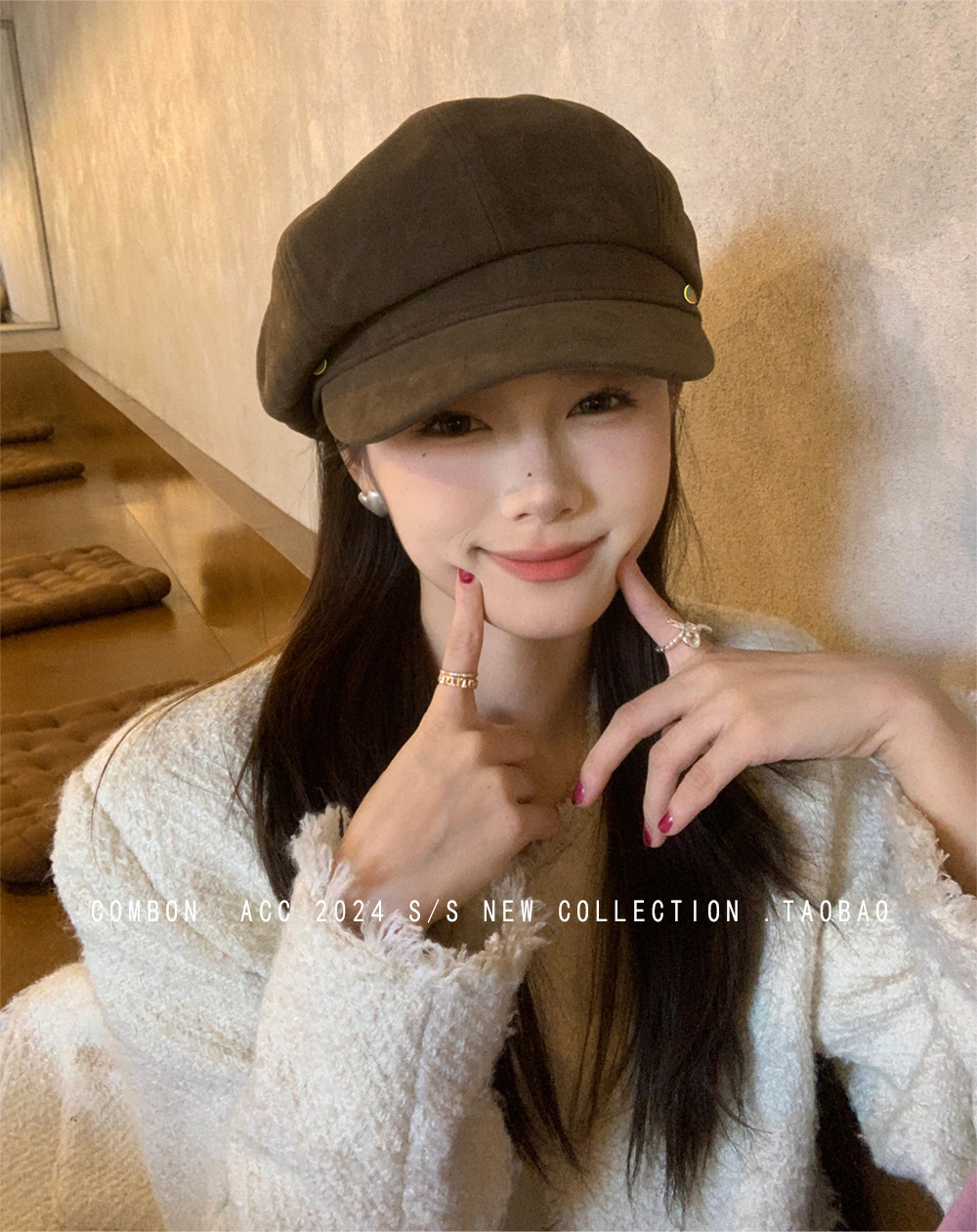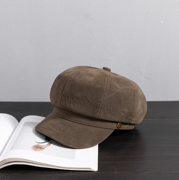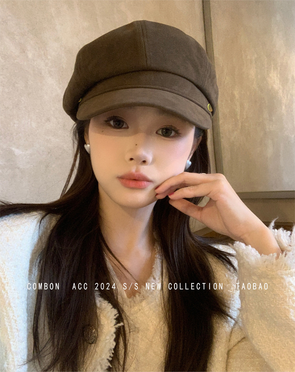 贝雷帽子女秋季日系棕色皮质文艺画家帽复古报童帽显瘦英伦八角帽