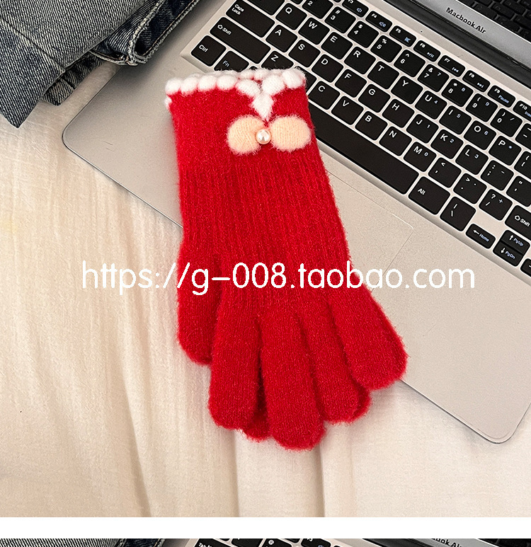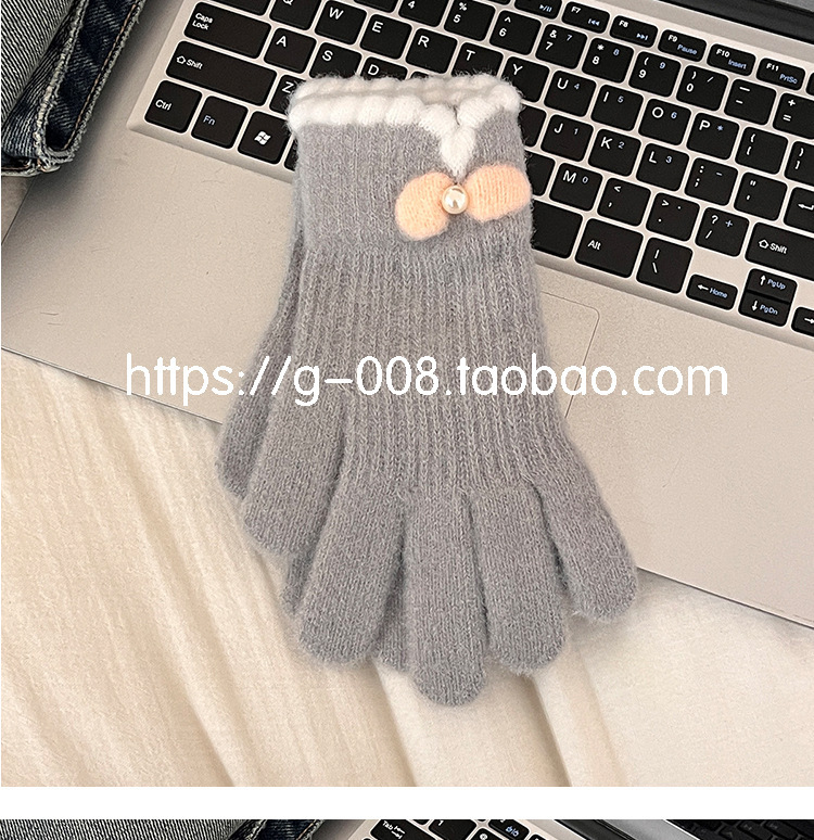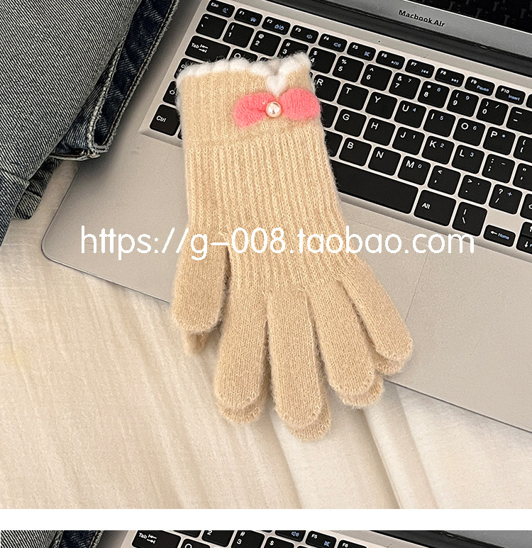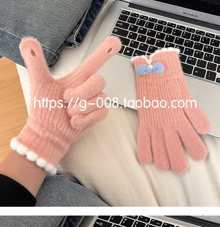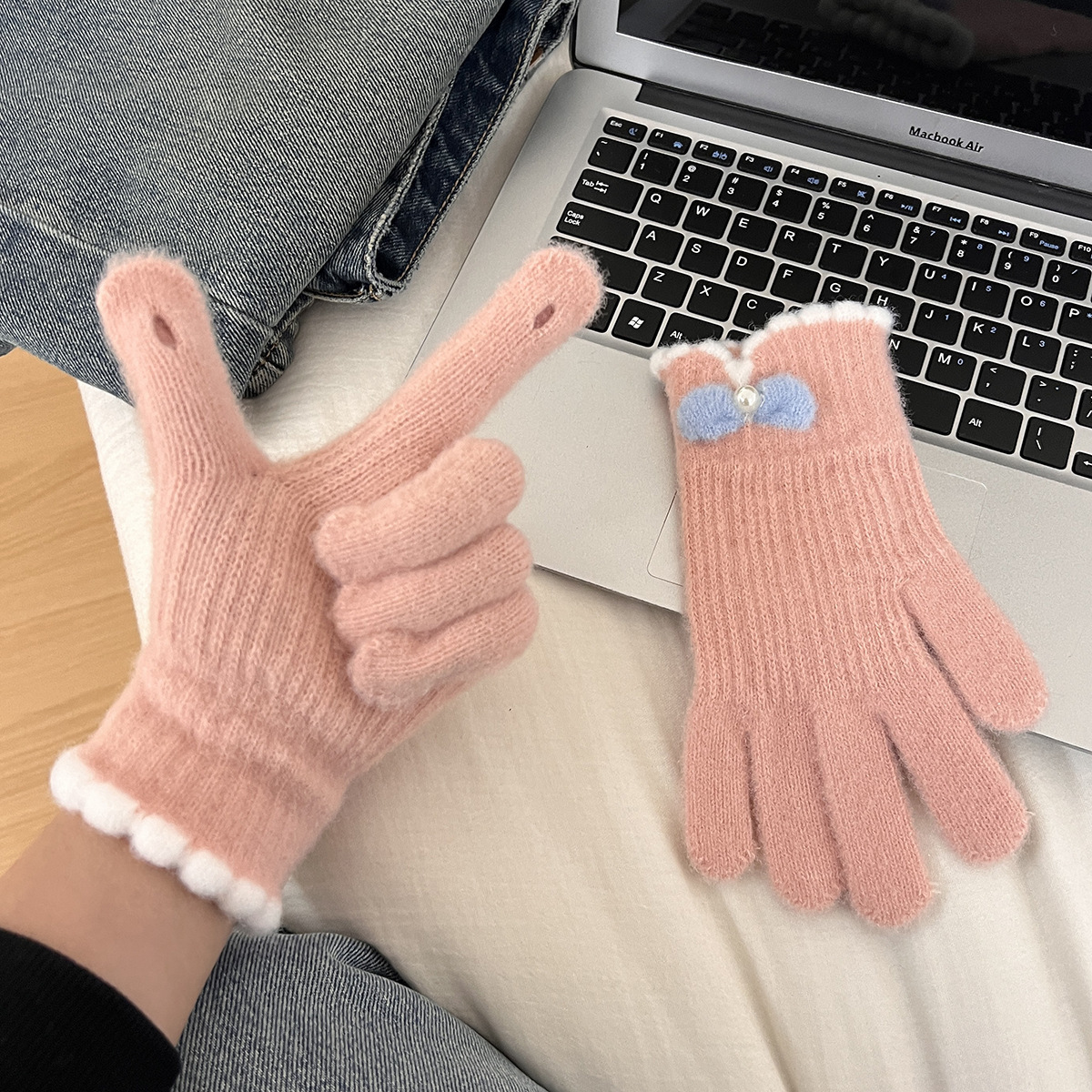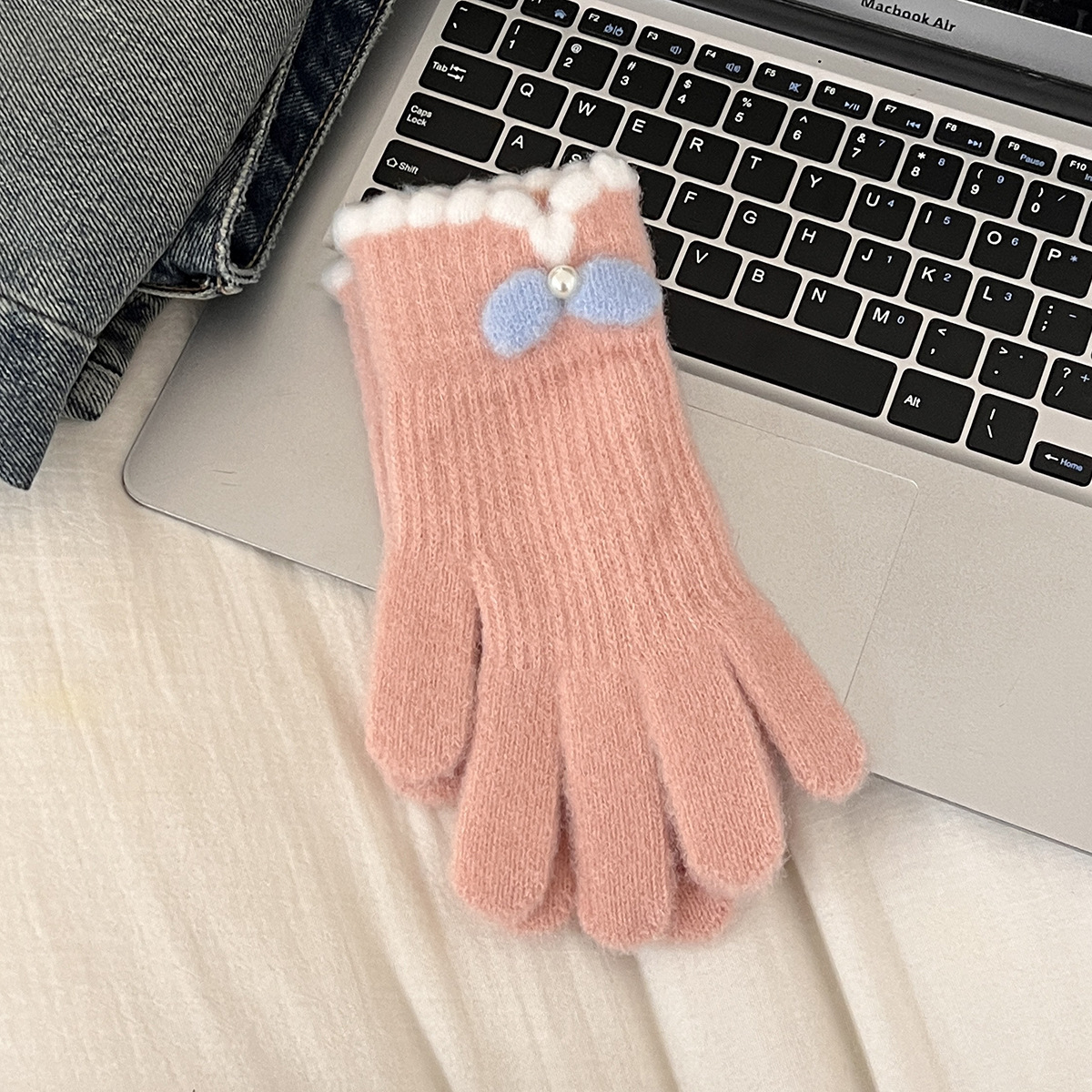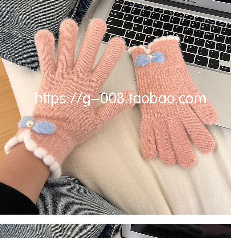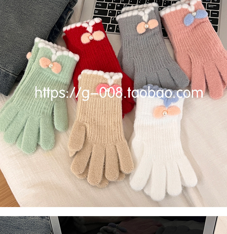 蝴蝶结针织手套女冬季加绒保暖防寒学生户外骑行电动车五指触屏潮