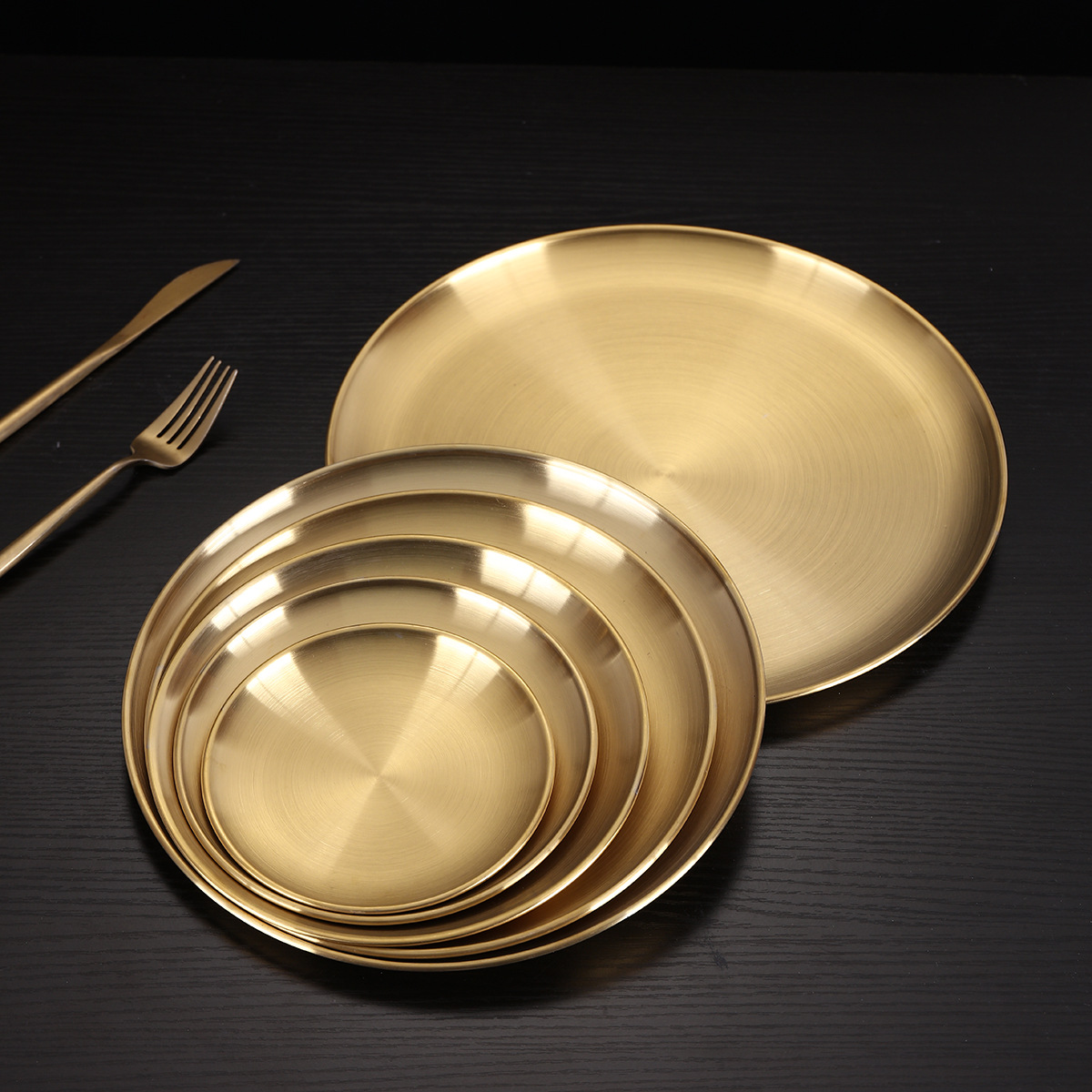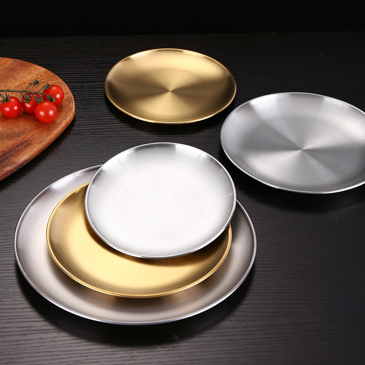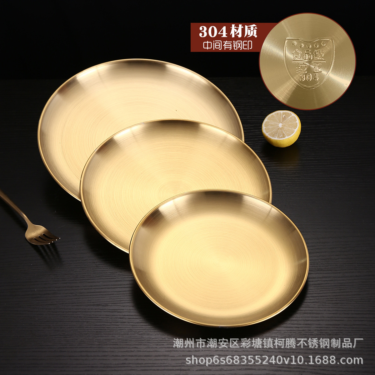 304不锈钢烤盘韩式圆盘金色托盘牛排烤肉盘双层加厚自助点心餐盘
