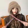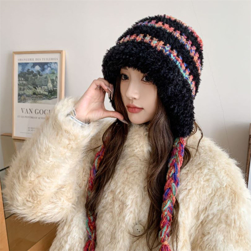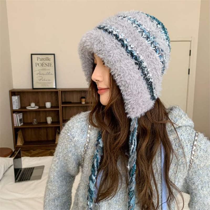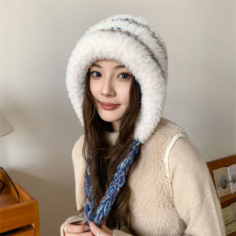 毛茸茸拼色条纹针织毛绒帽女秋冬季流苏百搭帽子大头围防寒风雪帽