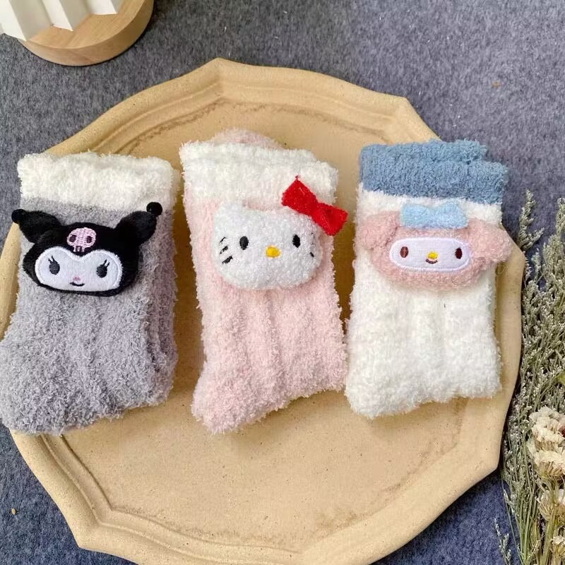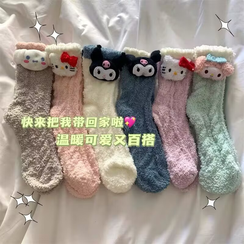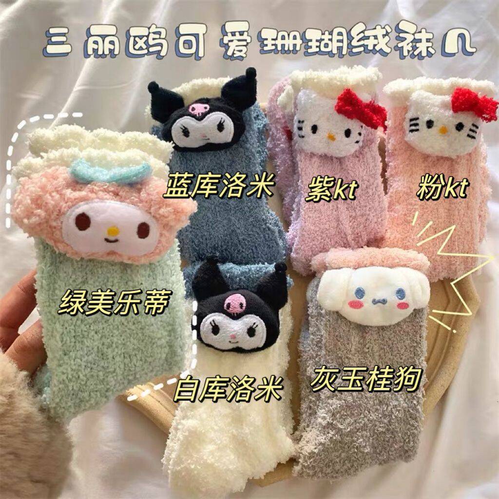 原创三丽鸥珊瑚绒袜子女秋冬白色中筒袜保暖卡通地板袜加厚月子袜