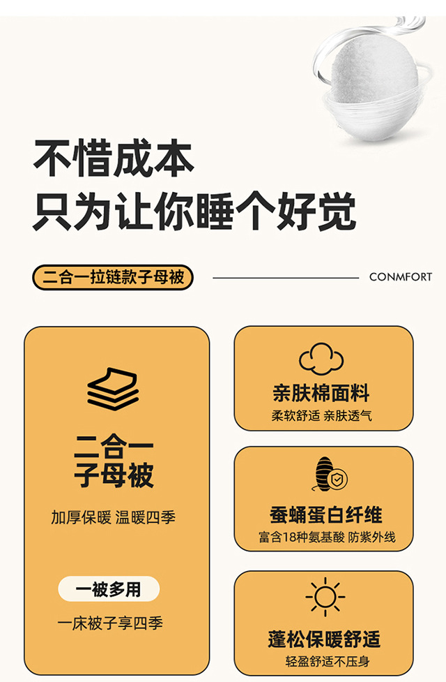 | 200 × 230cm 2.00kg +3.00kg zipper double quilts(200×230cm4斤+6斤拉链款子母被) | USD $32.32 | 999996 bed available |
