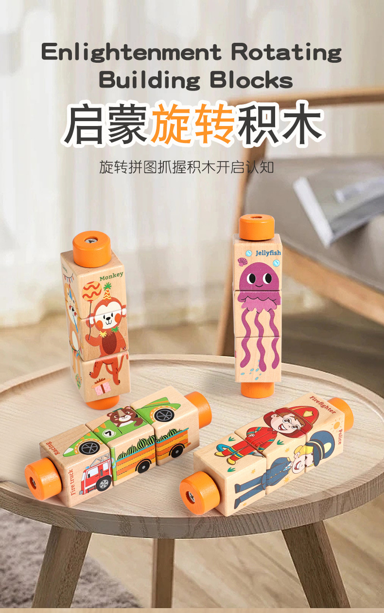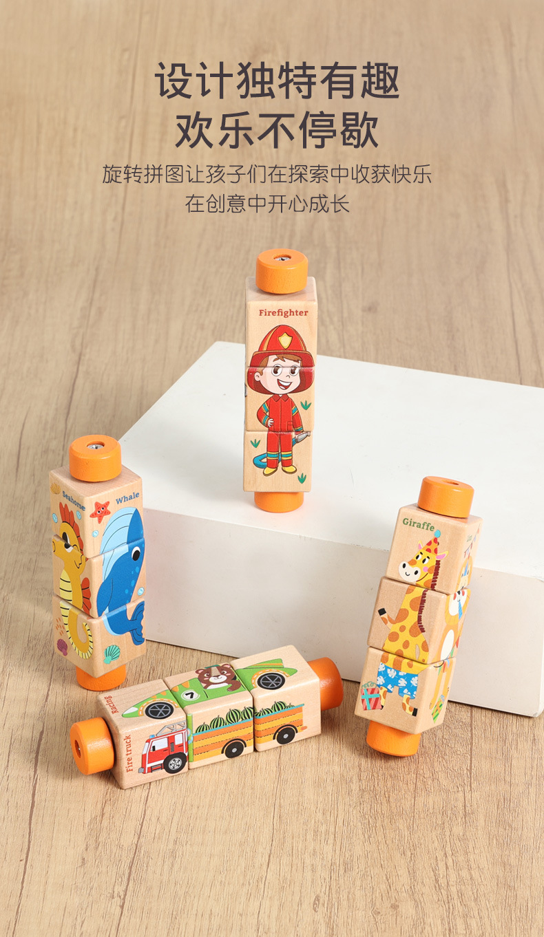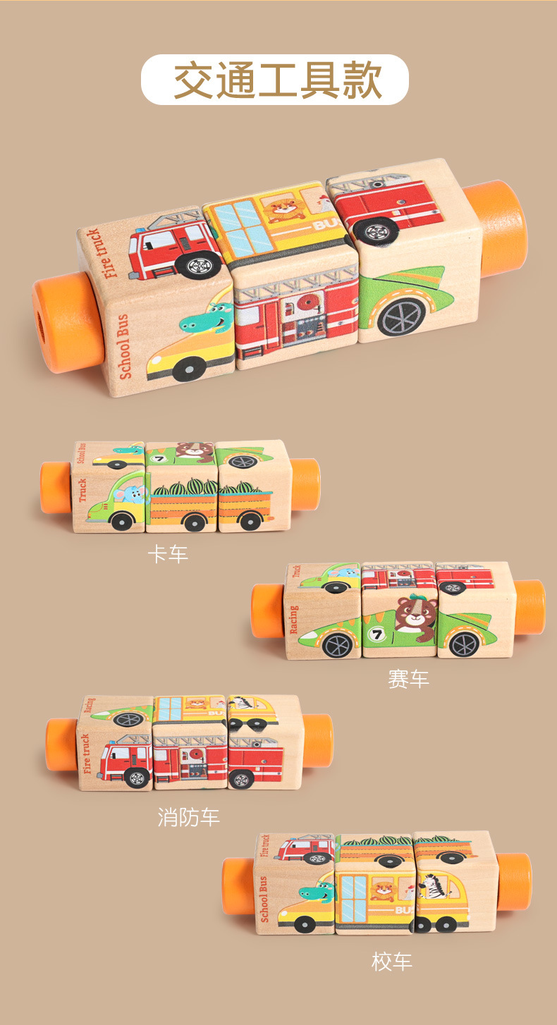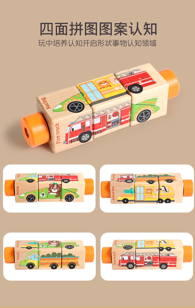 跨境儿童木制旋转积木拼图 婴幼儿早教动物交通启蒙认知拼图玩具
