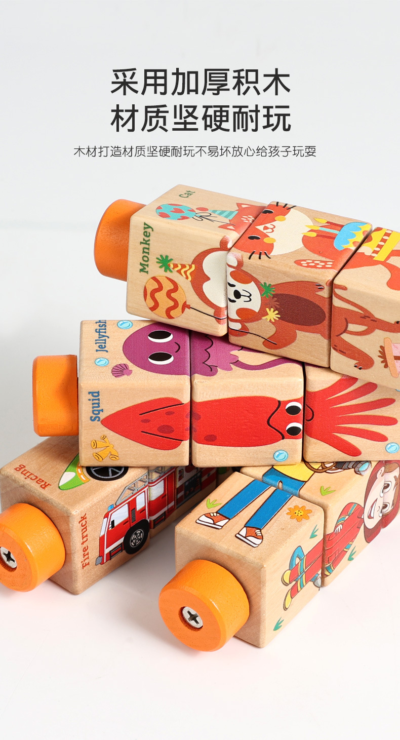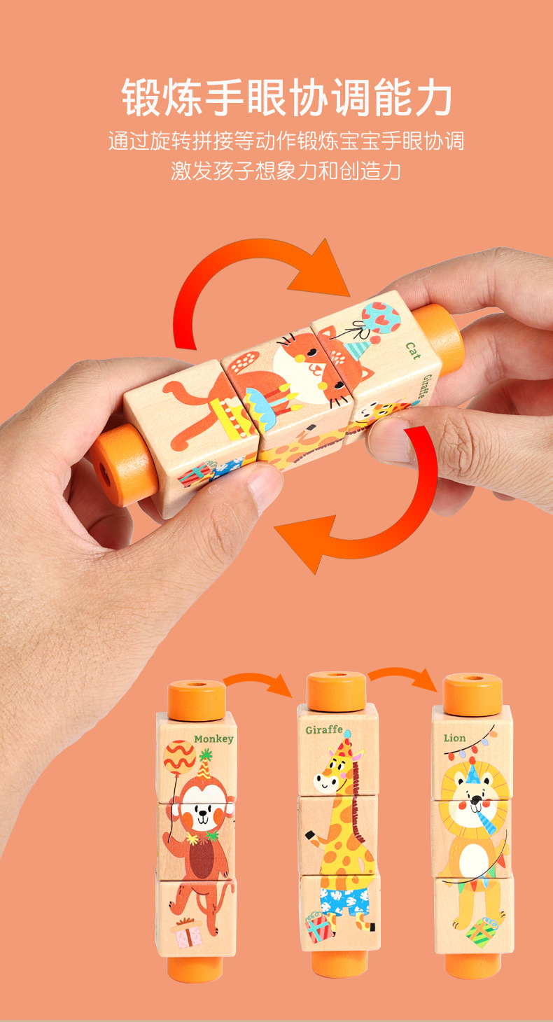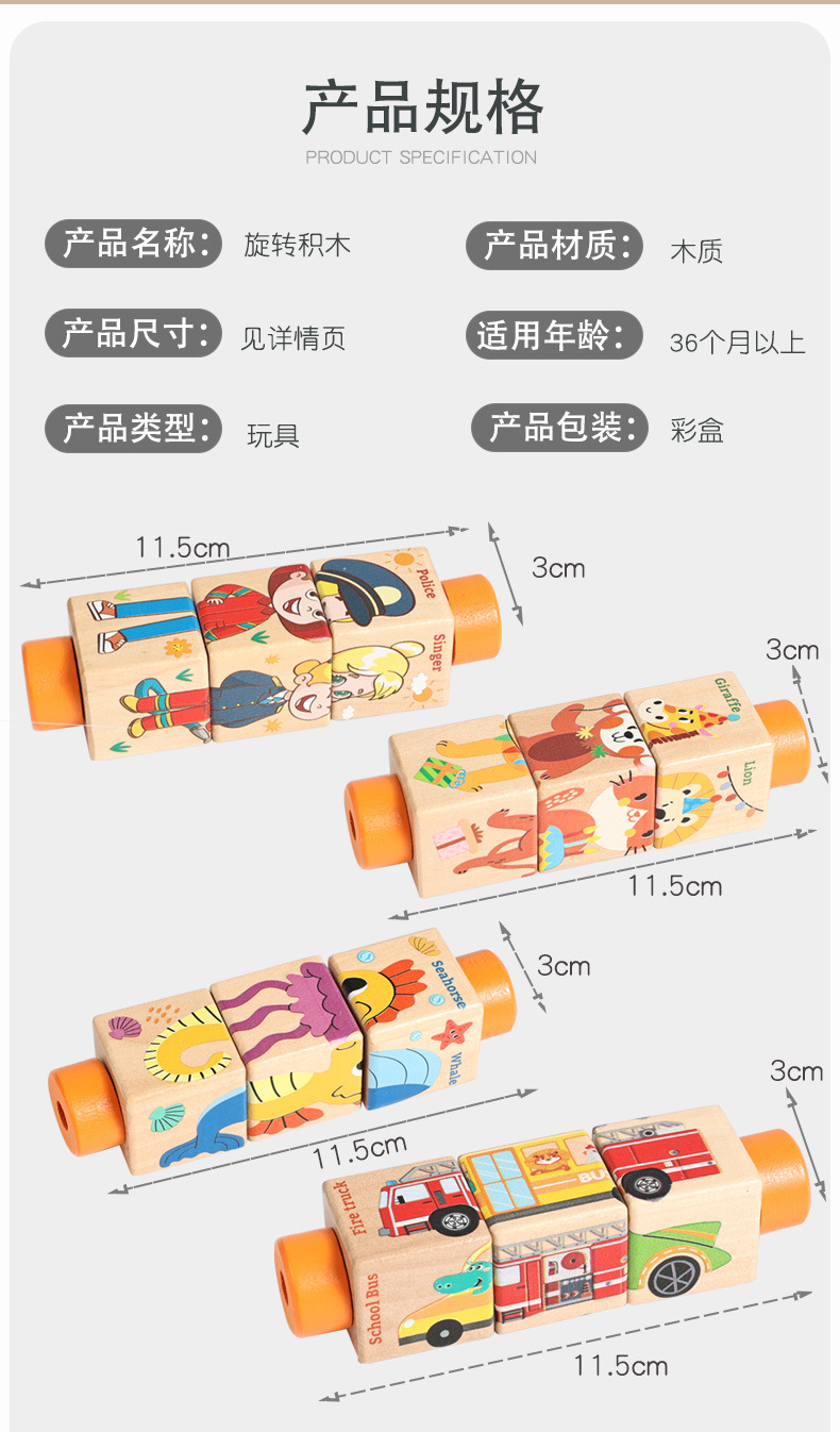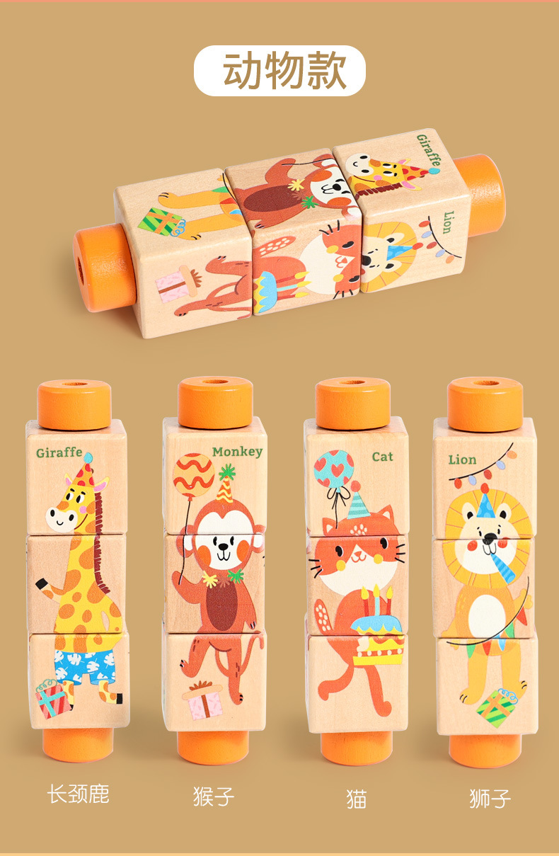 跨境儿童木制旋转积木拼图 婴幼儿早教动物交通启蒙认知拼图玩具