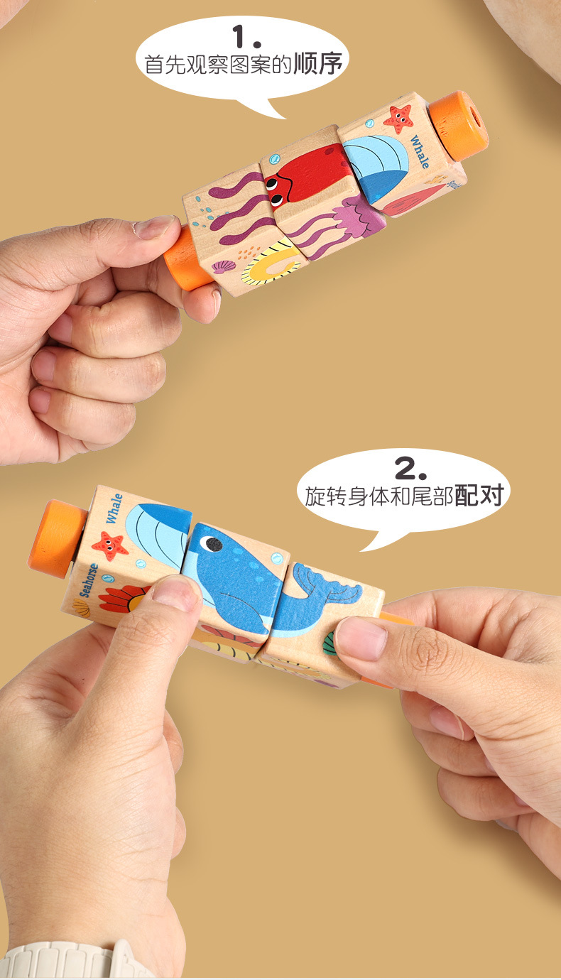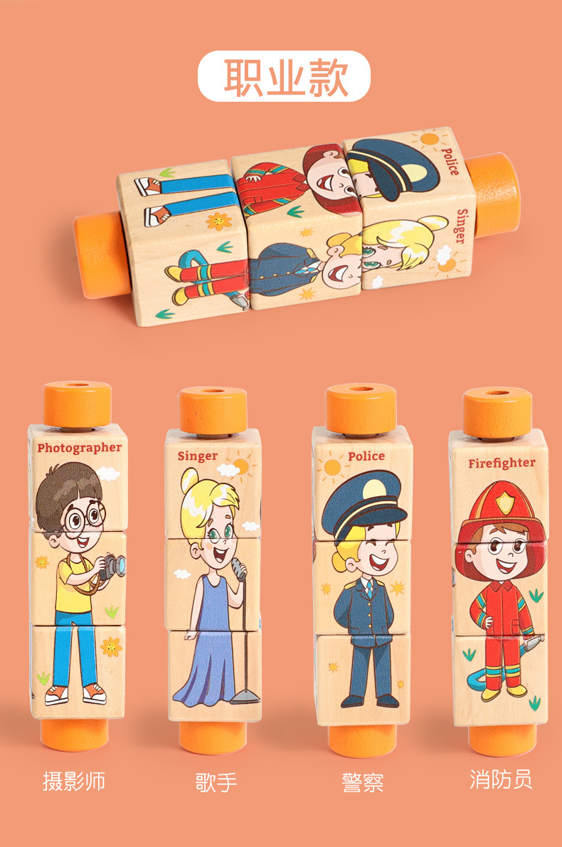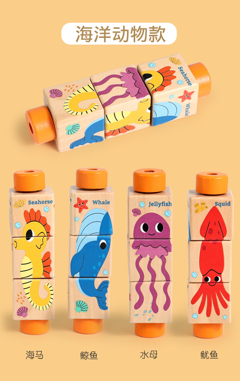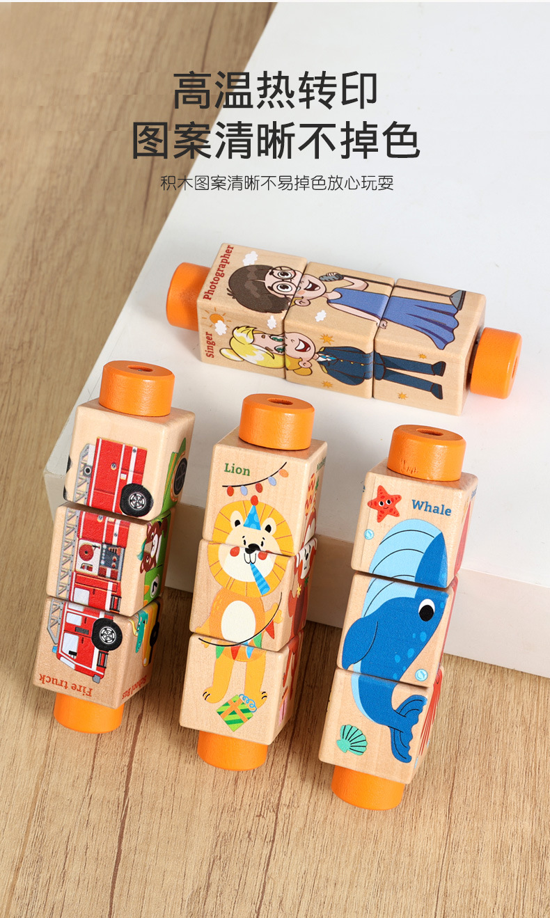 跨境儿童木制旋转积木拼图 婴幼儿早教动物交通启蒙认知拼图玩具