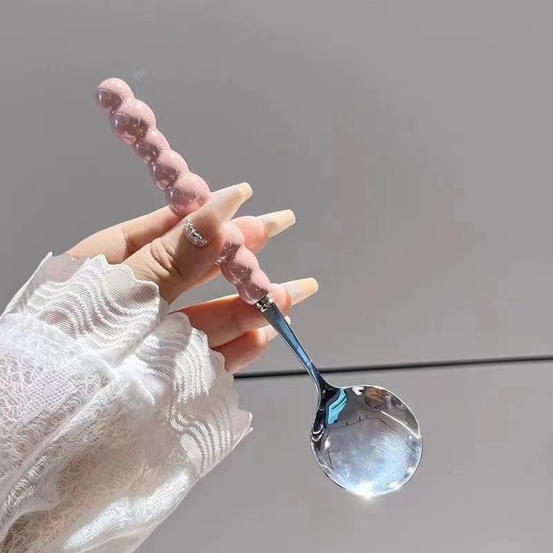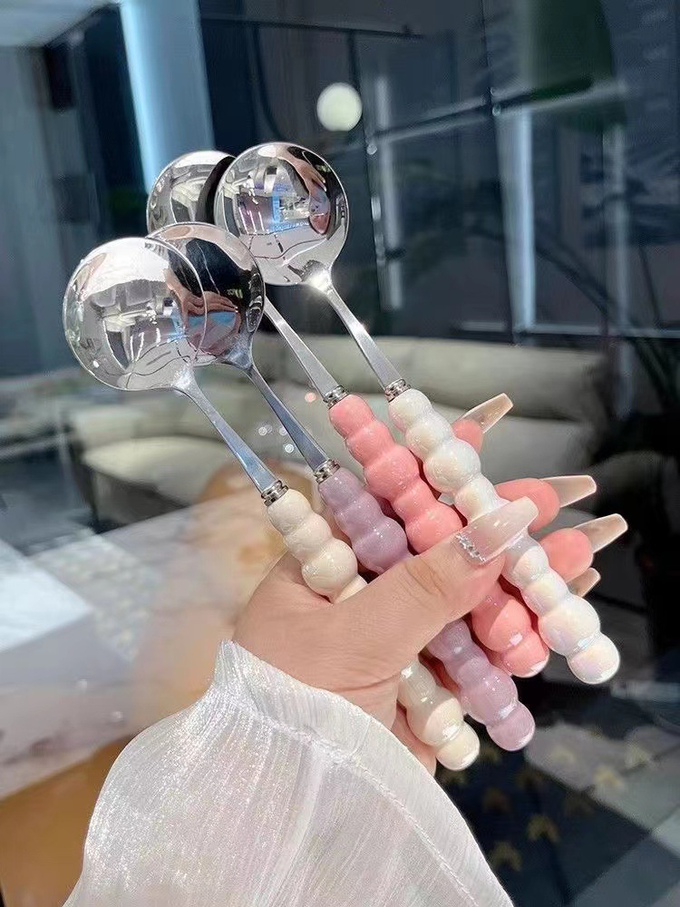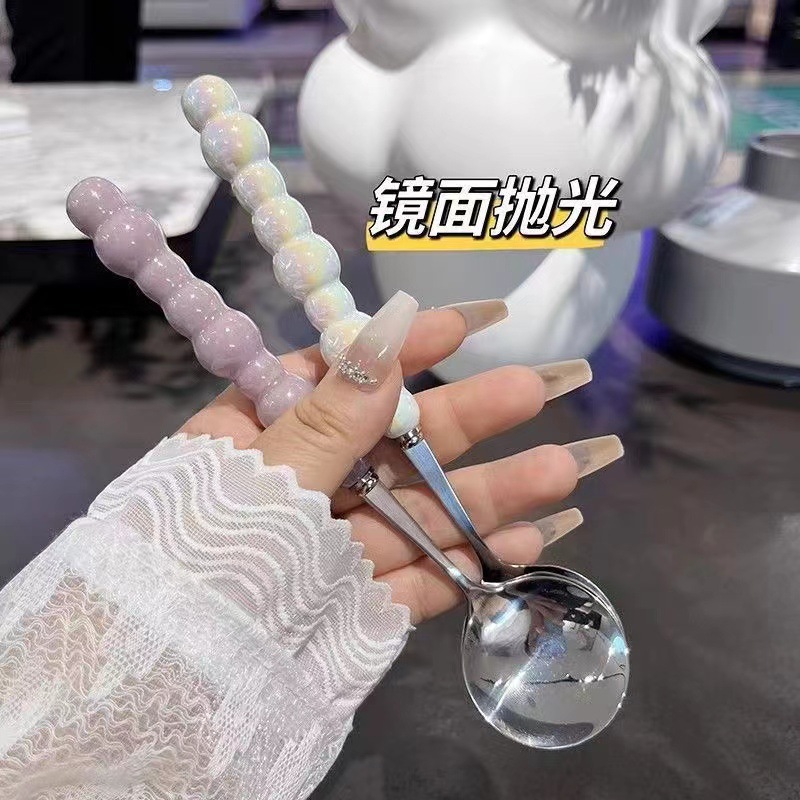 彩色珍珠勺不锈钢勺子塑料手柄餐勺少女心家用调羹小汤勺长柄圆勺