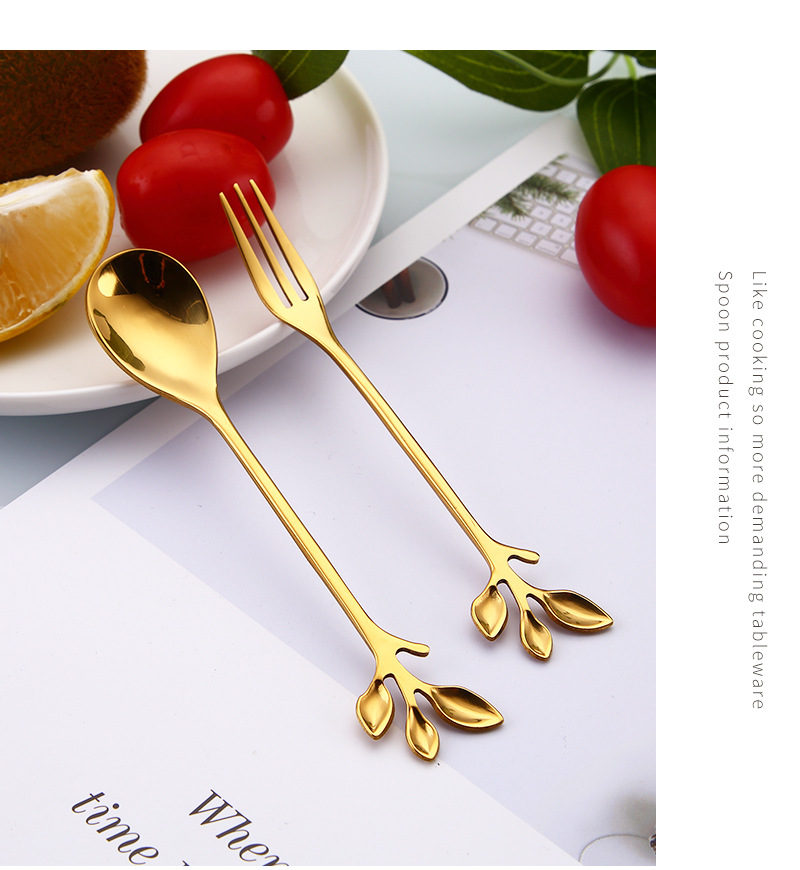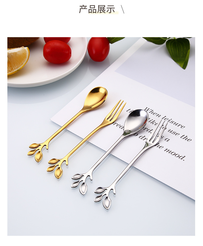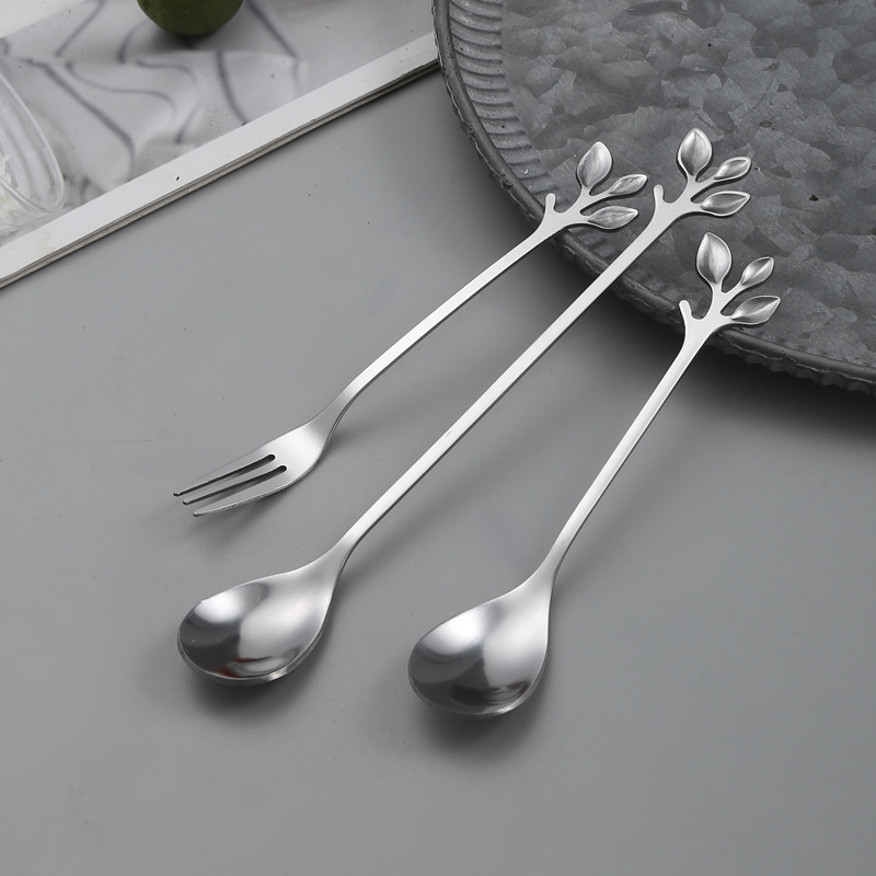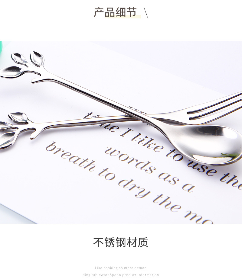 不锈钢创意高颜值树叶勺叉调羹咖啡勺家用餐勺搅拌勺甜品叉子批发