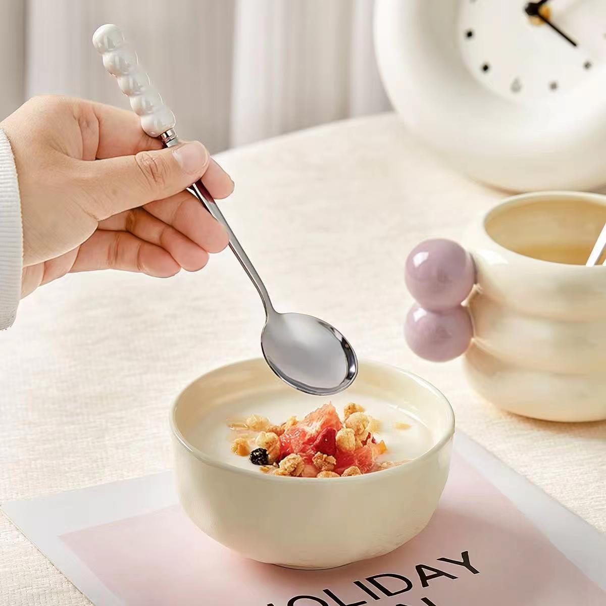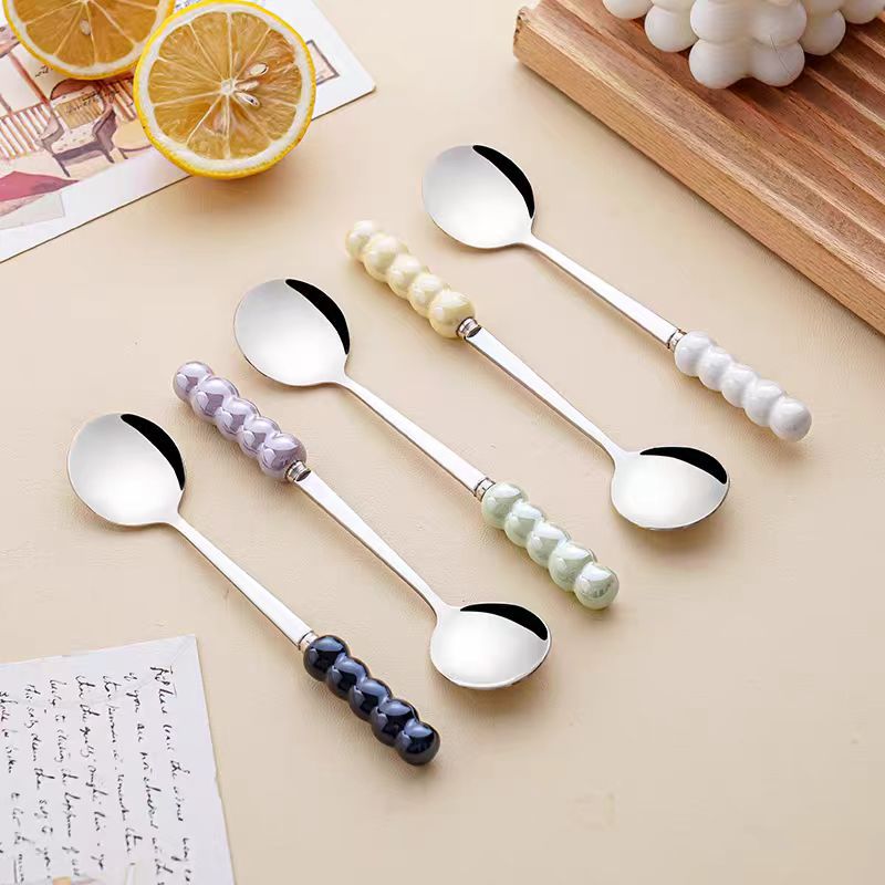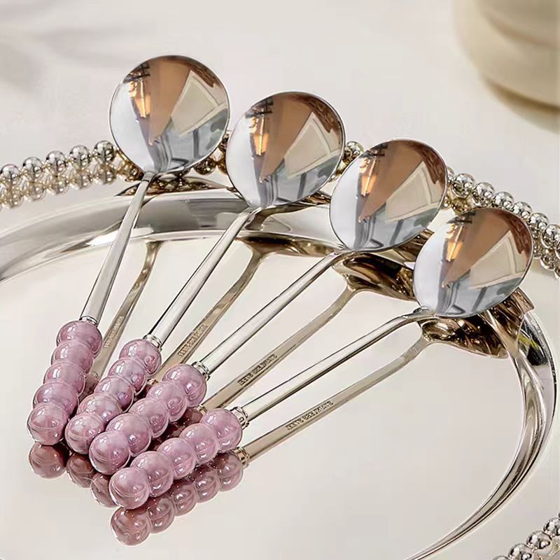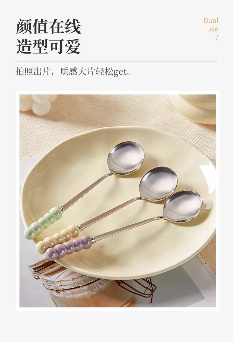 不锈钢勺子高颜值网红勺塑料珍珠手柄家用儿童吃饭勺甜品勺咖啡勺