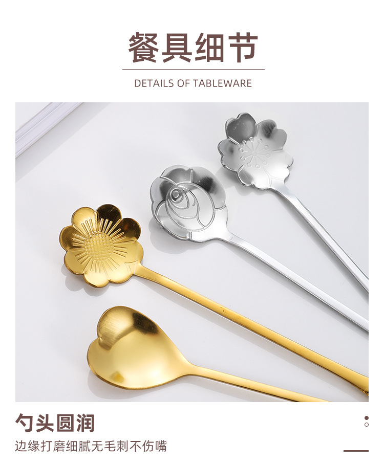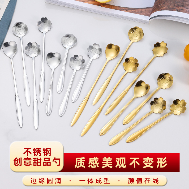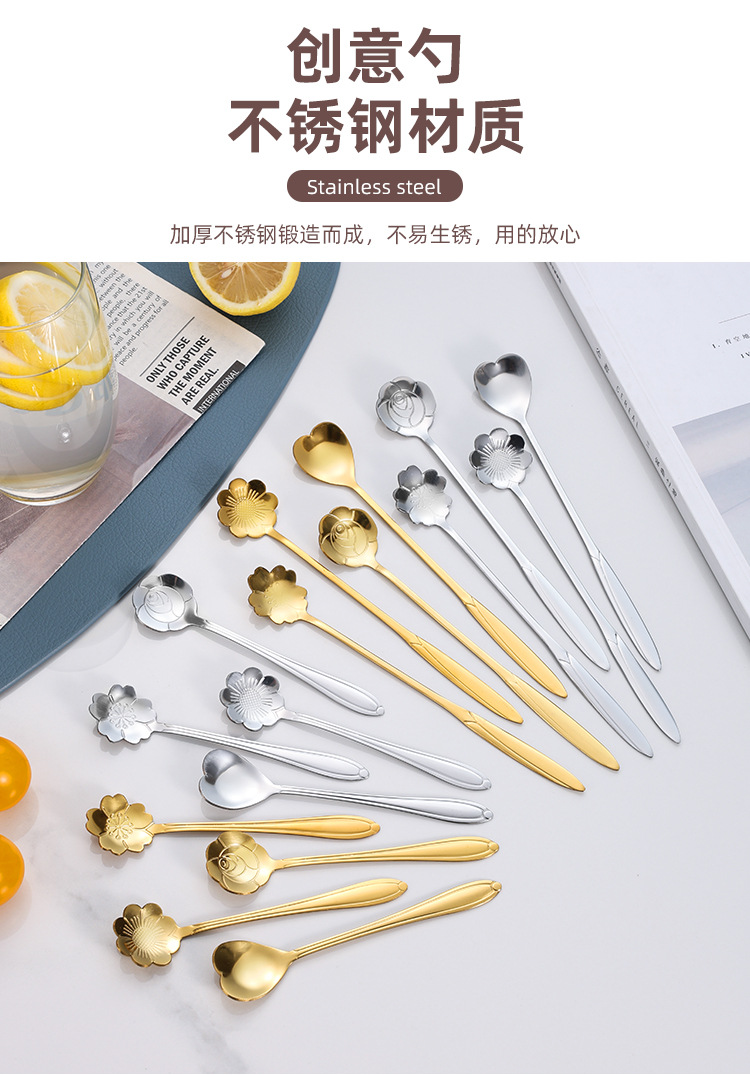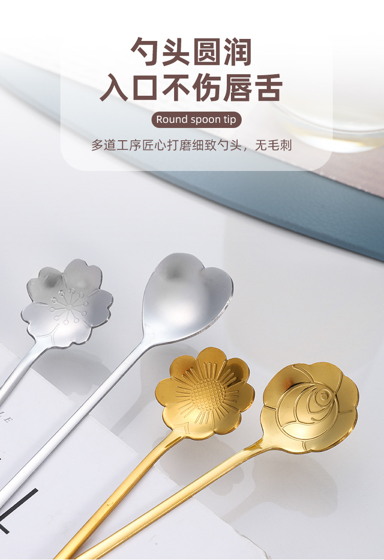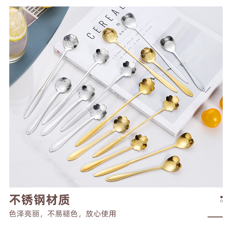 网红金色不锈钢樱花勺长柄搅拌勺日式玫瑰爱心花朵花瓣勺咖啡勺子