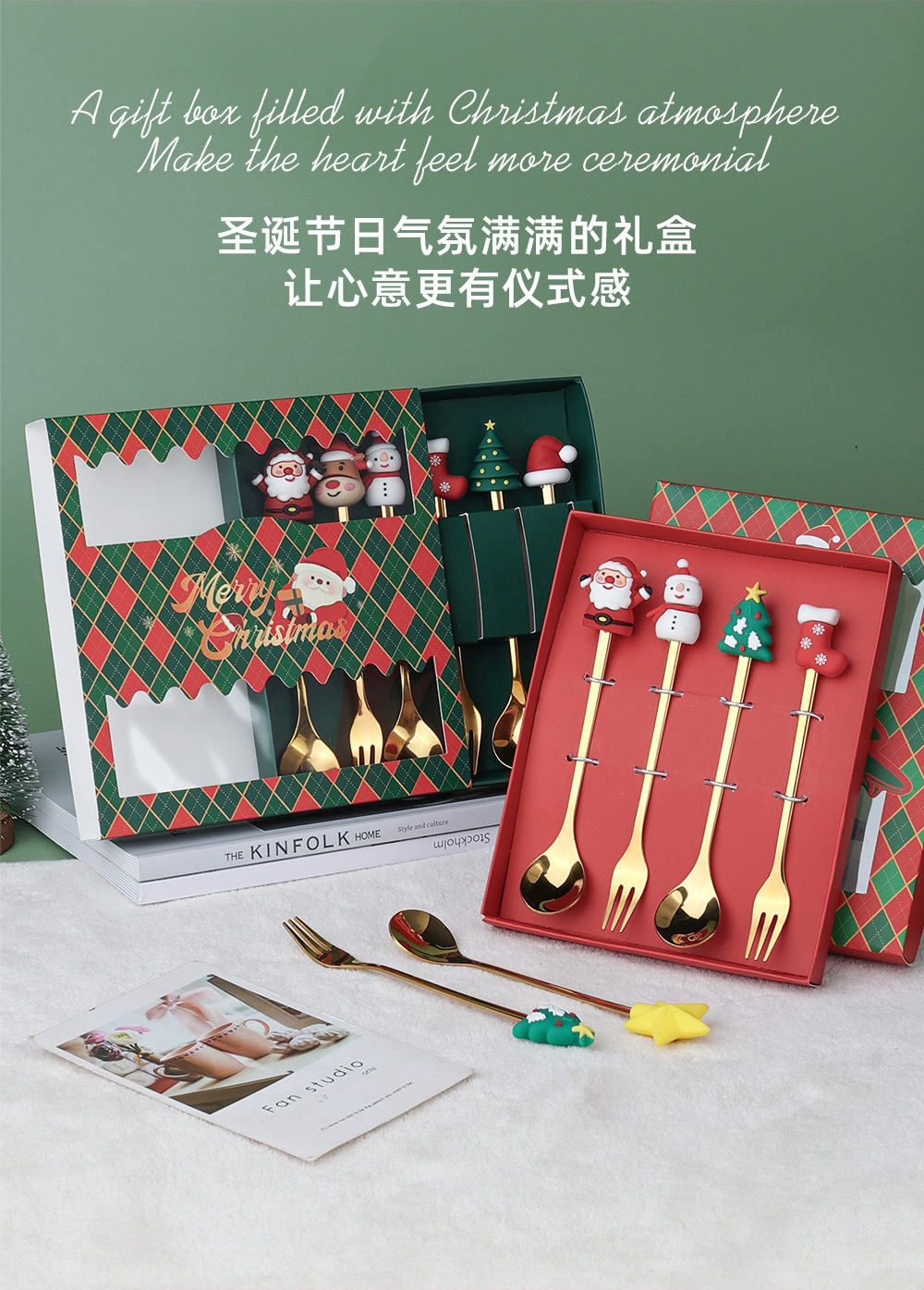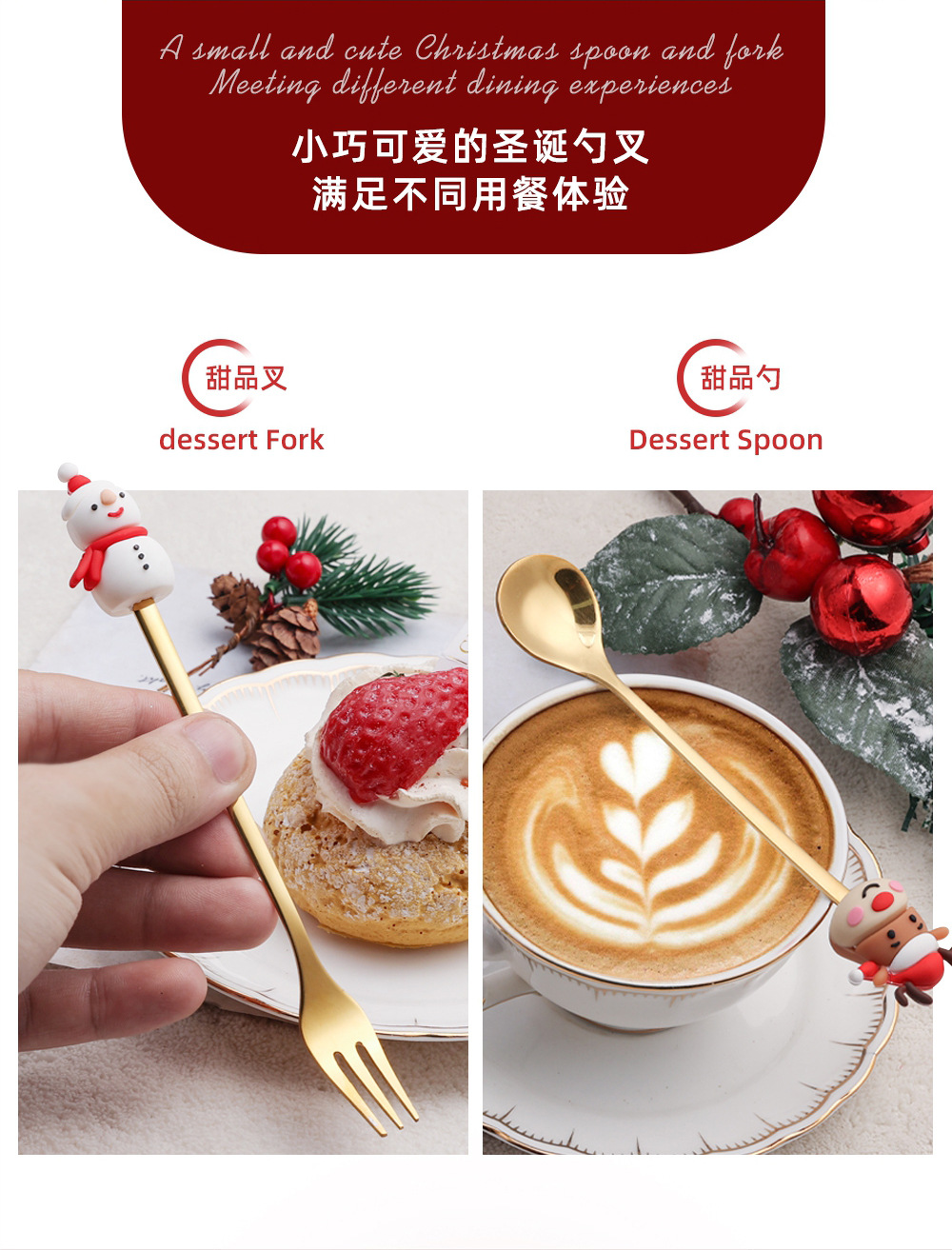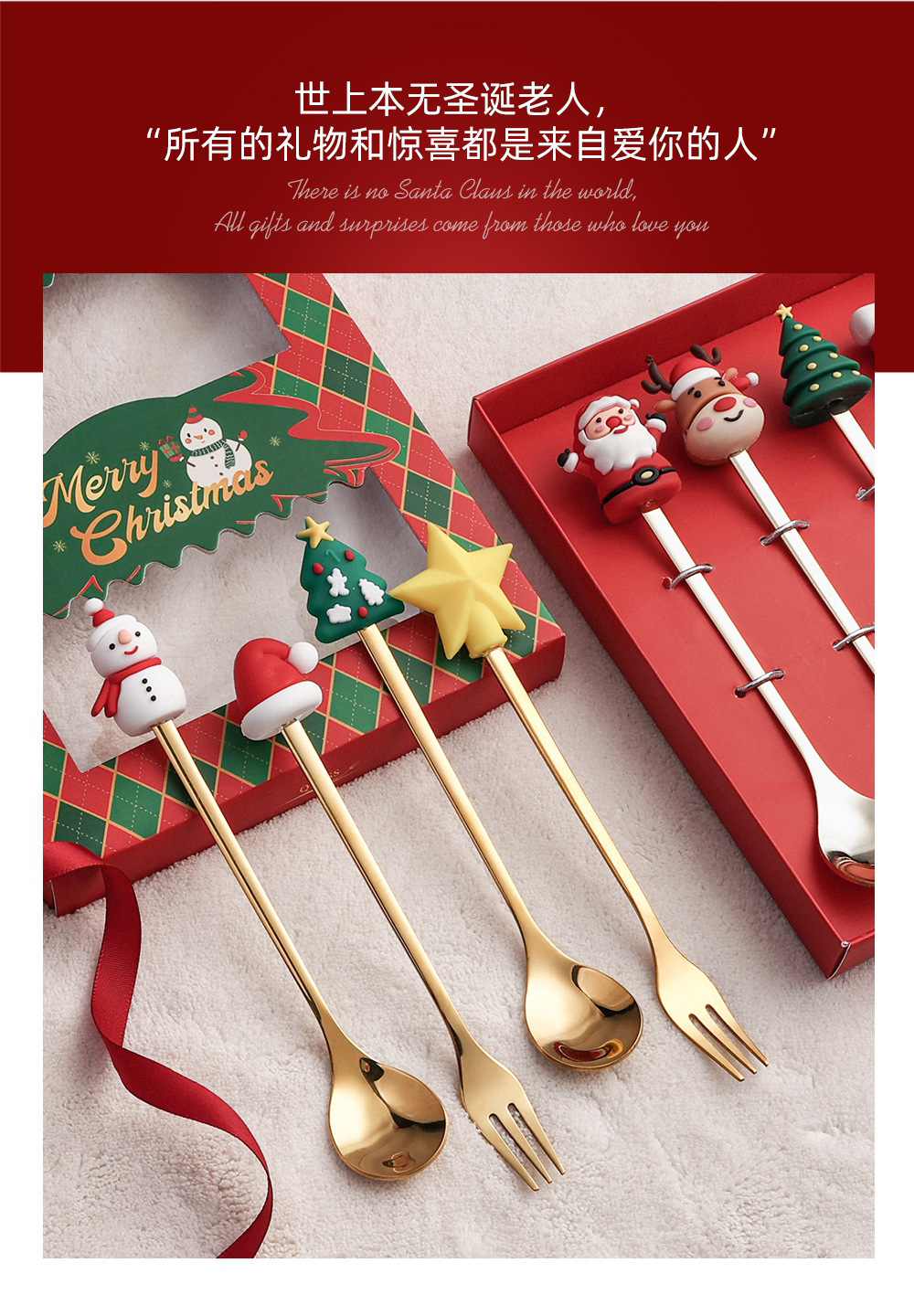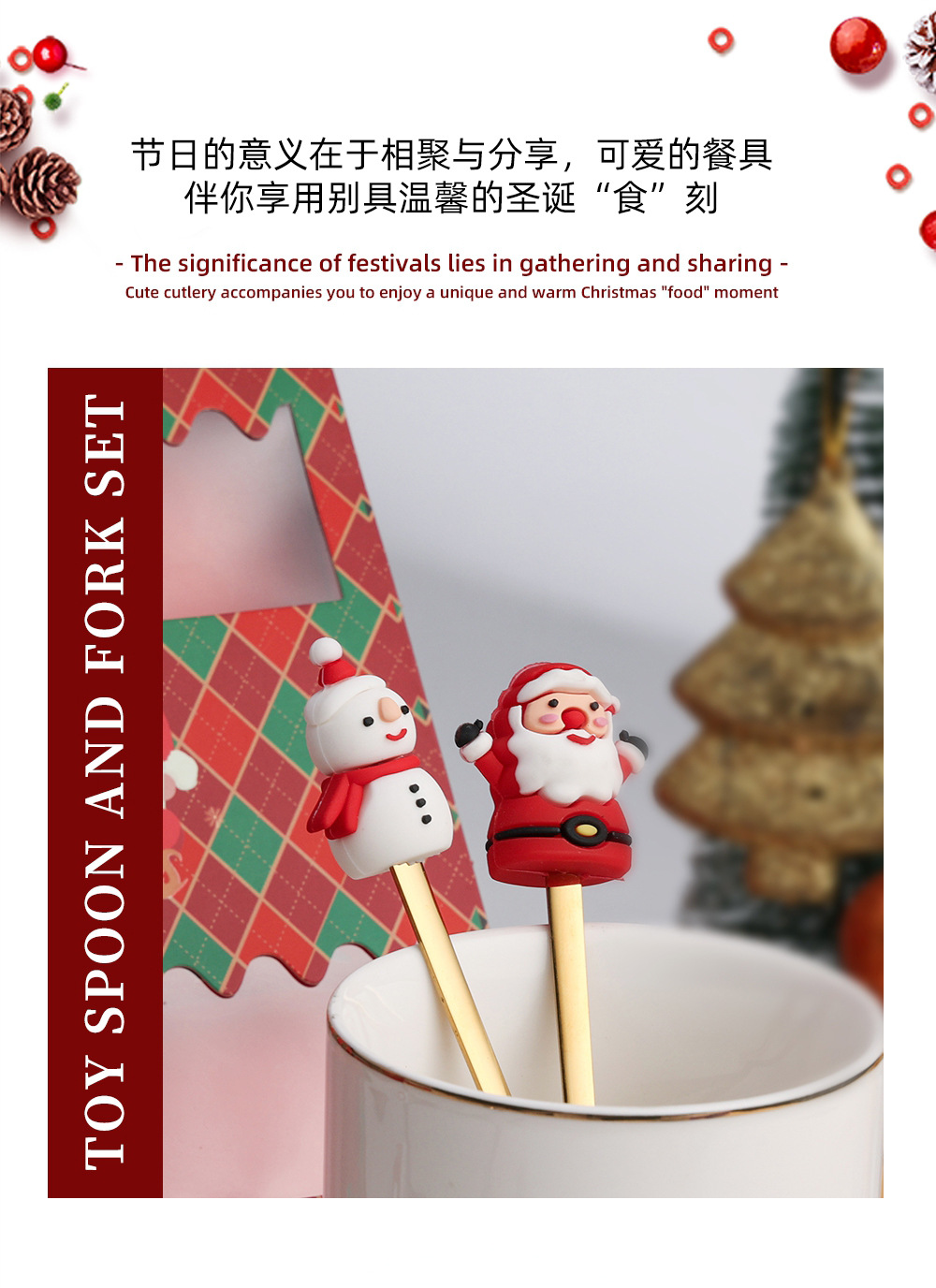 跨境可爱圣诞勺子套装 咖啡勺创意搅拌勺叉圣诞礼盒餐具 甜品叉