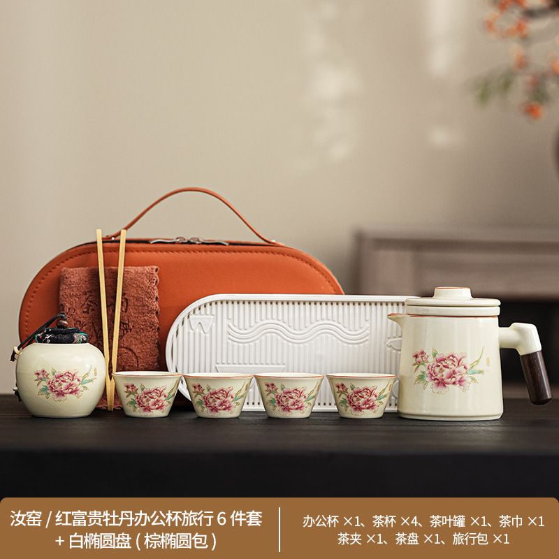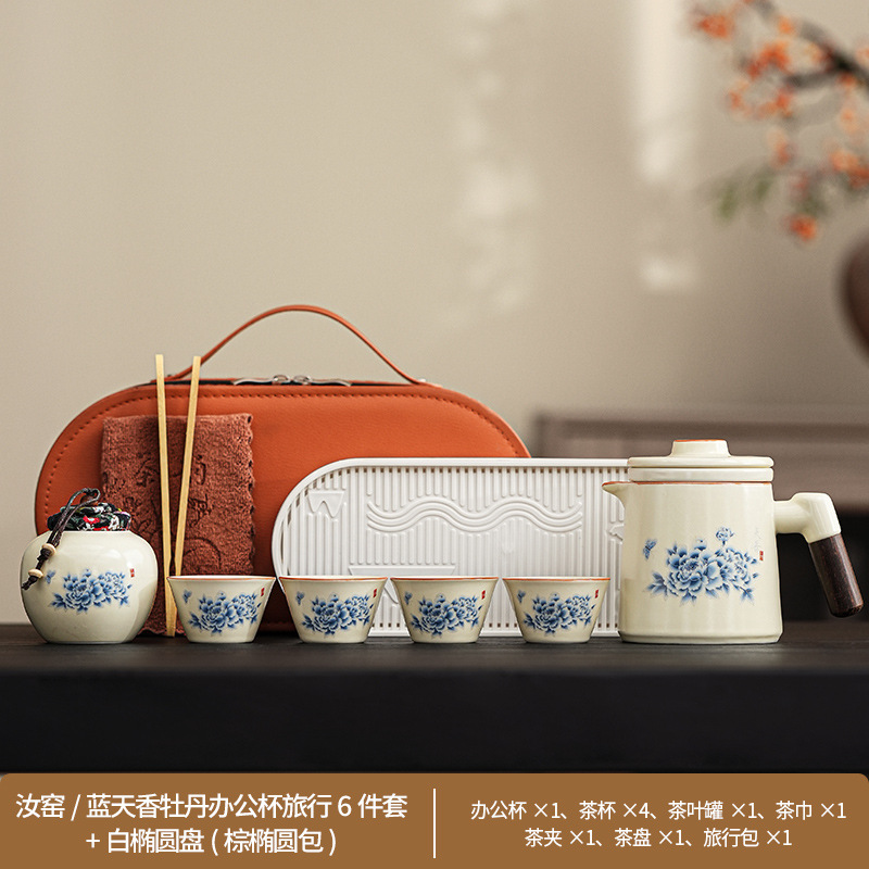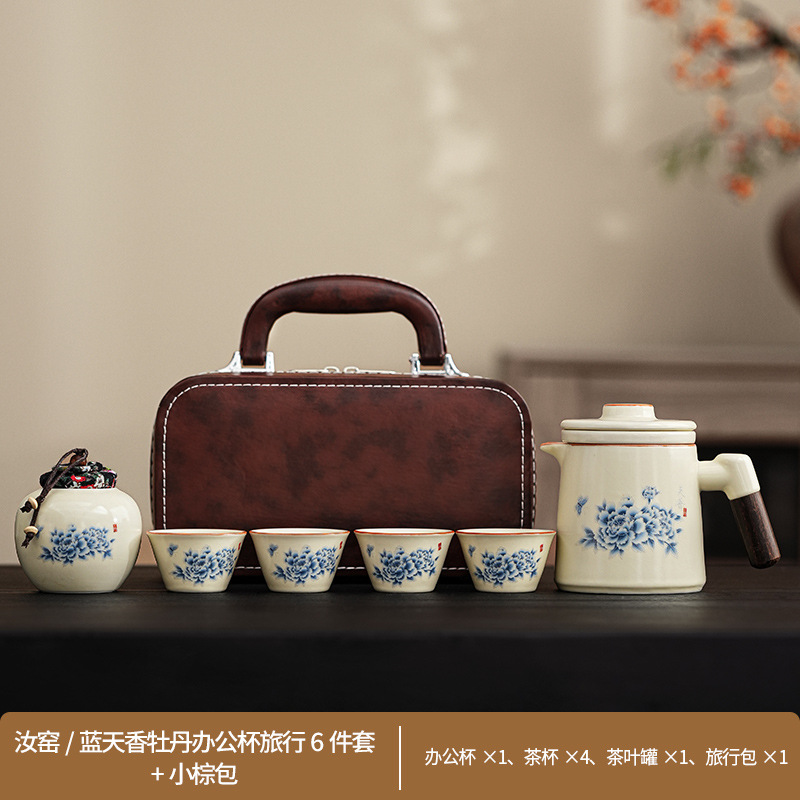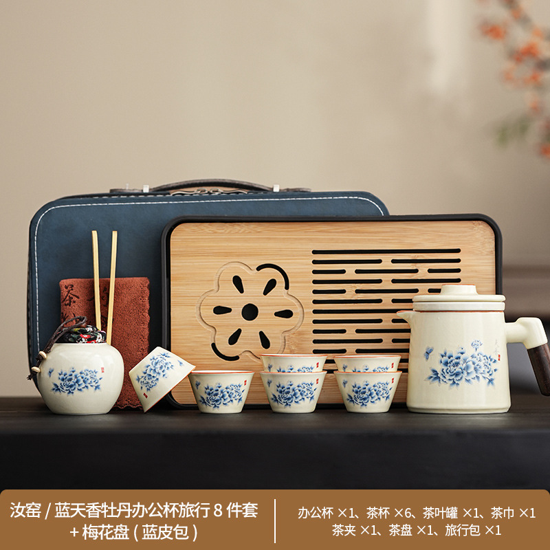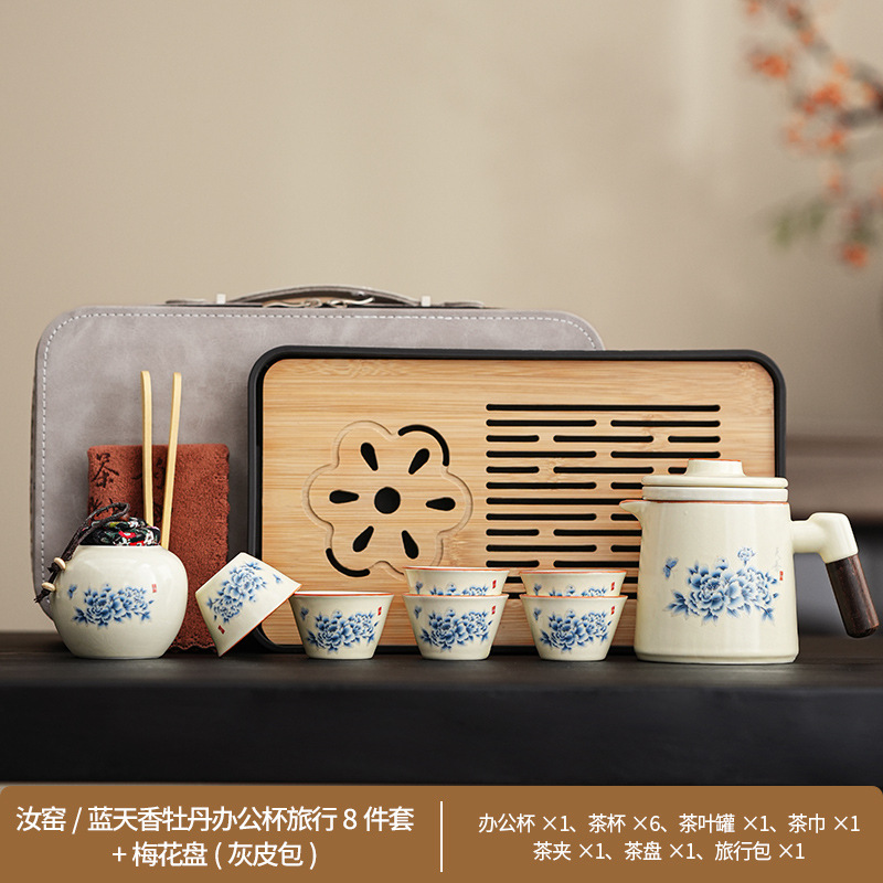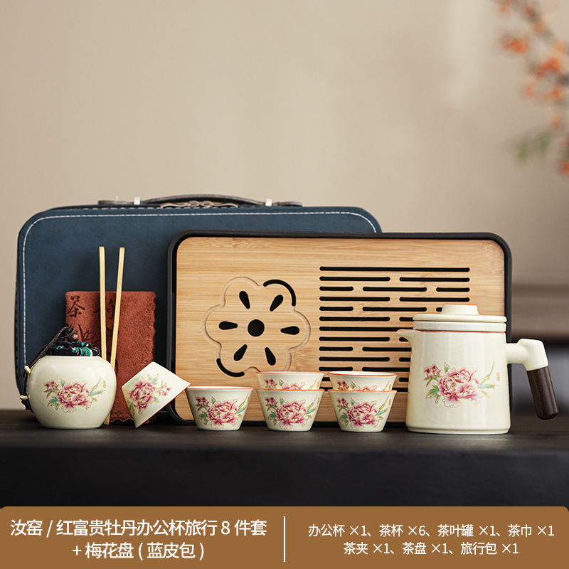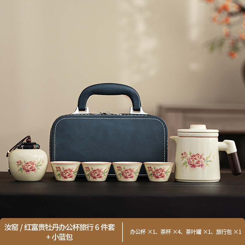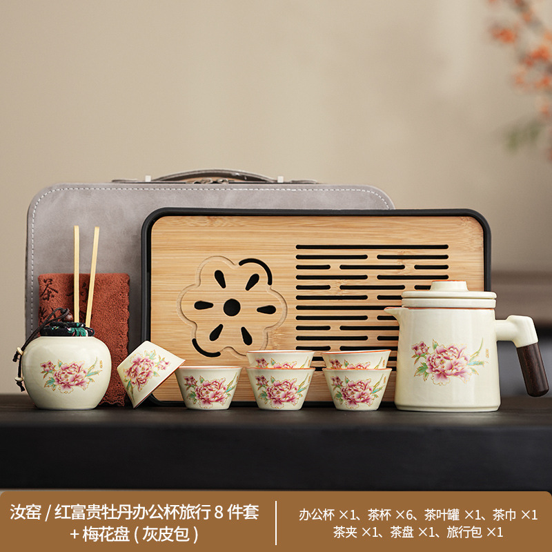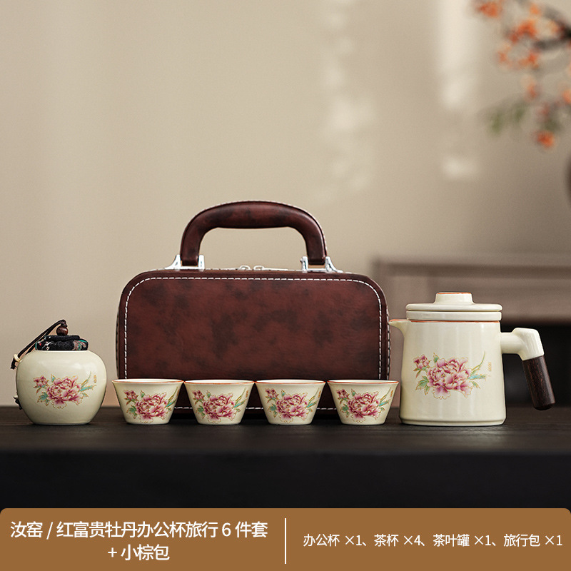 高级汝窑套装商务礼品牡丹办公泡茶壶可携带皮包茶器定印开业礼品