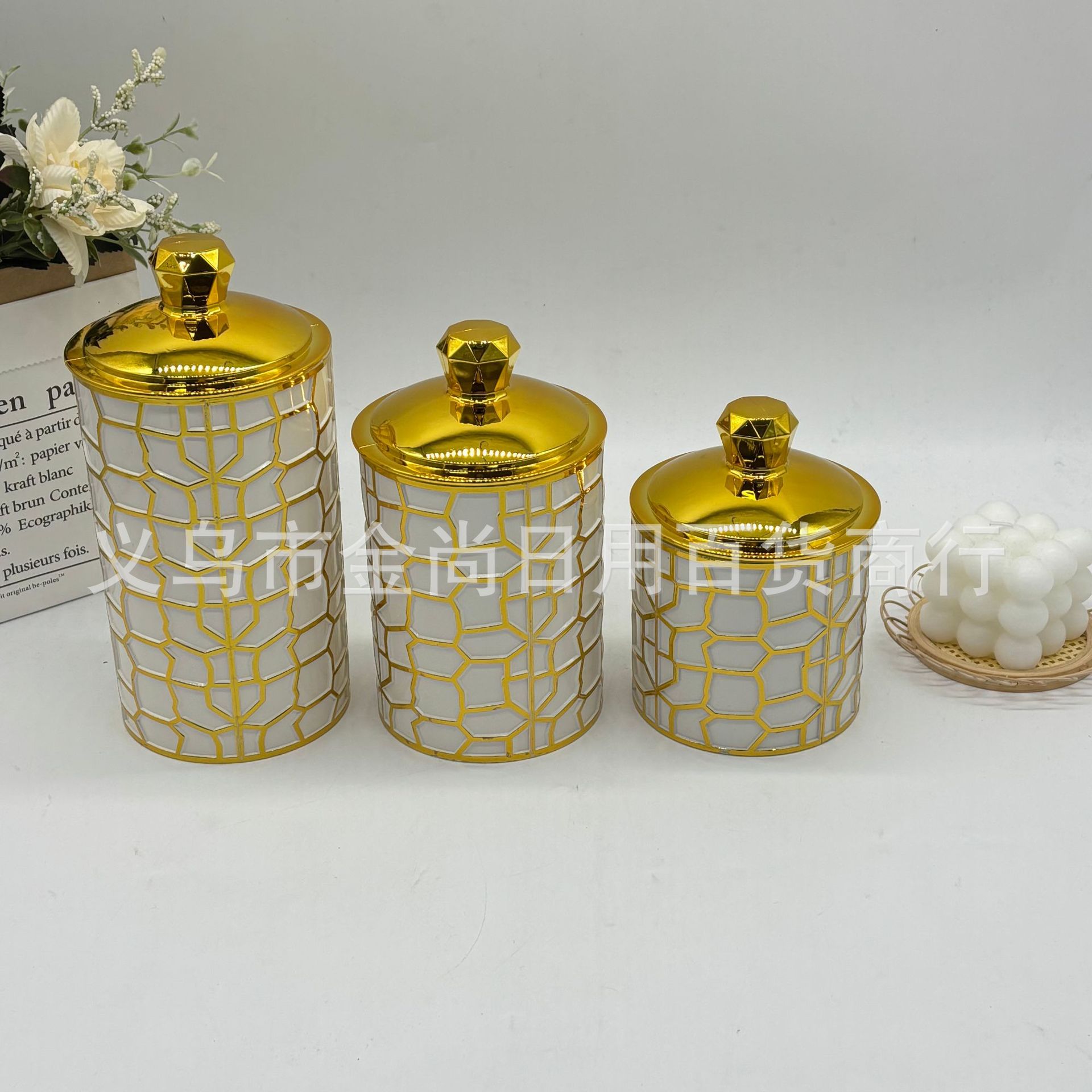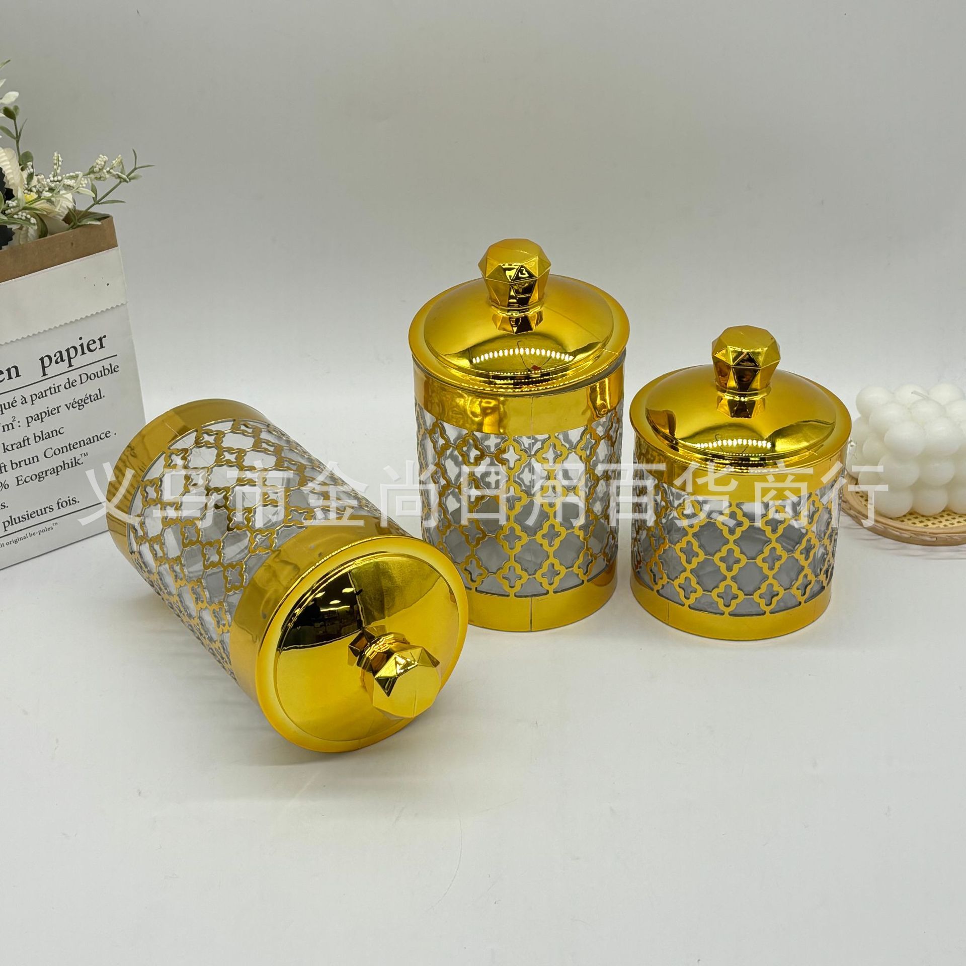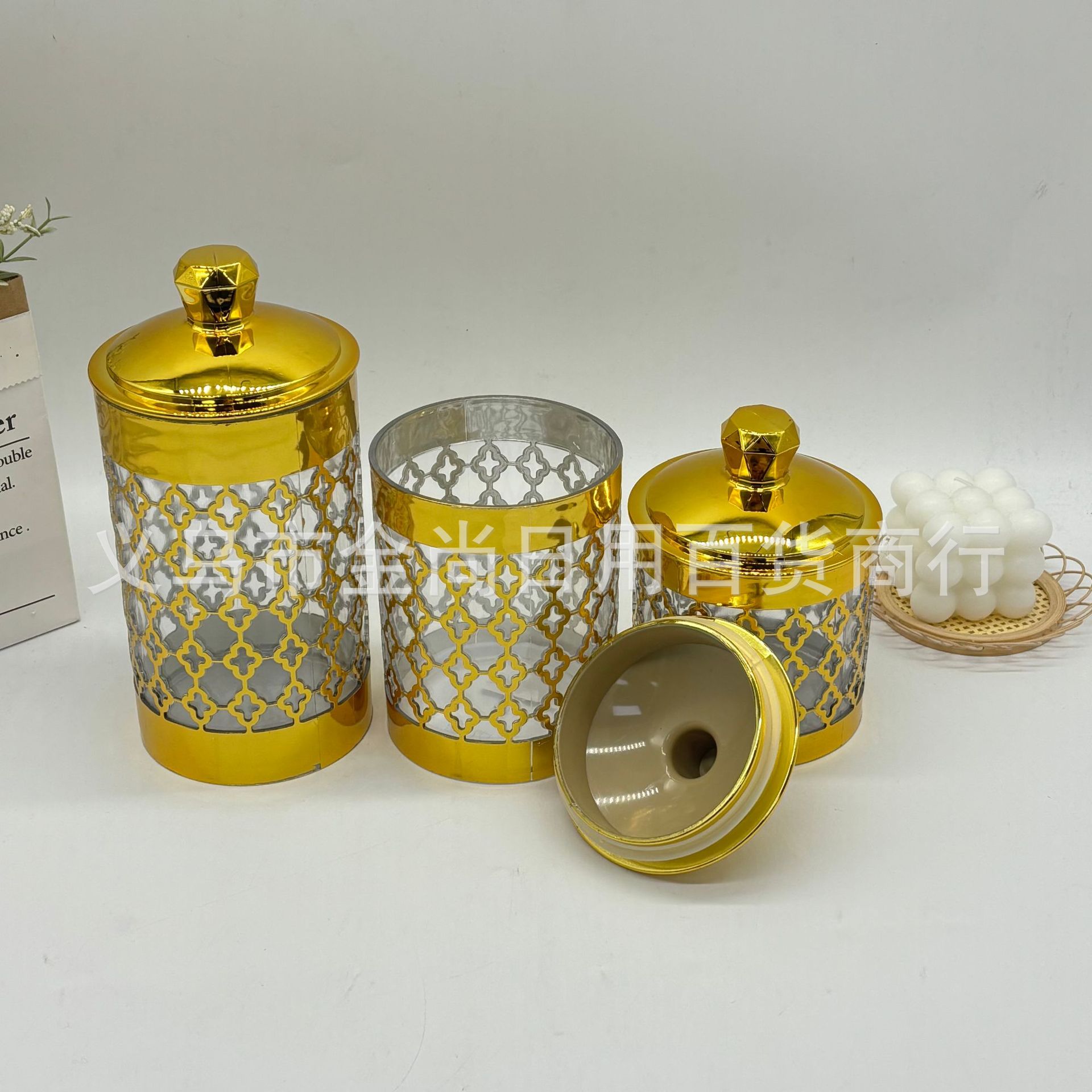 跨境新款砖石头四叶草塑料密封罐三件套轻奢装饰摆件烫金密封罐