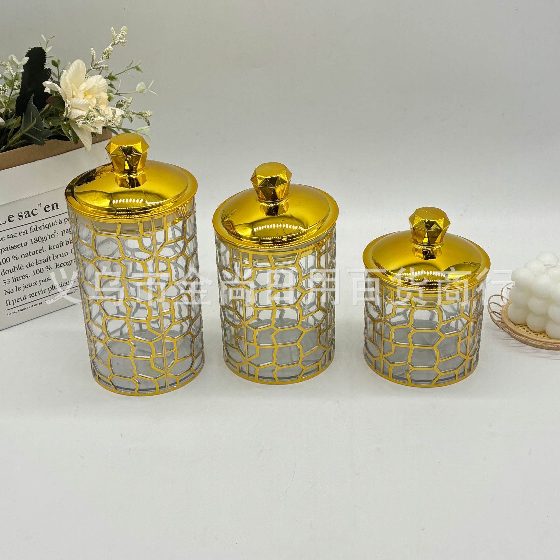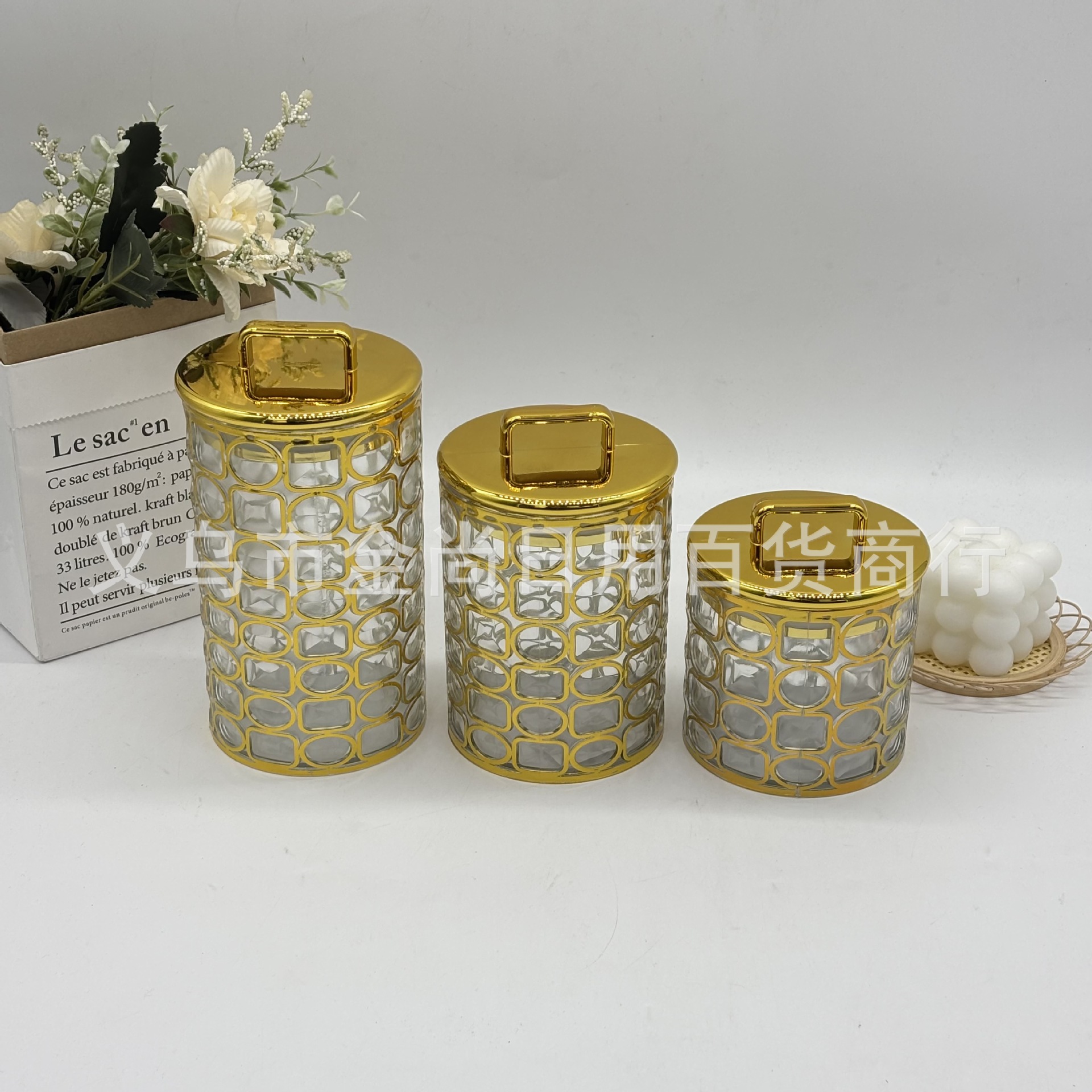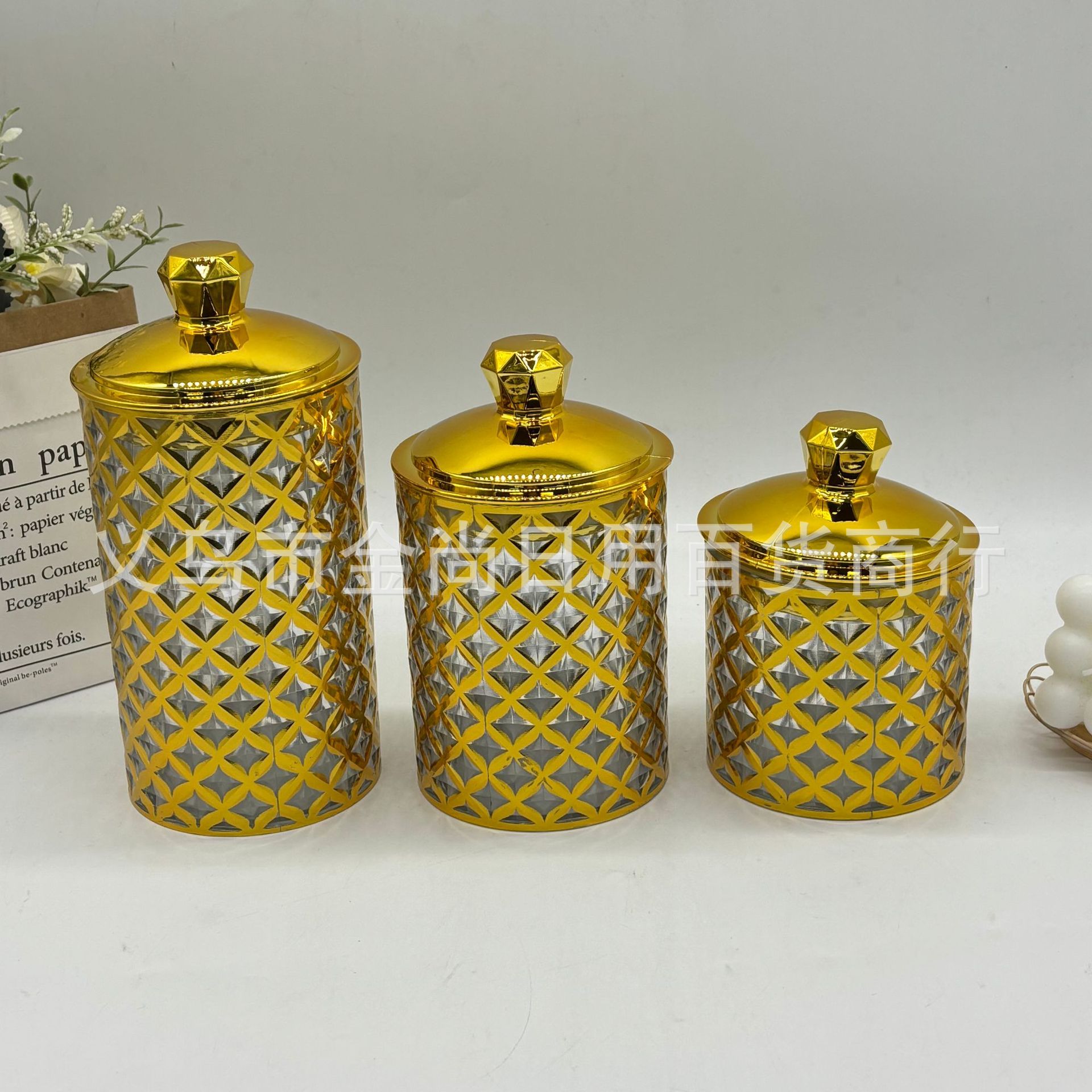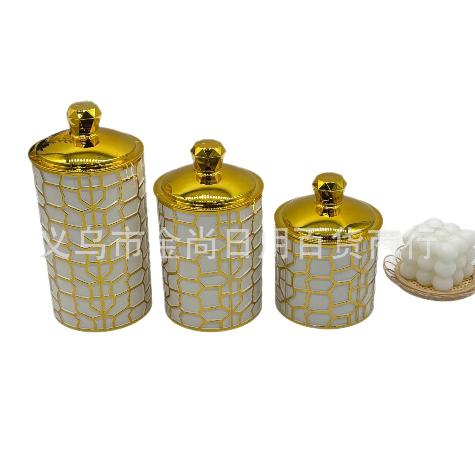 跨境新款砖石头四叶草塑料密封罐三件套轻奢装饰摆件烫金密封罐