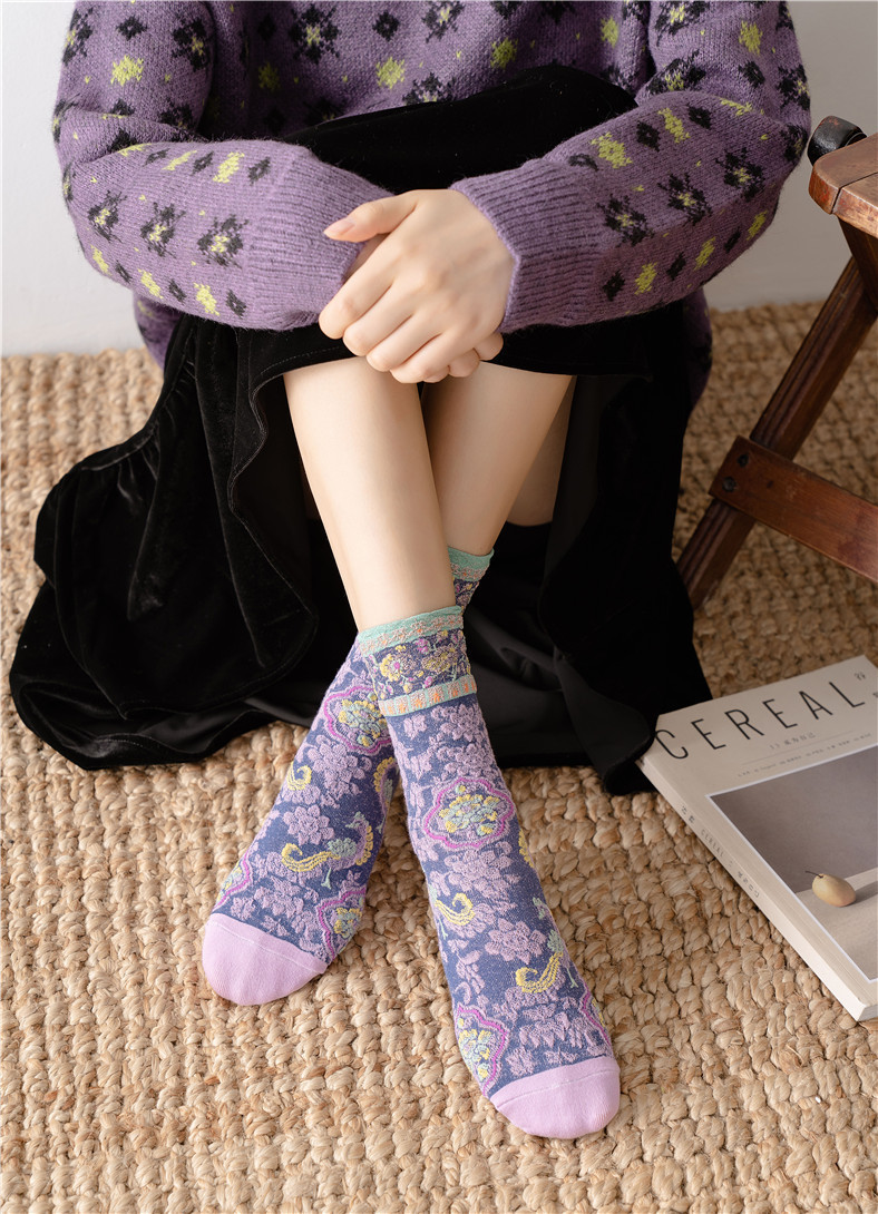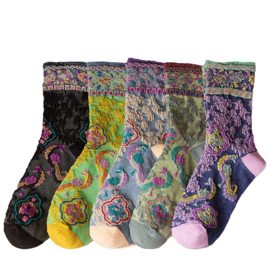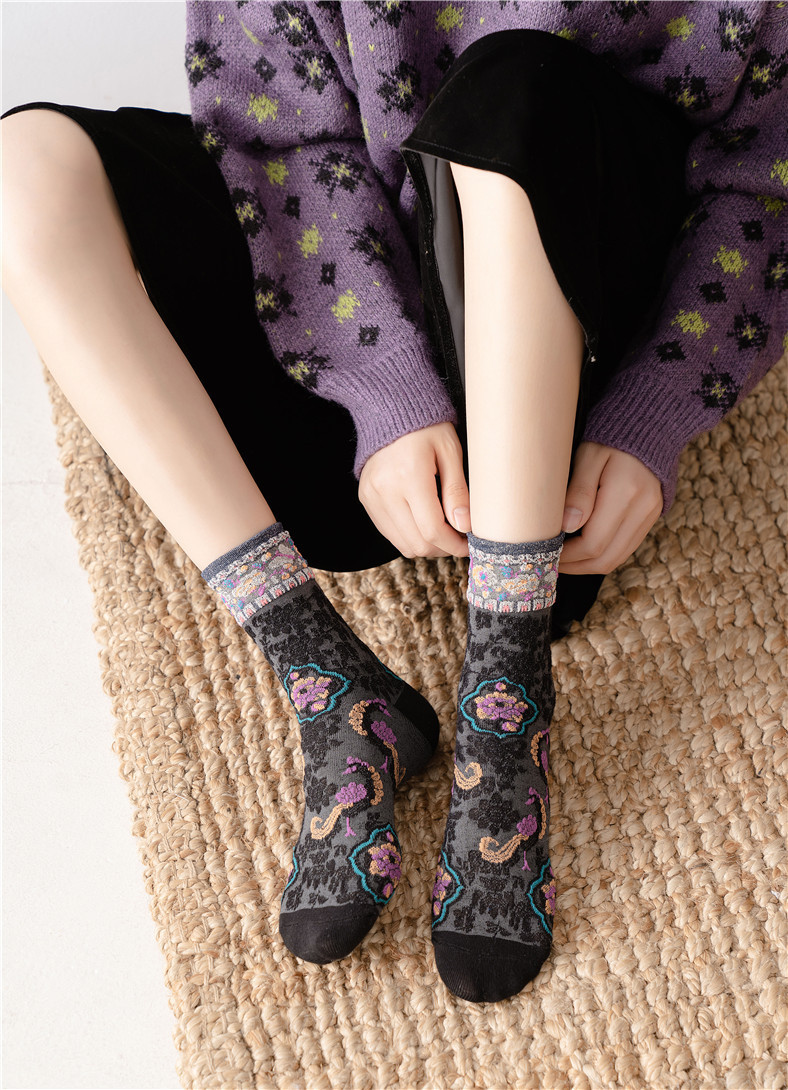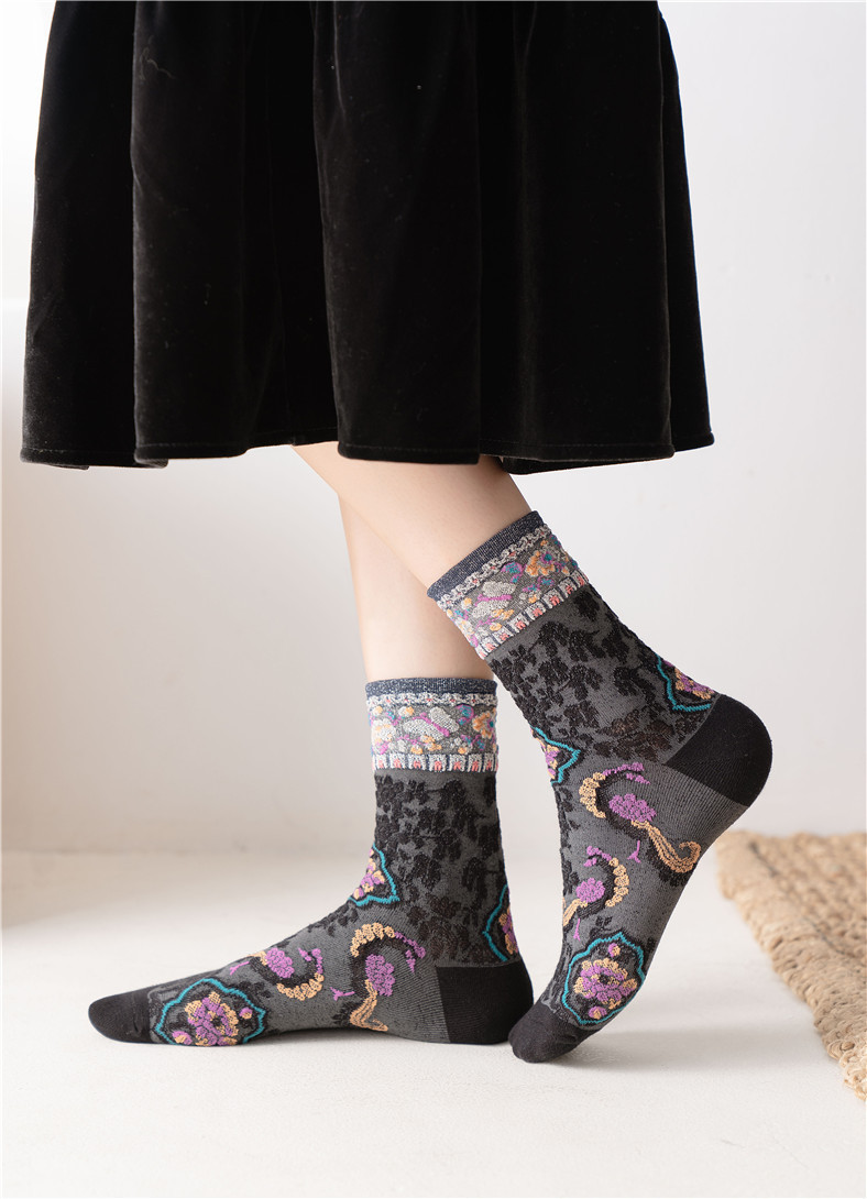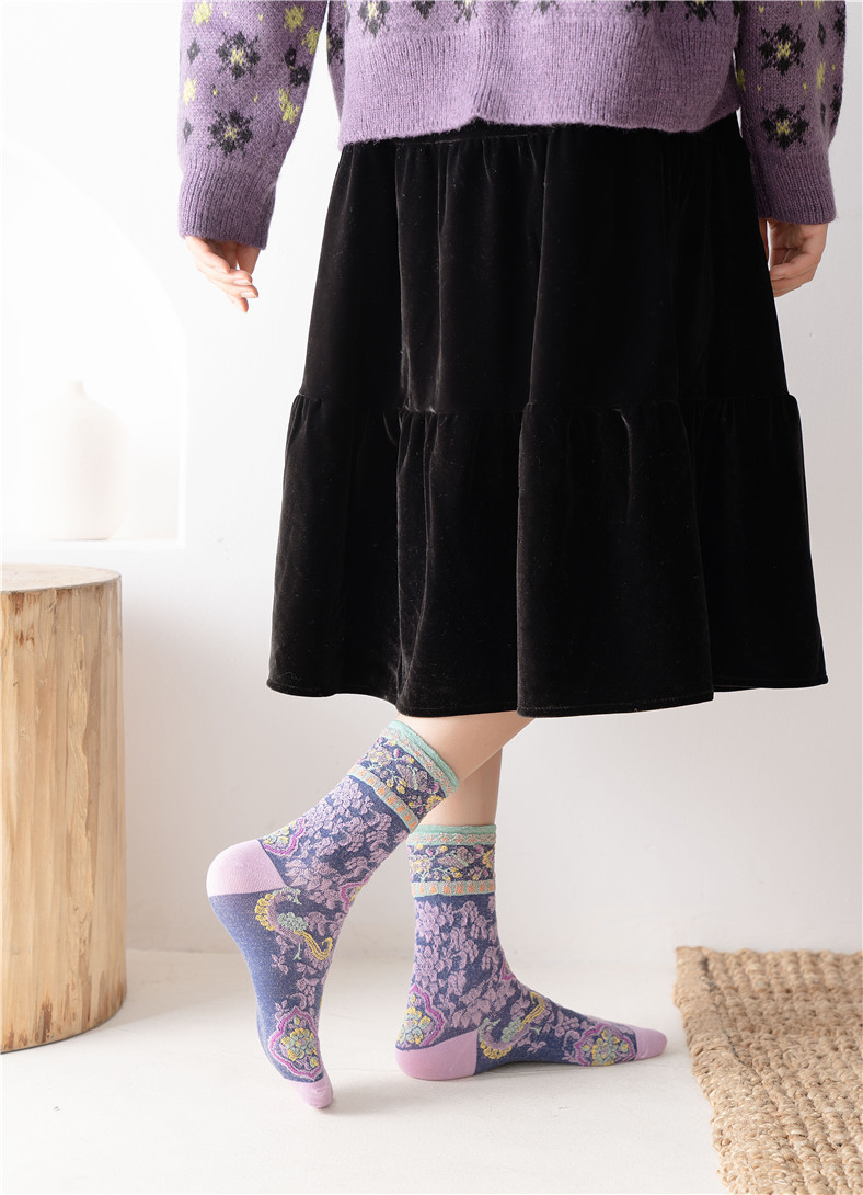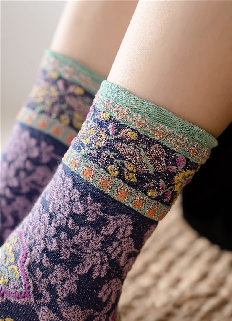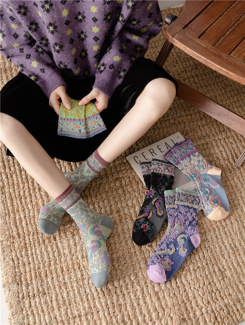秋季新款亮丝复古花纹中筒女袜棉ins日系时尚泡泡罗口堆堆袜子