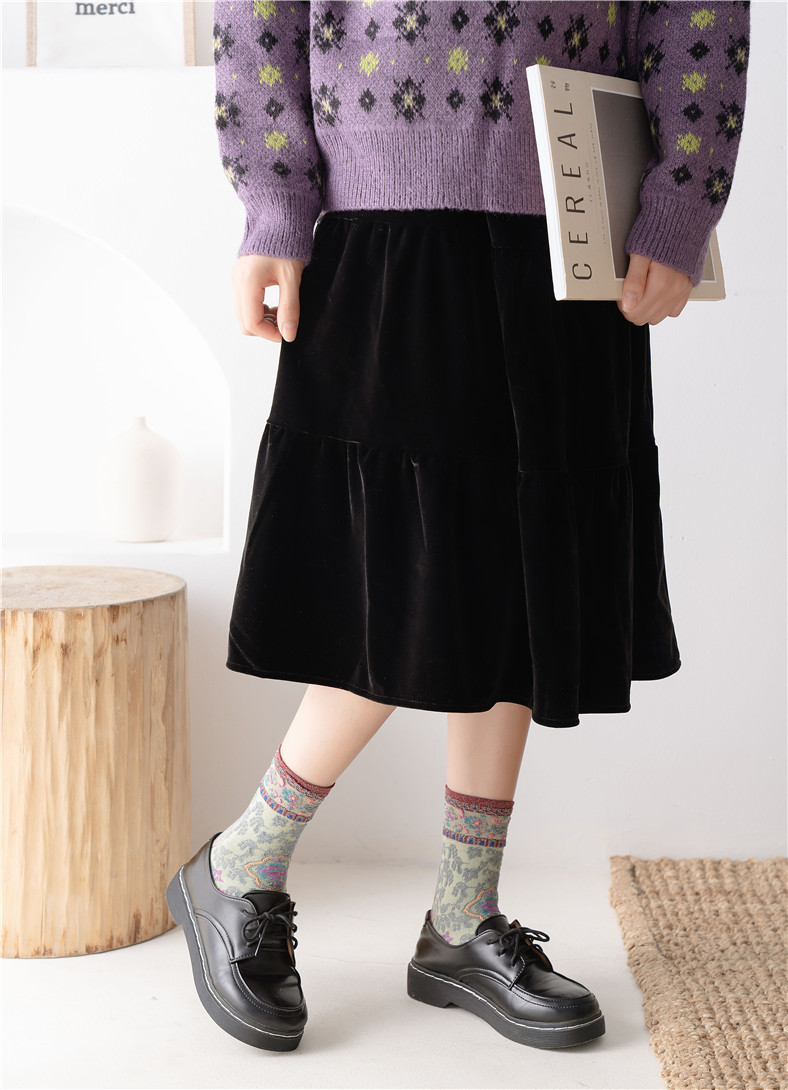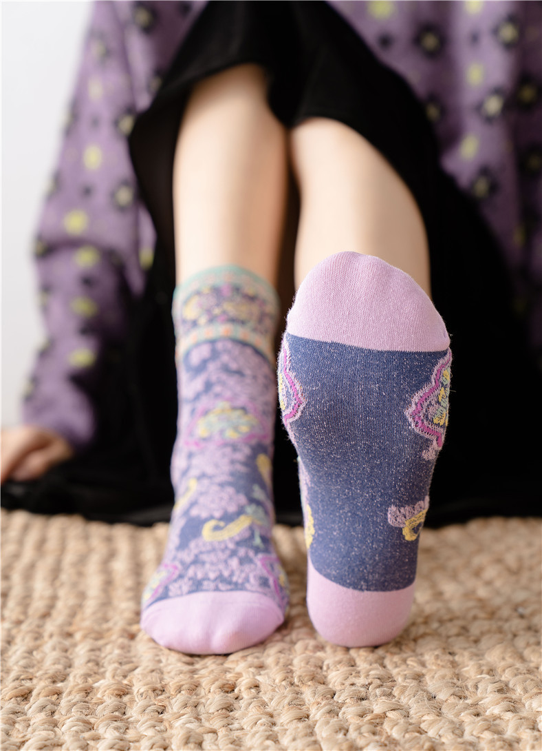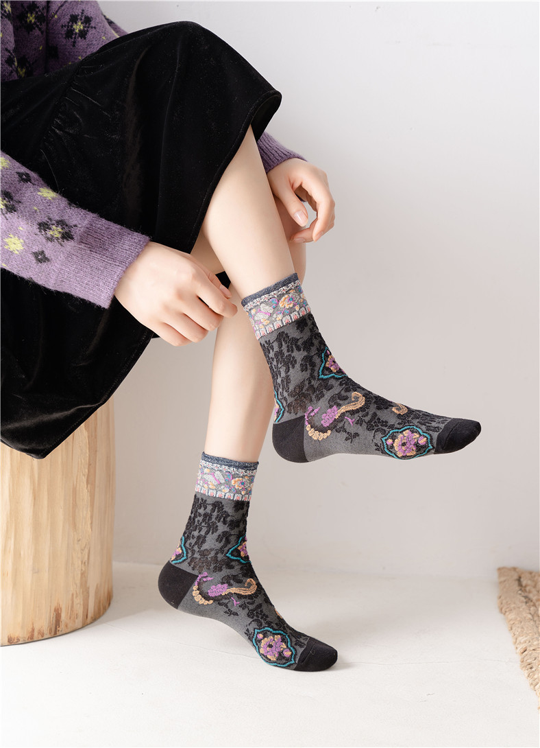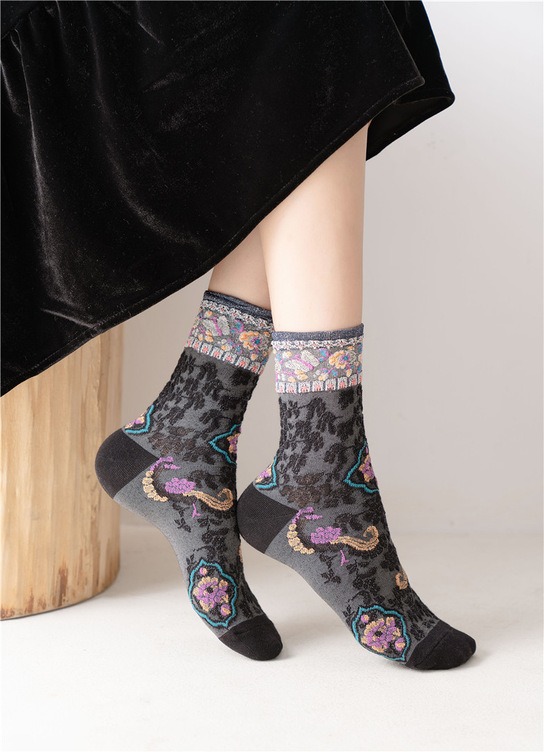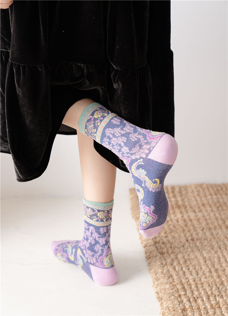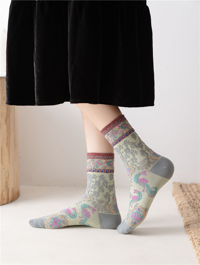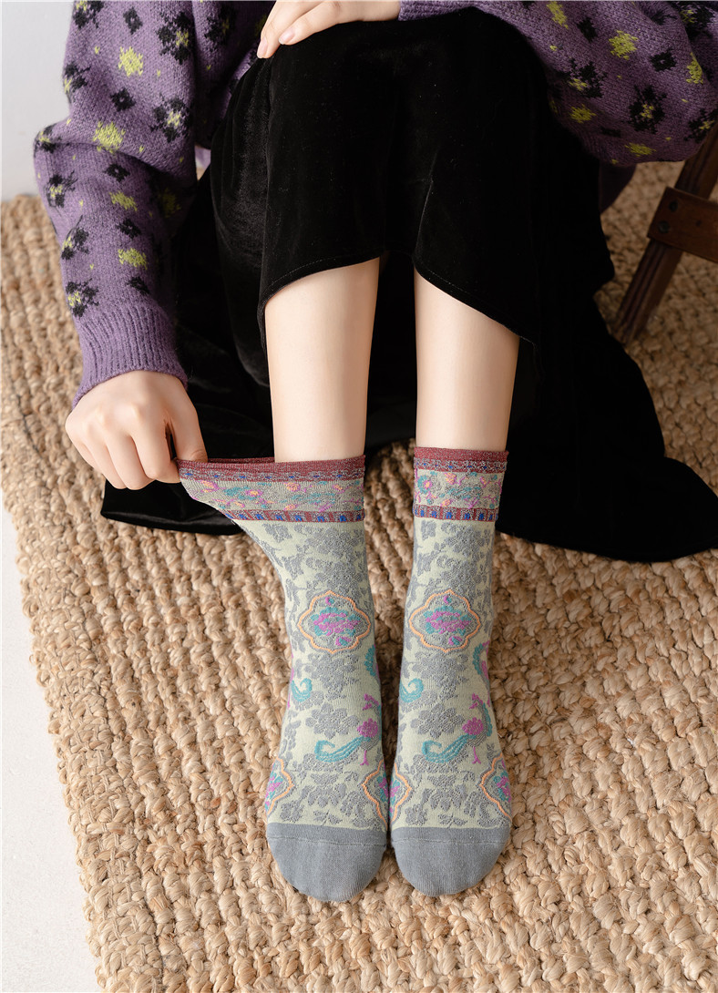 秋季新款亮丝复古花纹中筒女袜棉ins日系时尚泡泡罗口堆堆袜子
