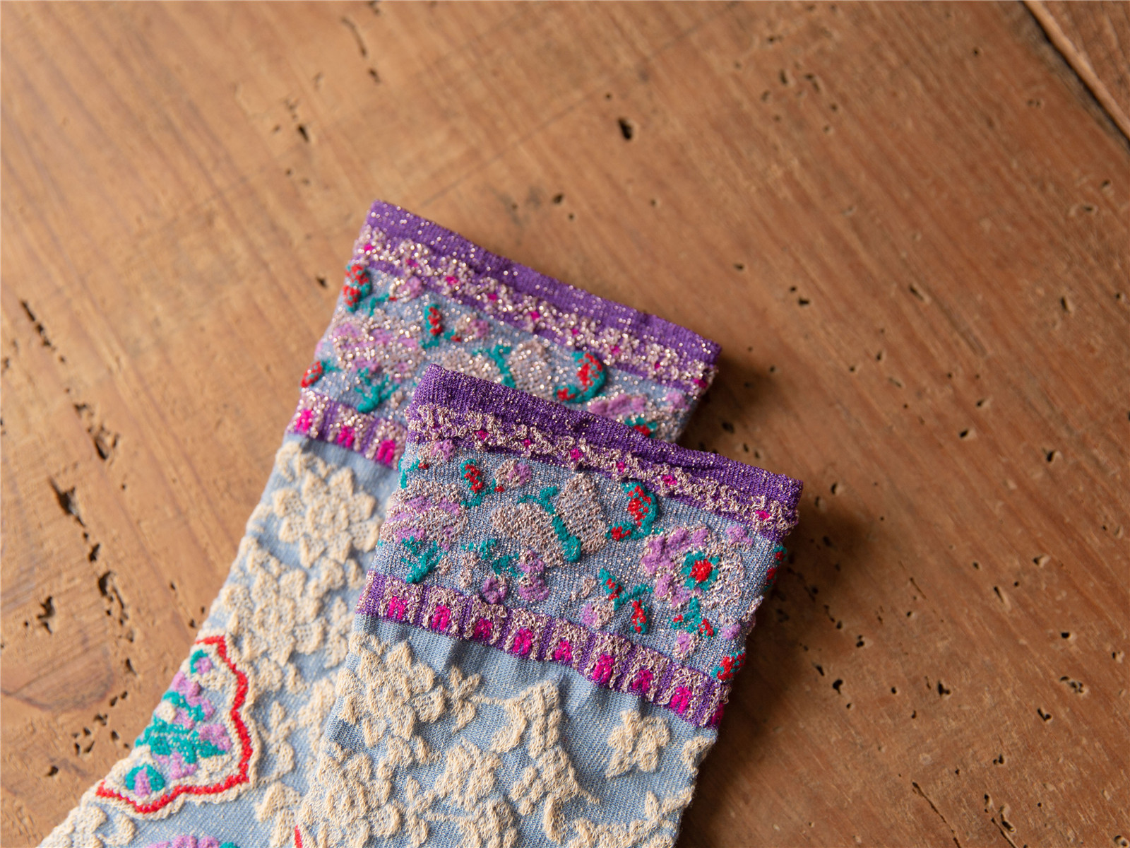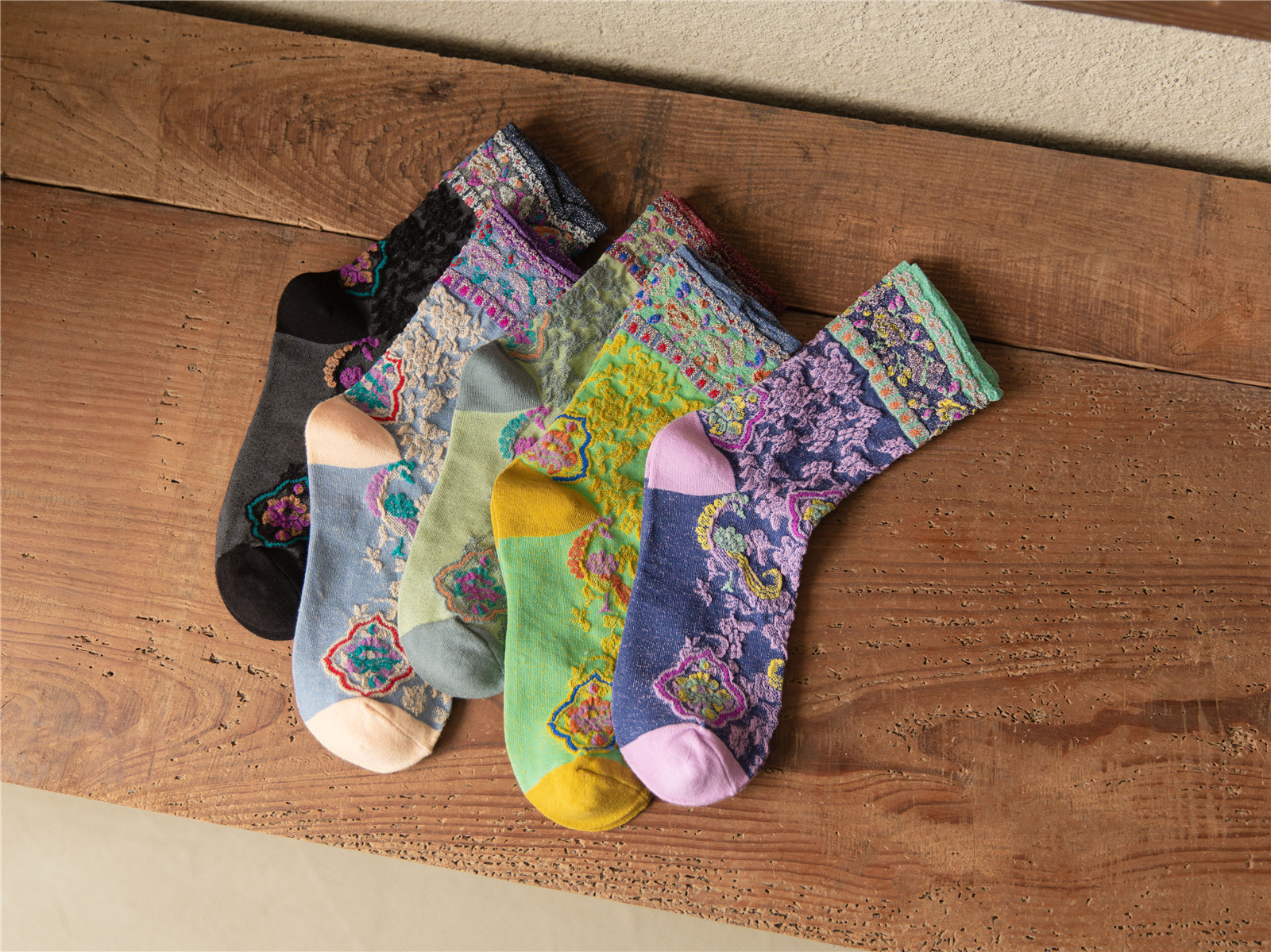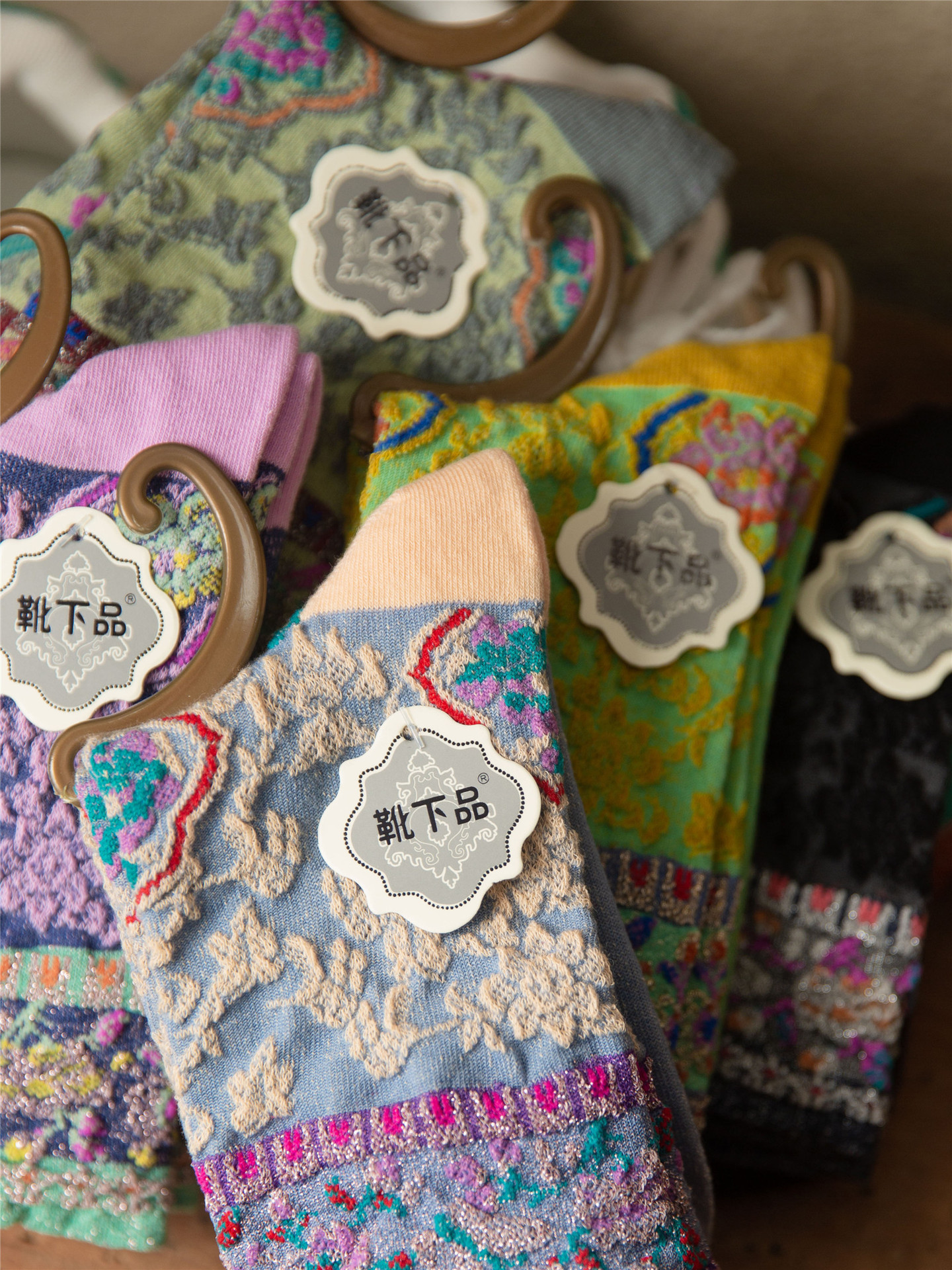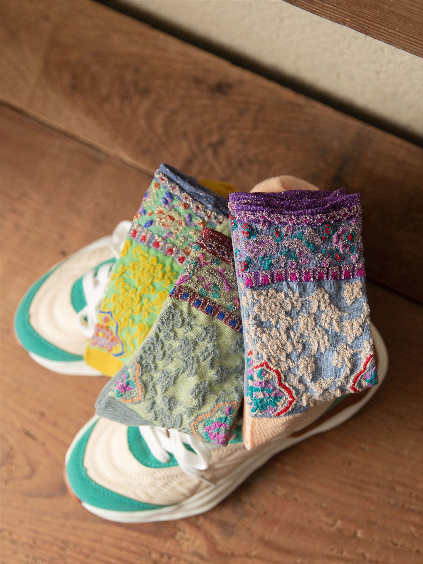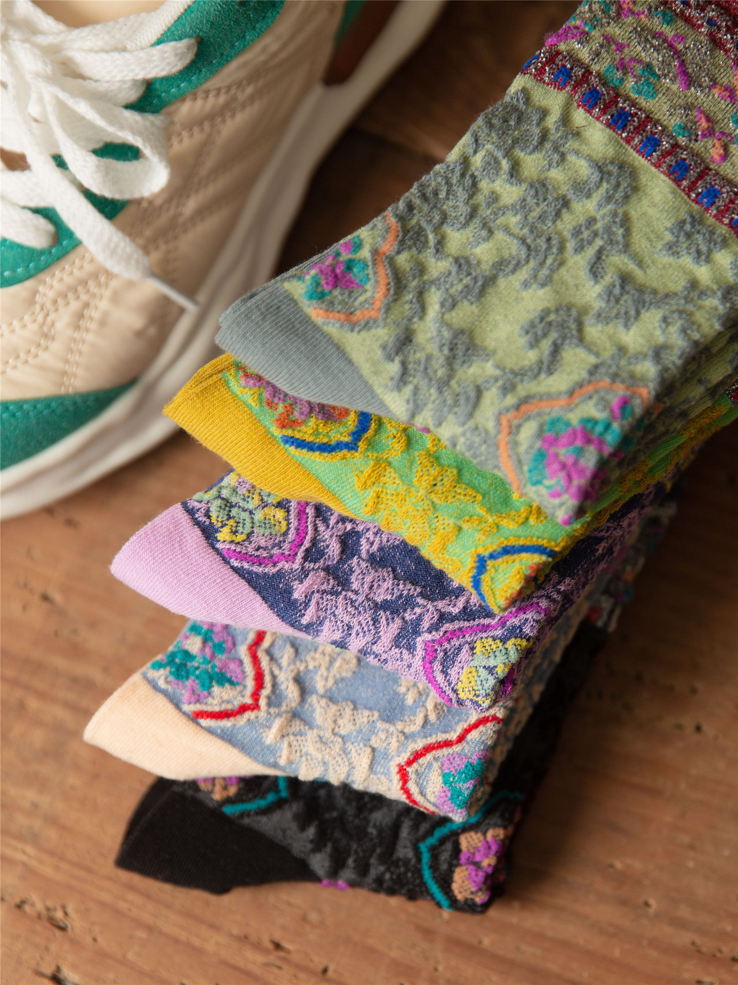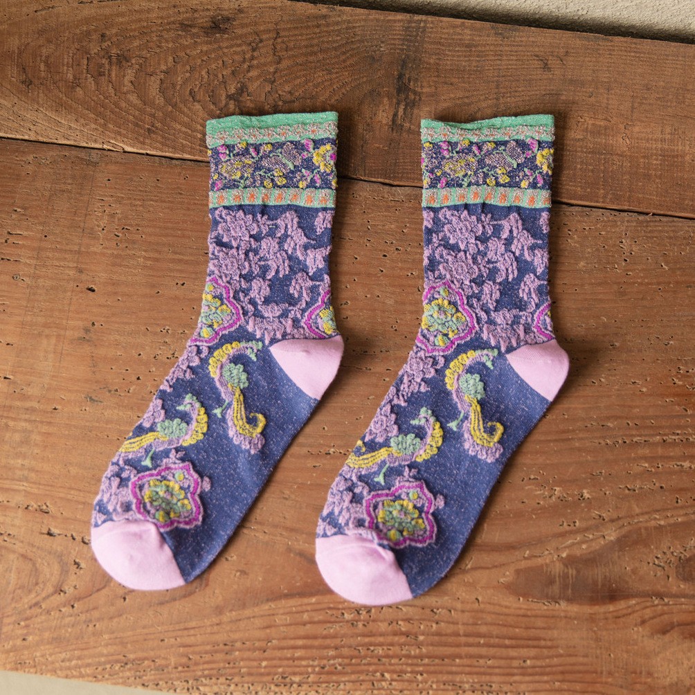 秋季新款亮丝复古花纹中筒女袜棉ins日系时尚泡泡罗口堆堆袜子