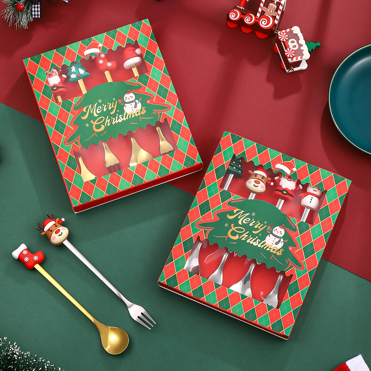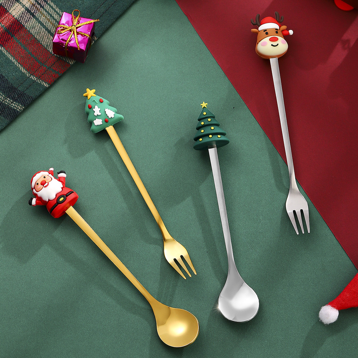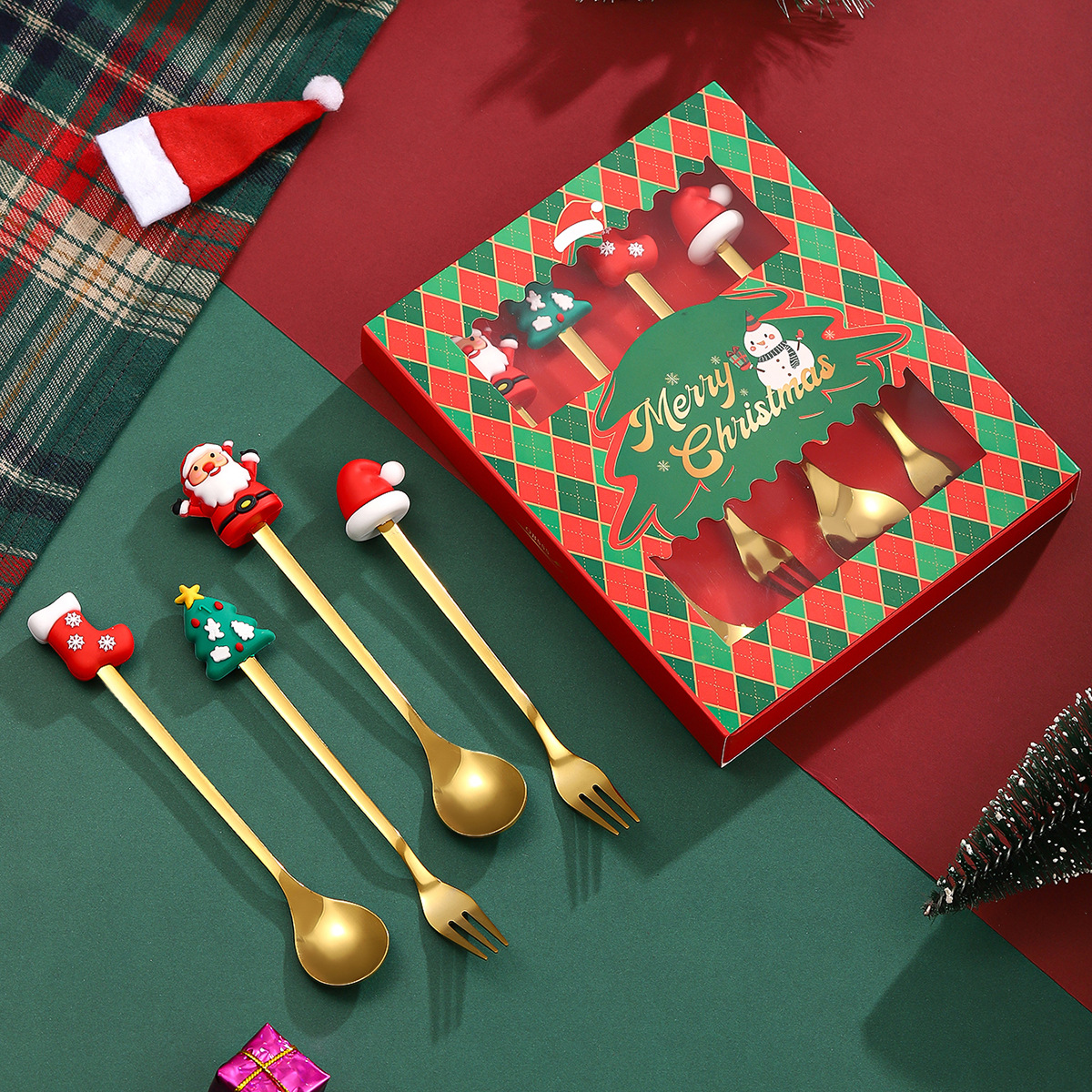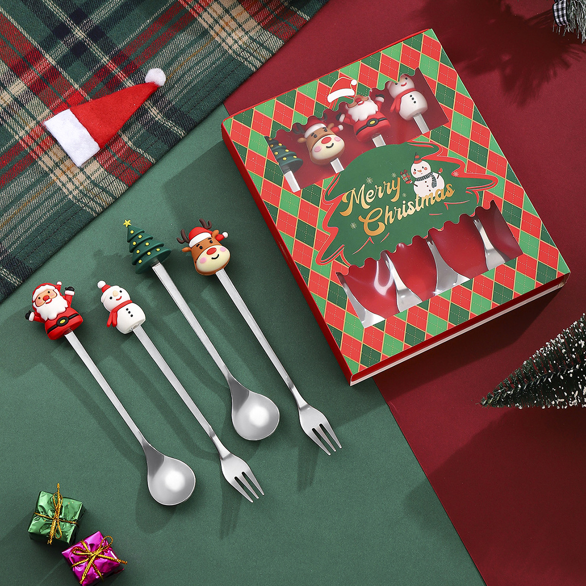 圣诞节勺叉4套装不锈钢餐具可爱卡通甜品咖啡勺水果叉圣诞节礼品
