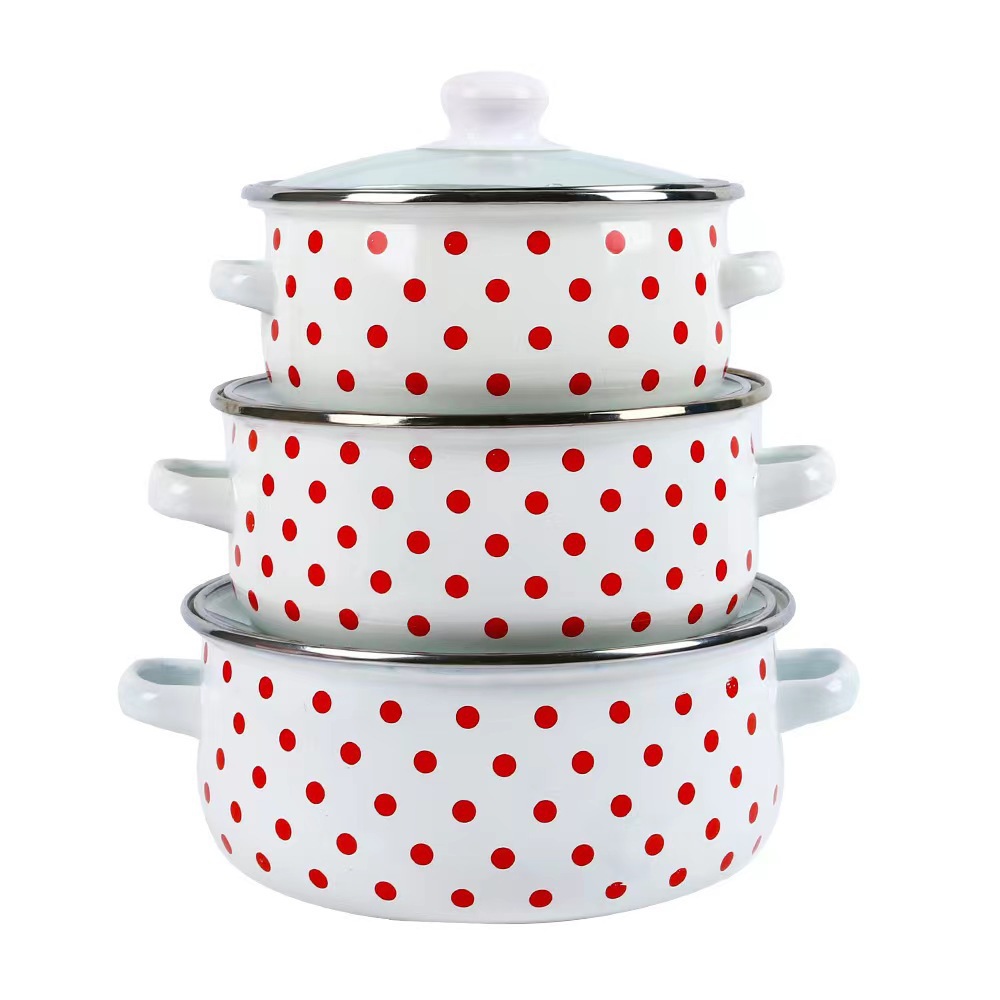 跨境爆品搪瓷汤锅 红底白点搪瓷锅三件套671E