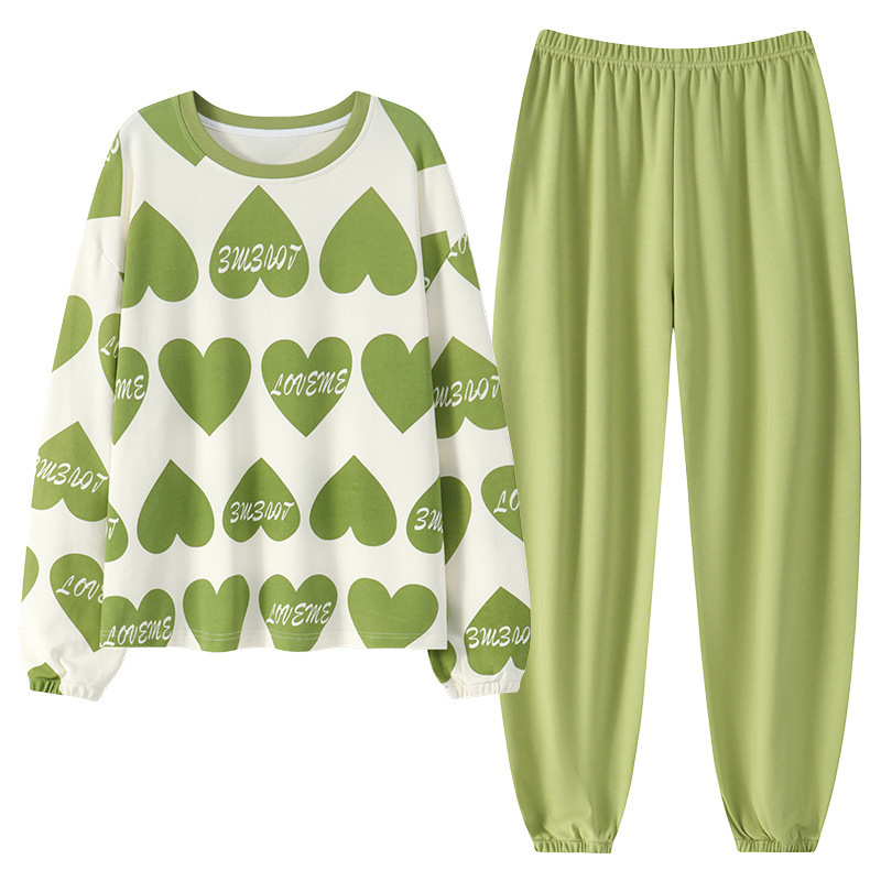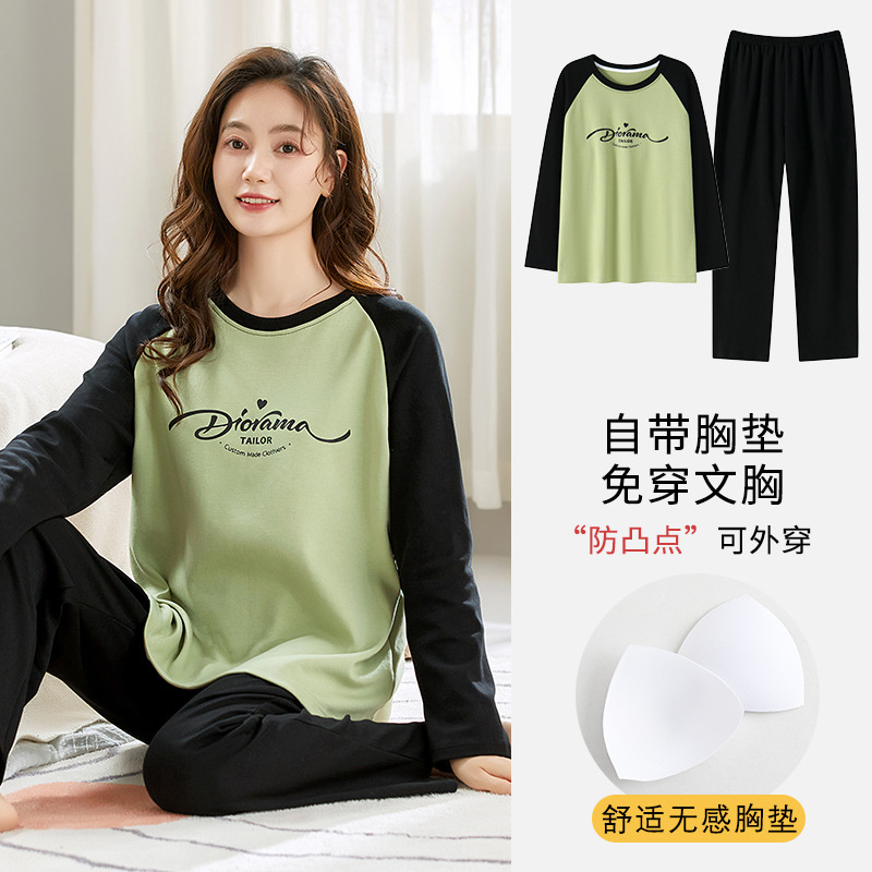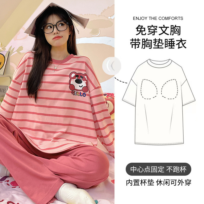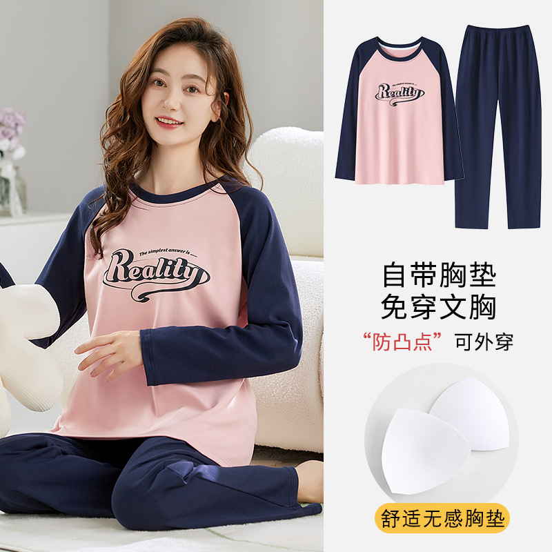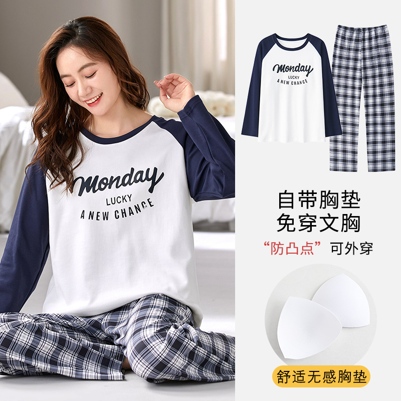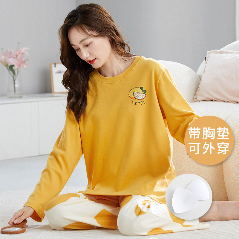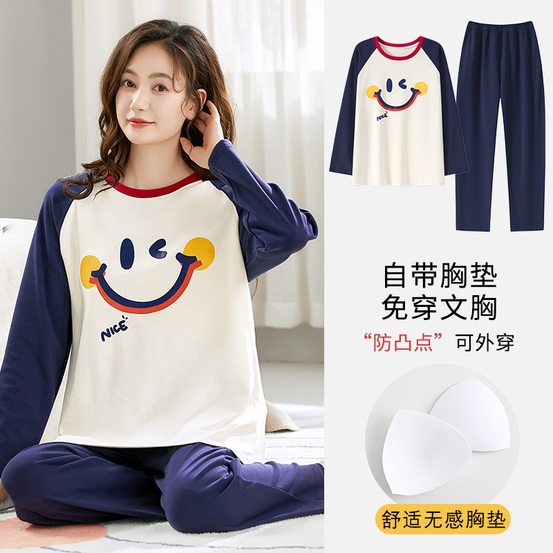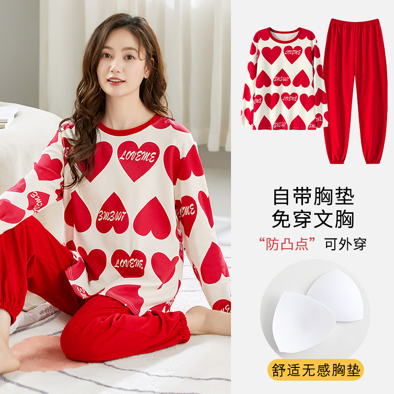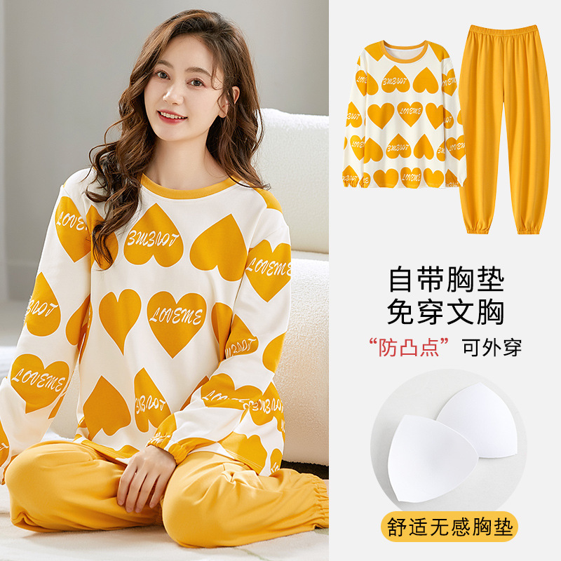 带胸垫睡衣女士秋冬季长袖棉质韩版卡通可爱休闲可外穿家居服套装
