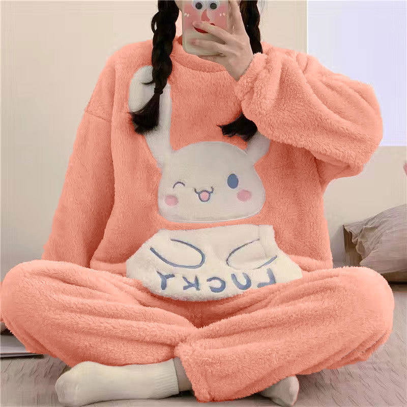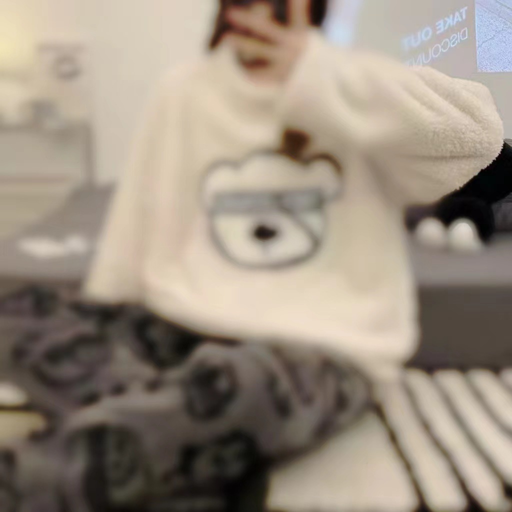 卡通甜美歪头熊同款睡衣女秋冬季珊瑚绒加厚宽松大码外贸跨境套装