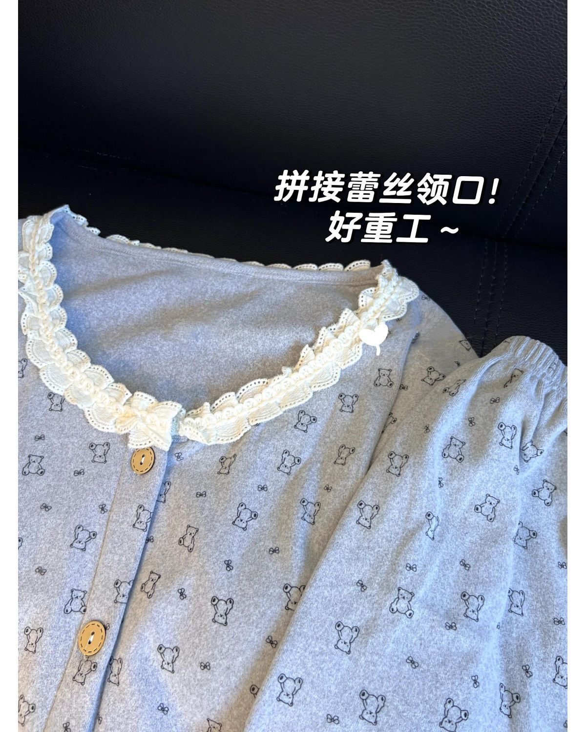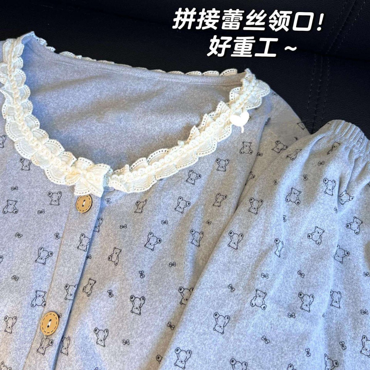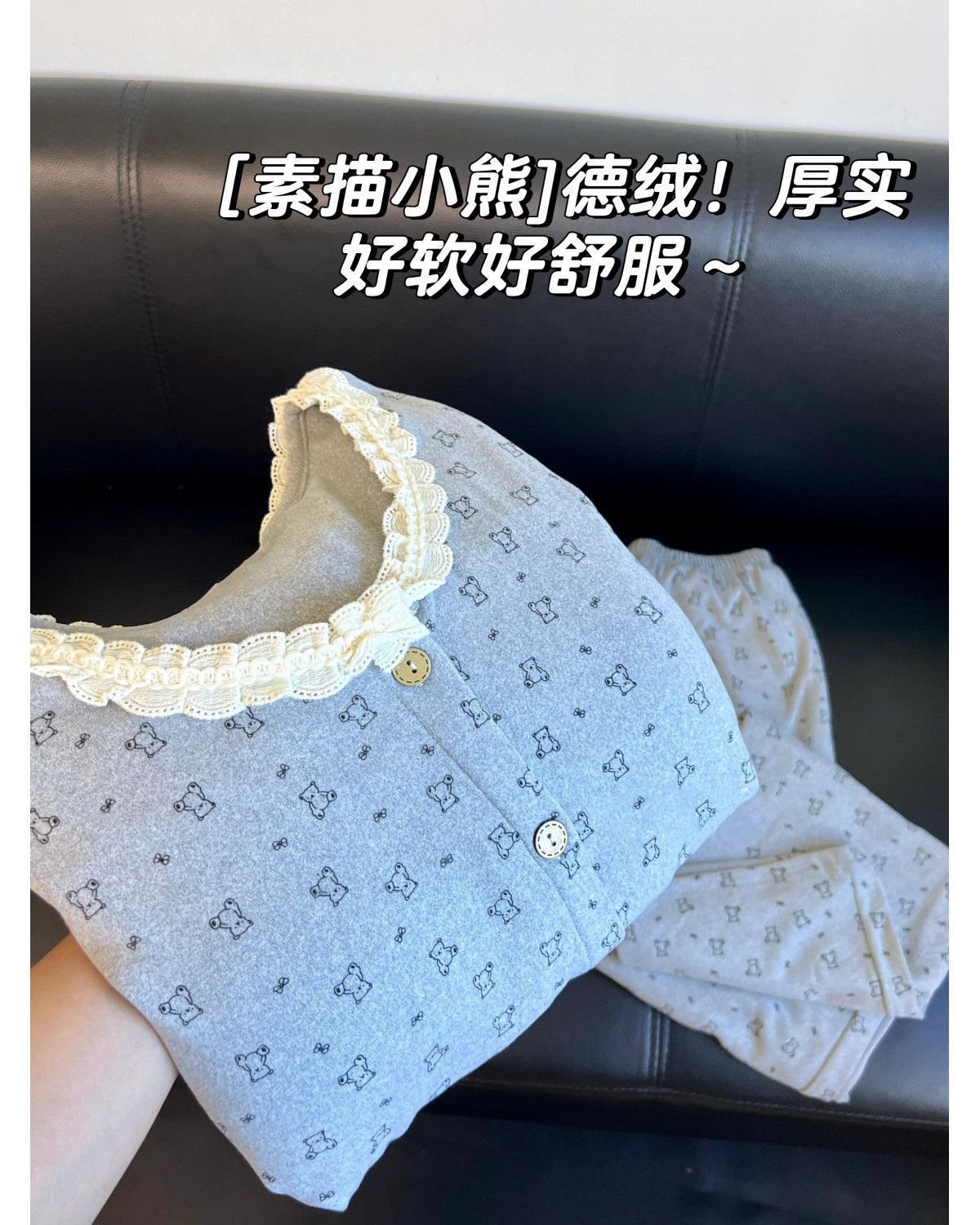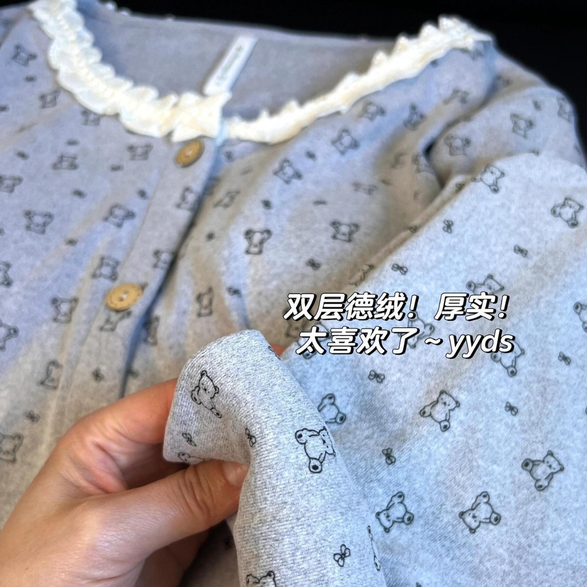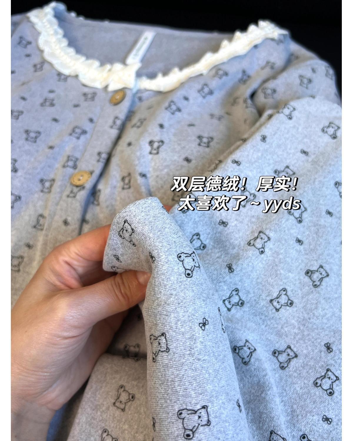 韩版可爱小熊德绒睡衣女秋季2024新款大码花边开衫长裤家居服套装