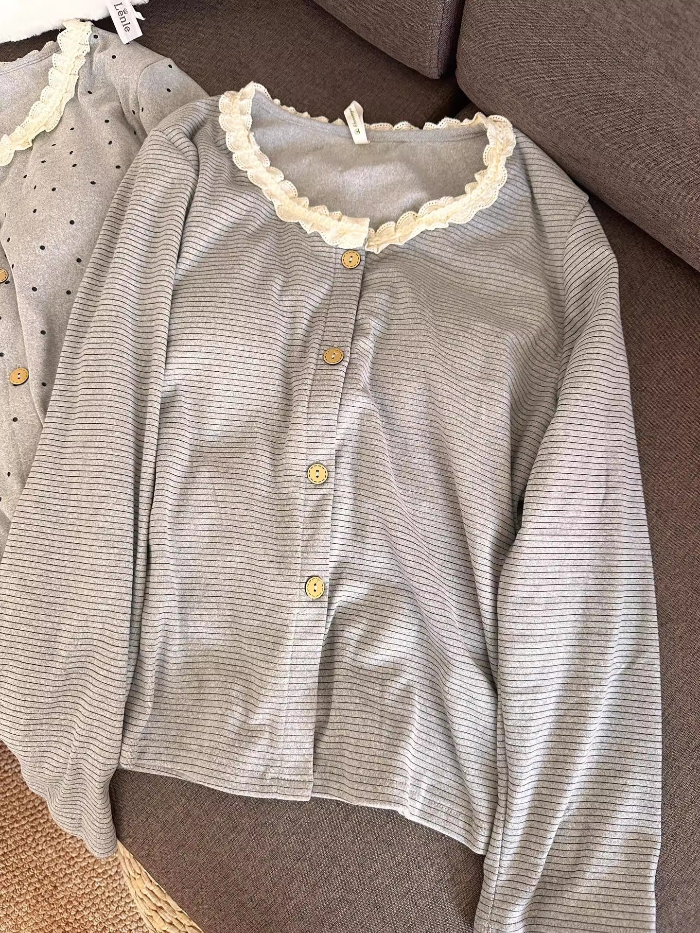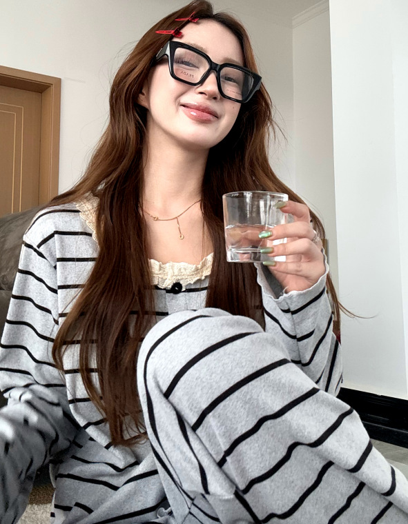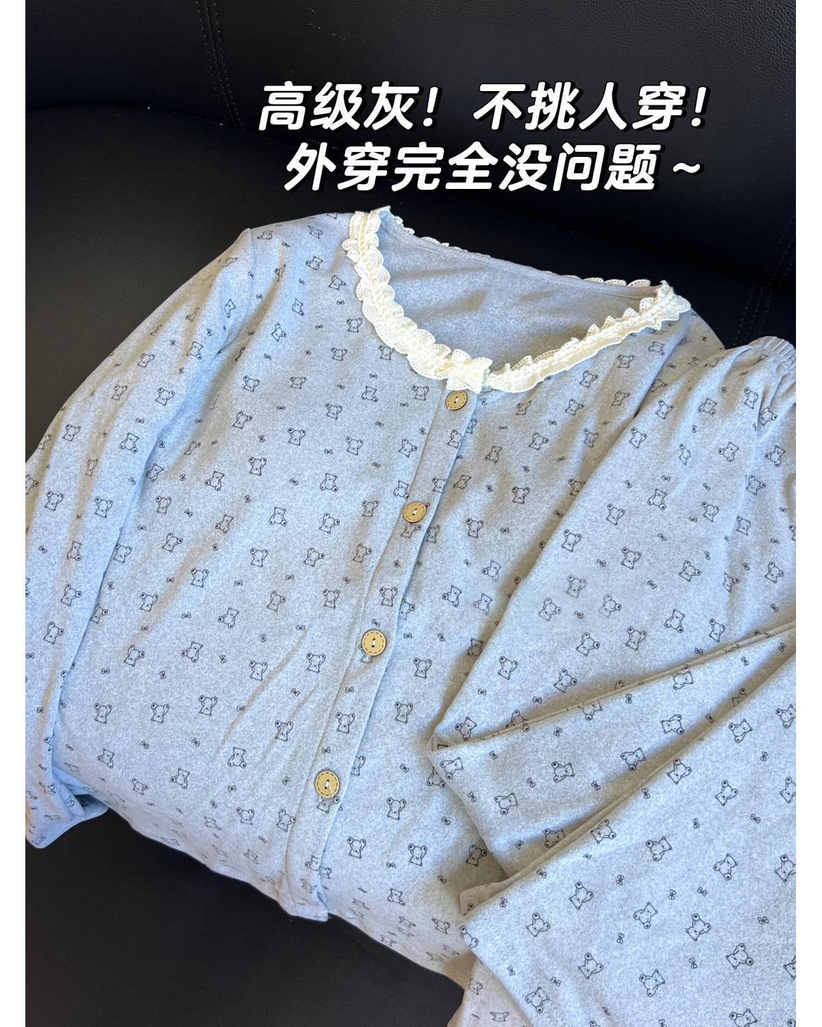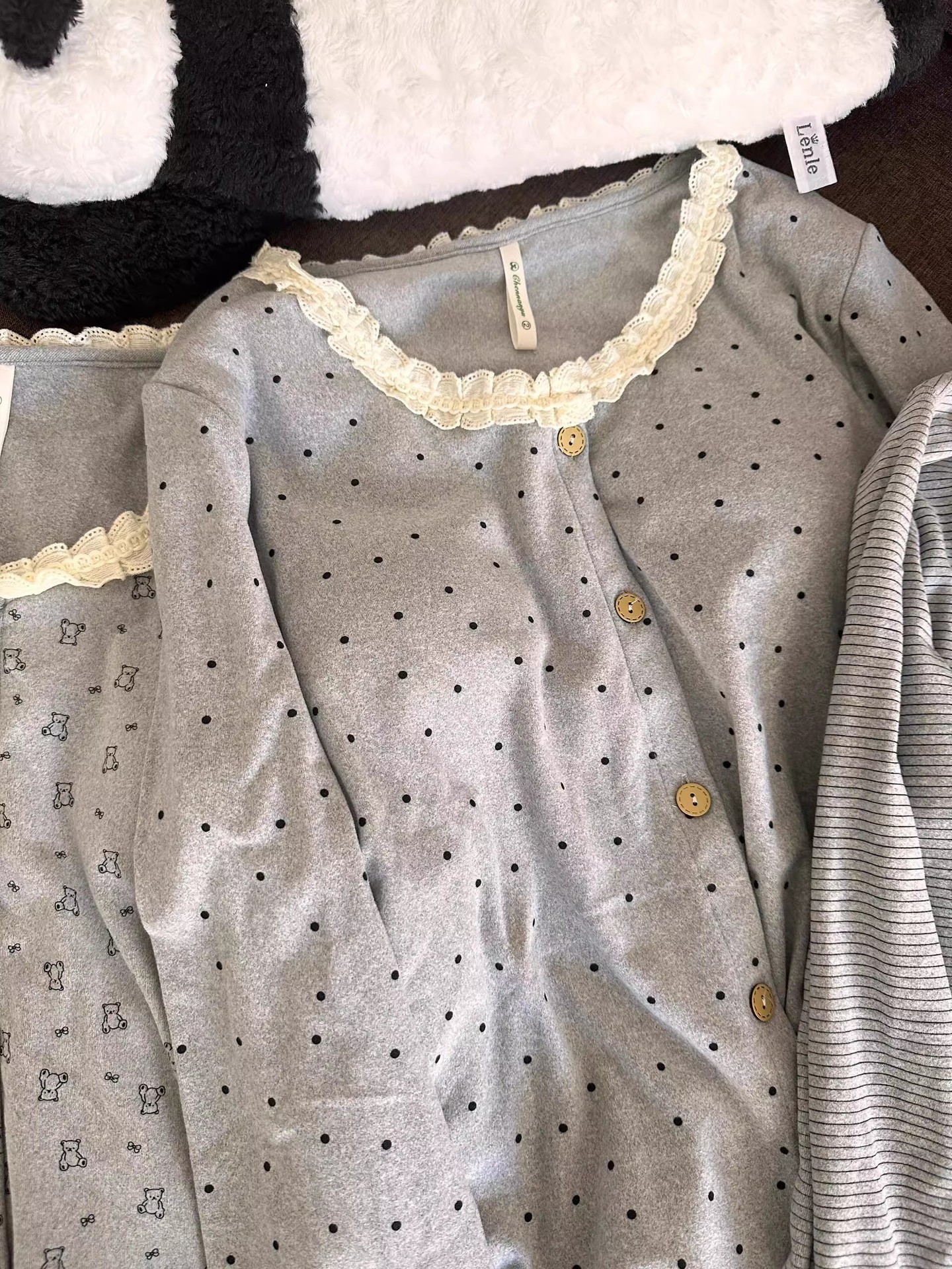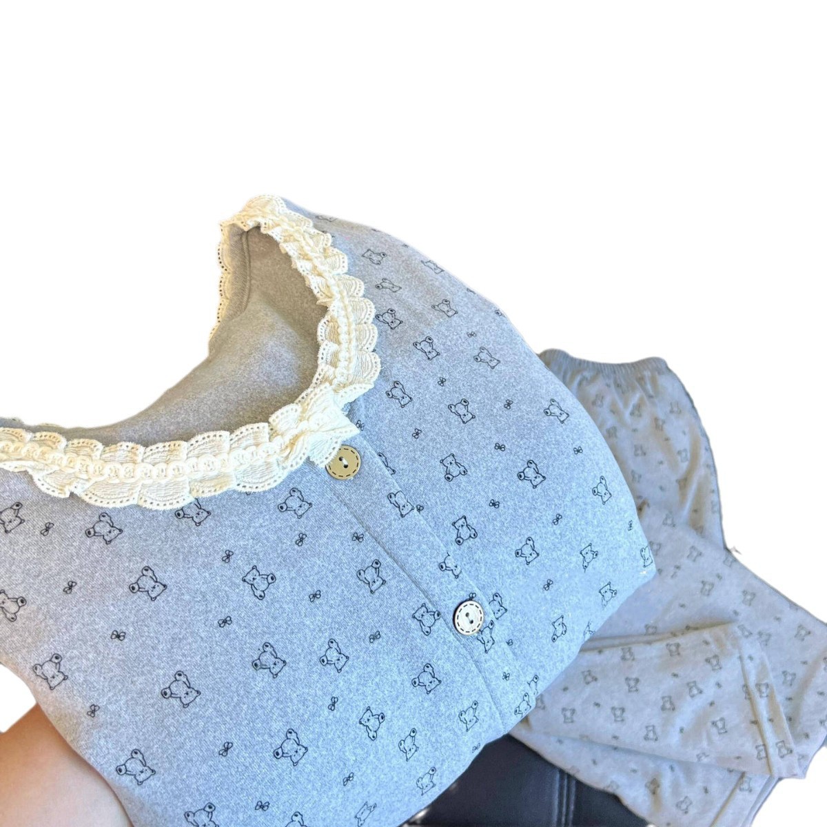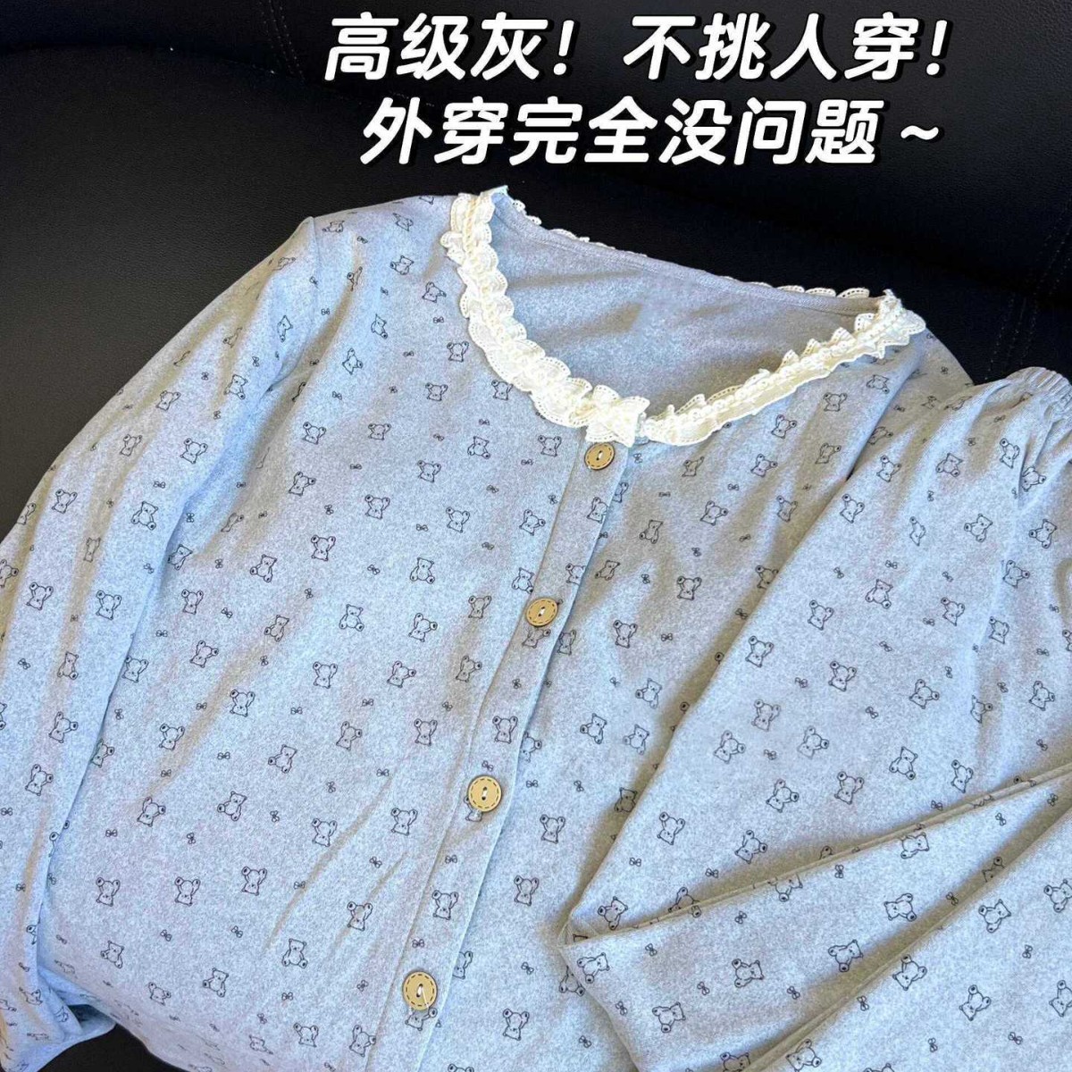 韩版可爱小熊德绒睡衣女秋季2024新款大码花边开衫长裤家居服套装
