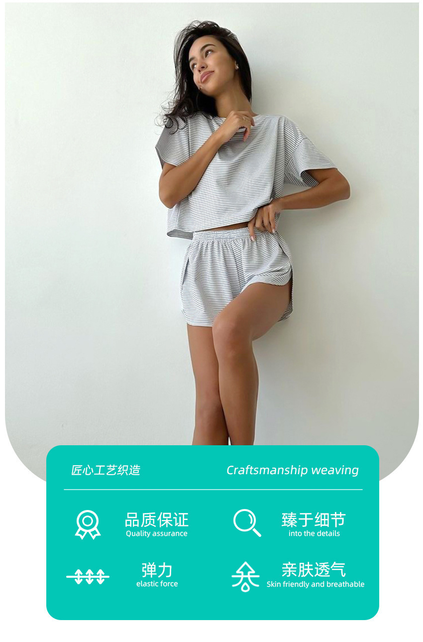 2024欧美秋季针织条纹睡衣宽松短袖短裤套装时尚跨境外穿家居服女