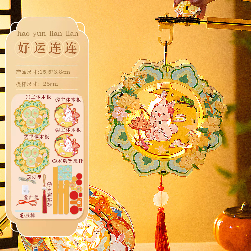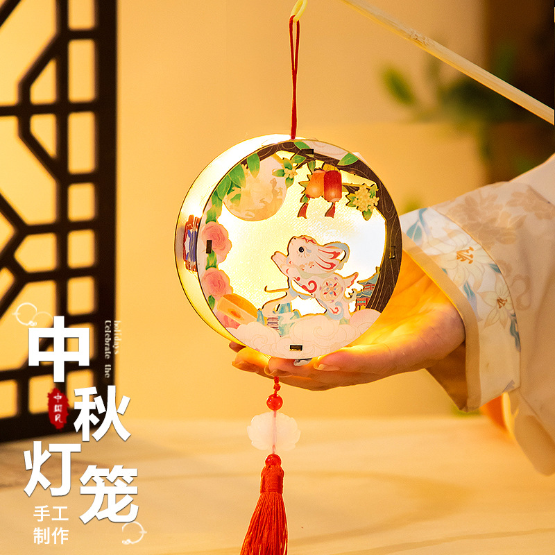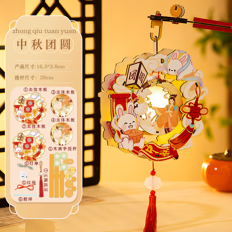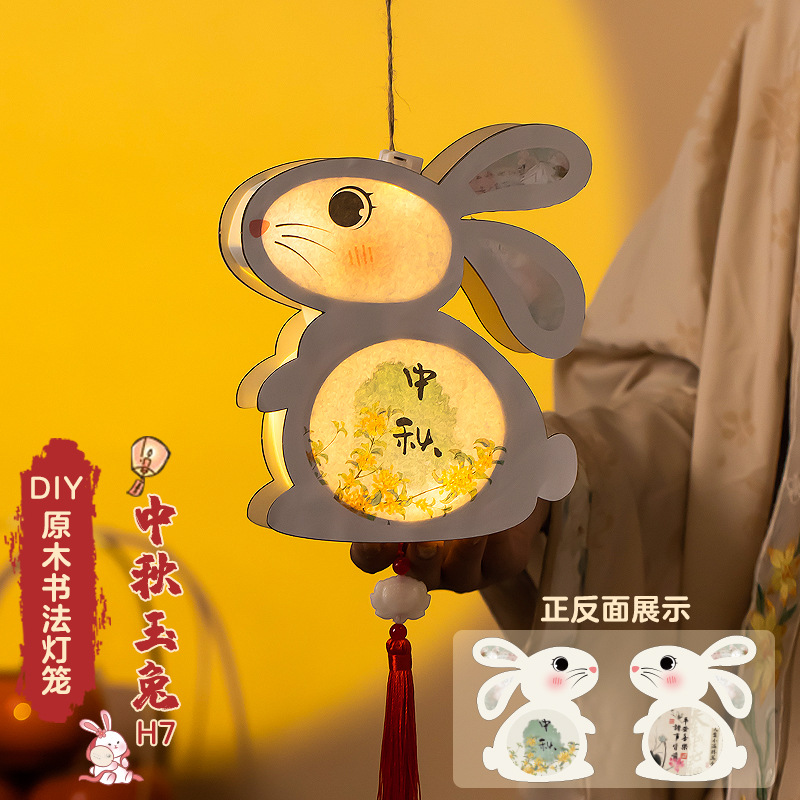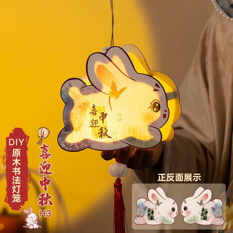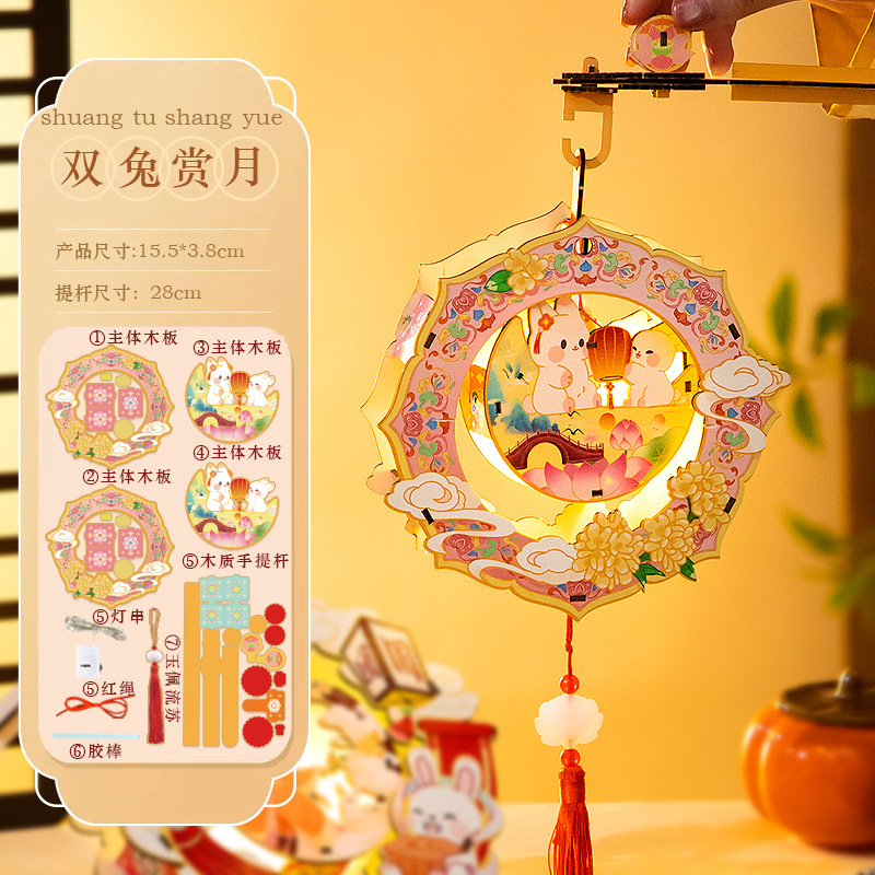 中秋节灯笼手提木质旋转花灯儿童手工diy材料小兔子发光宫灯批发