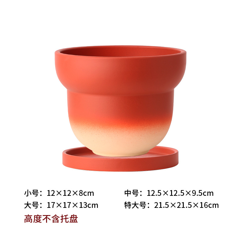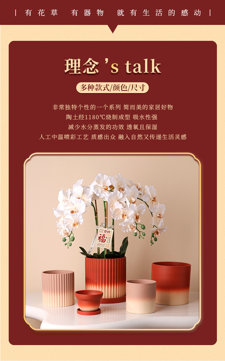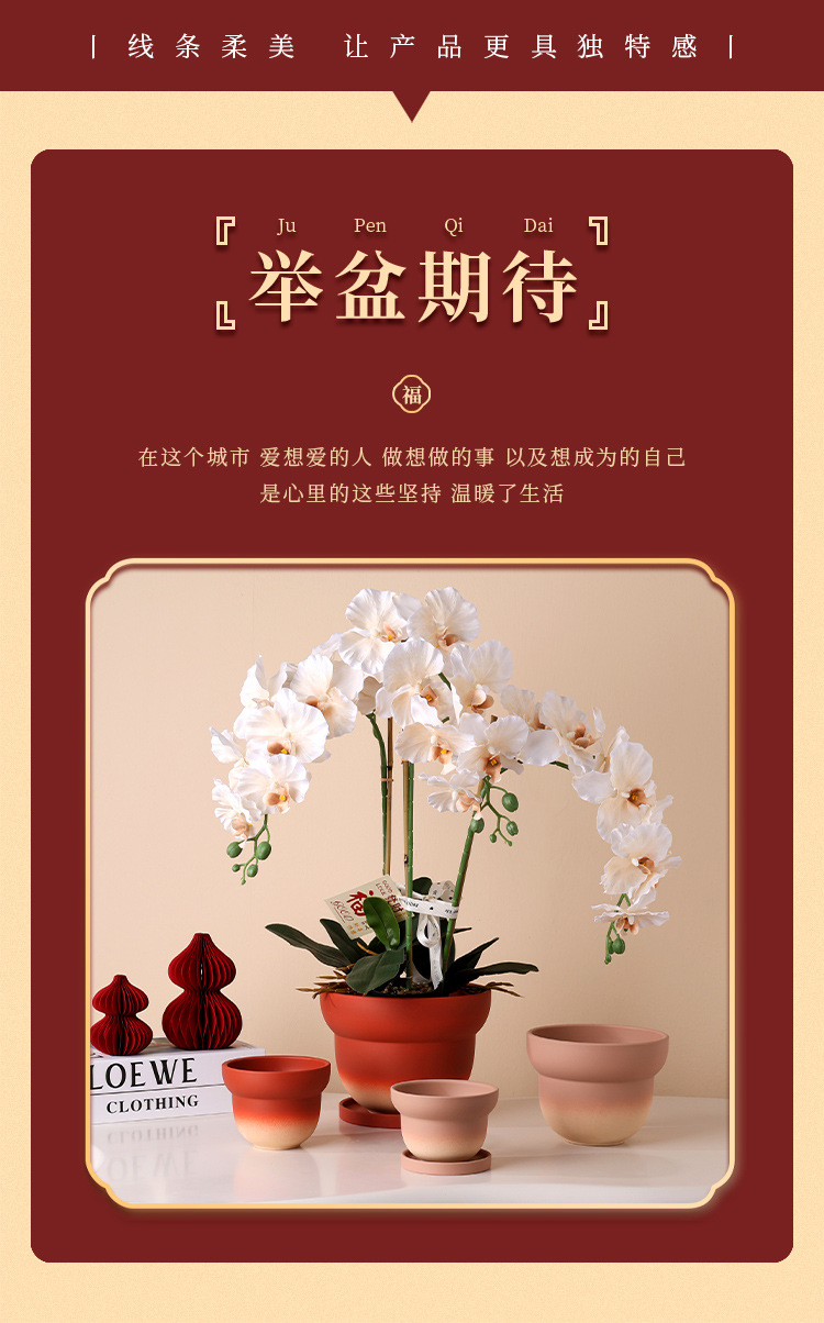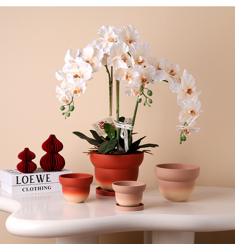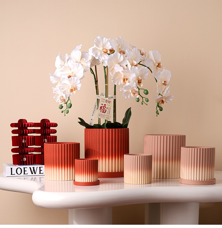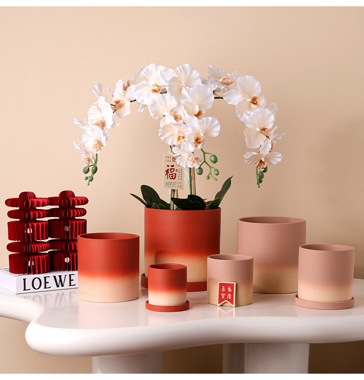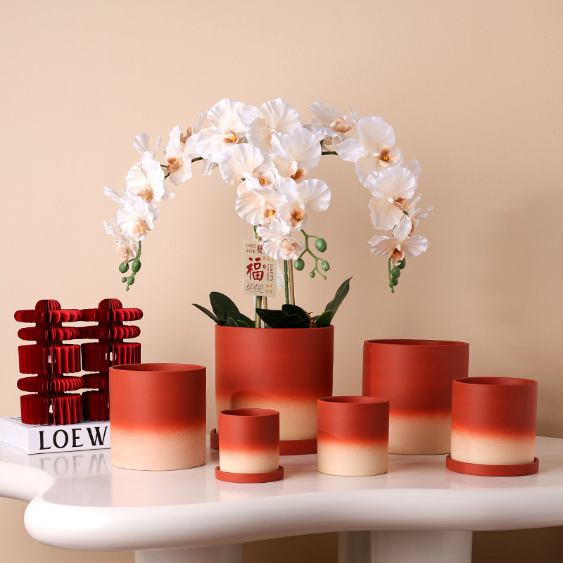 蝴蝶兰 花盆 新年福桶渐变迎春素烧红色花盆有孔带托盘仿真花发财