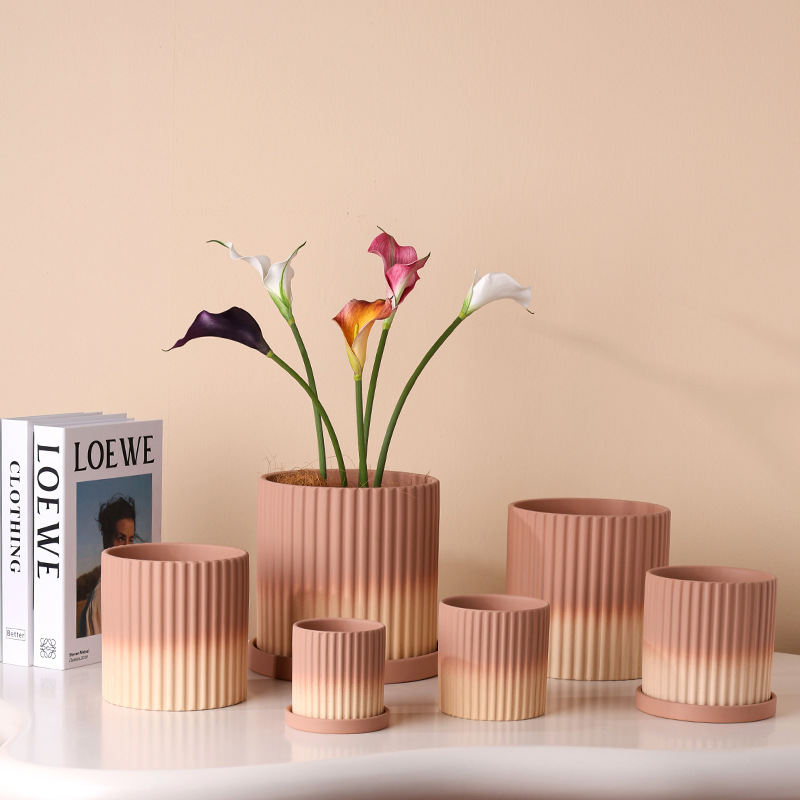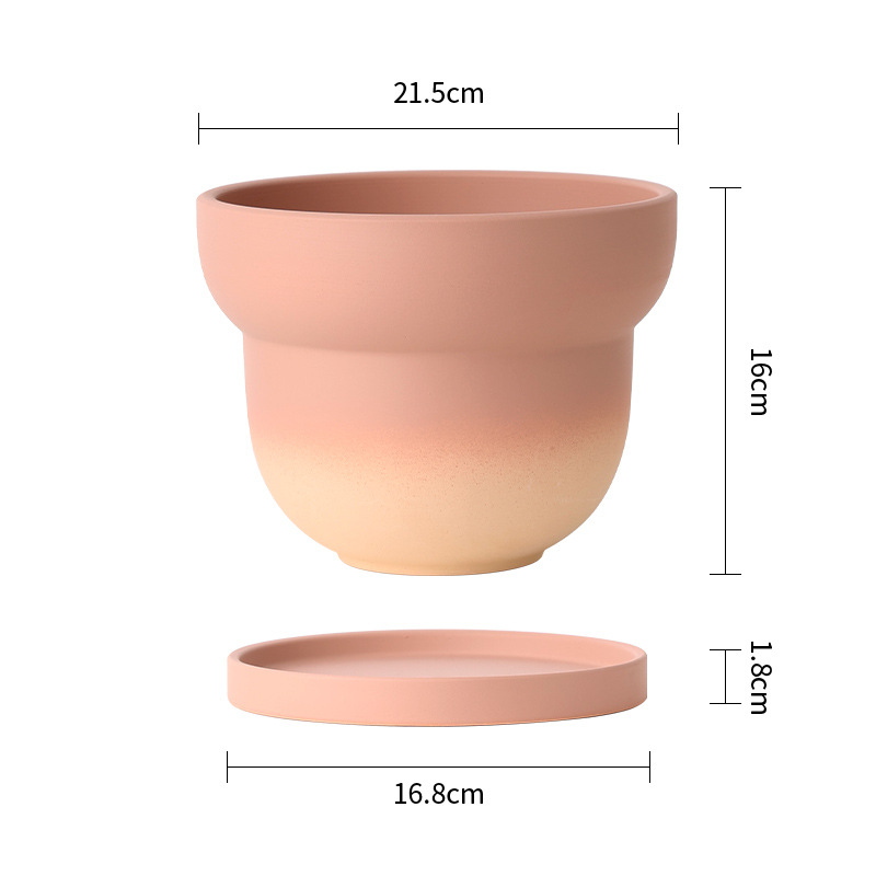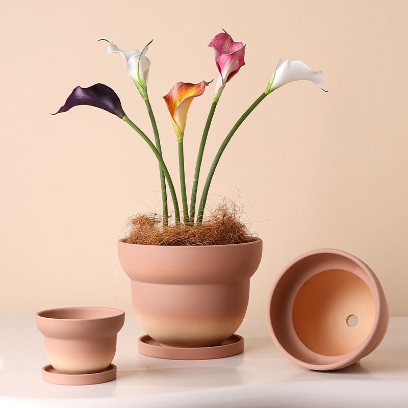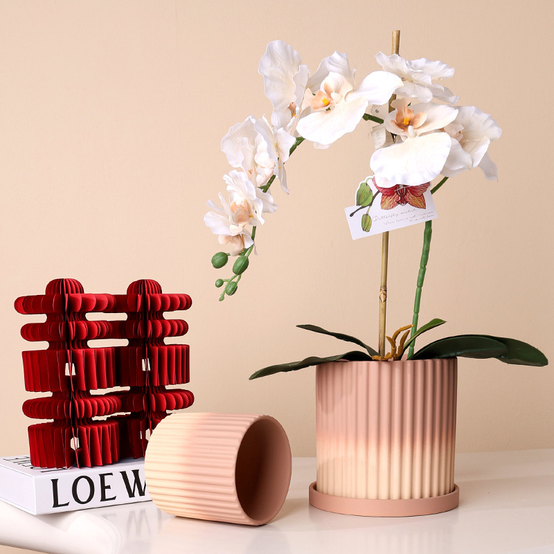 蝴蝶兰 花盆 新年福桶渐变迎春素烧红色花盆有孔带托盘仿真花发财