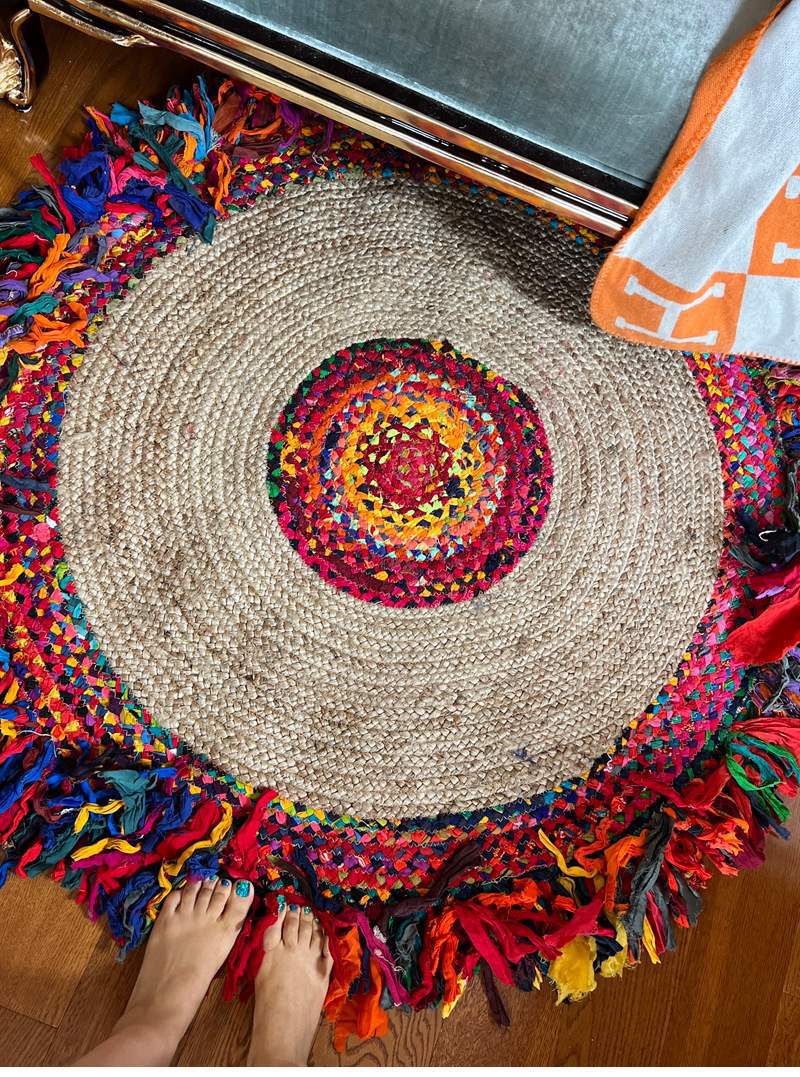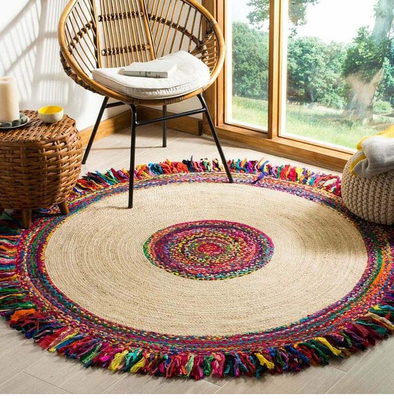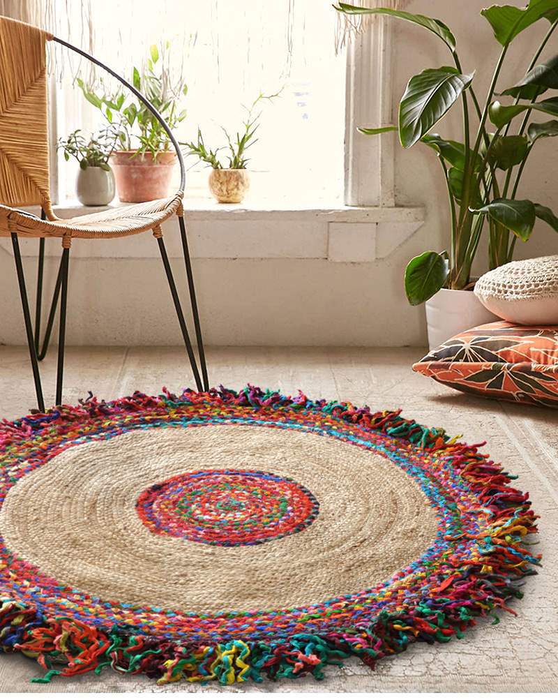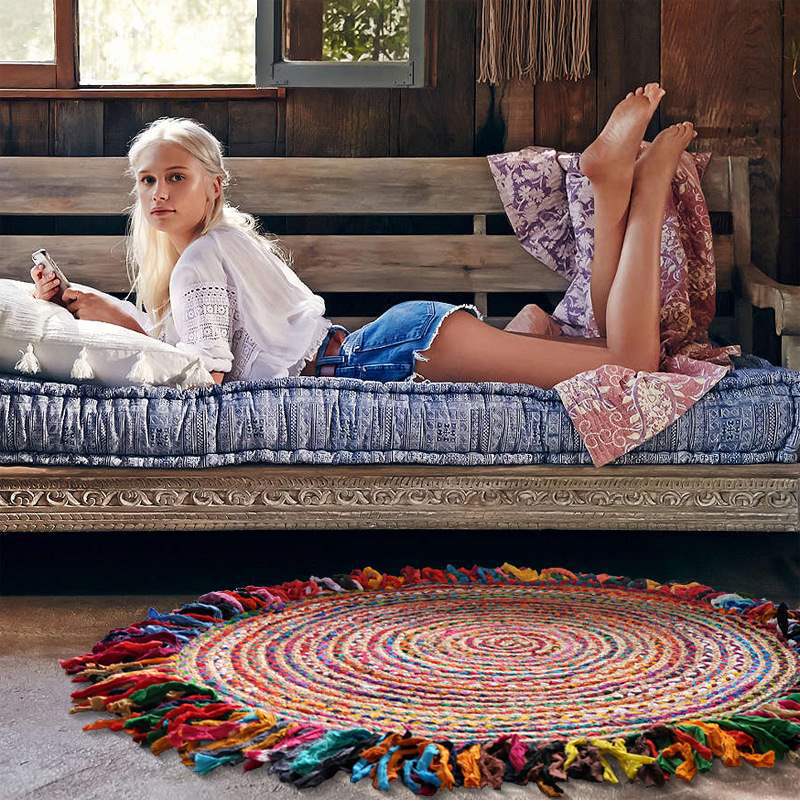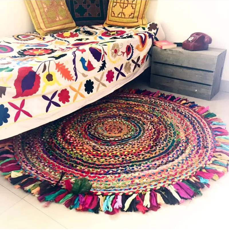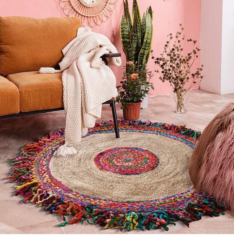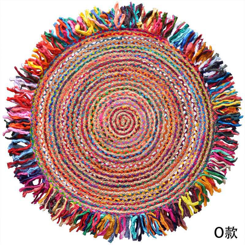 彩虹款 印度黄麻纯棉混合编织圆形流苏地毯民族风ins沙发卧室地垫