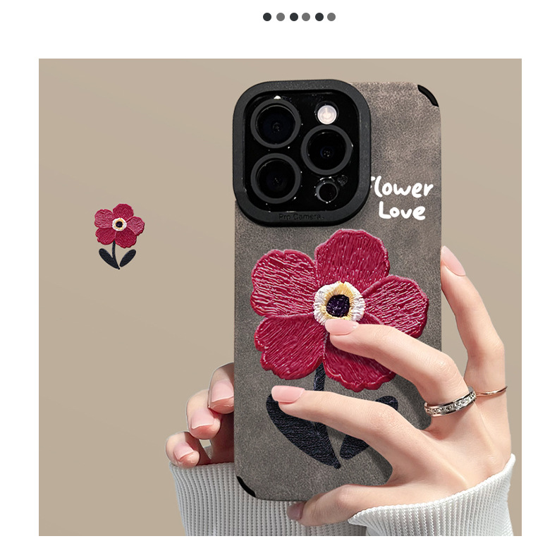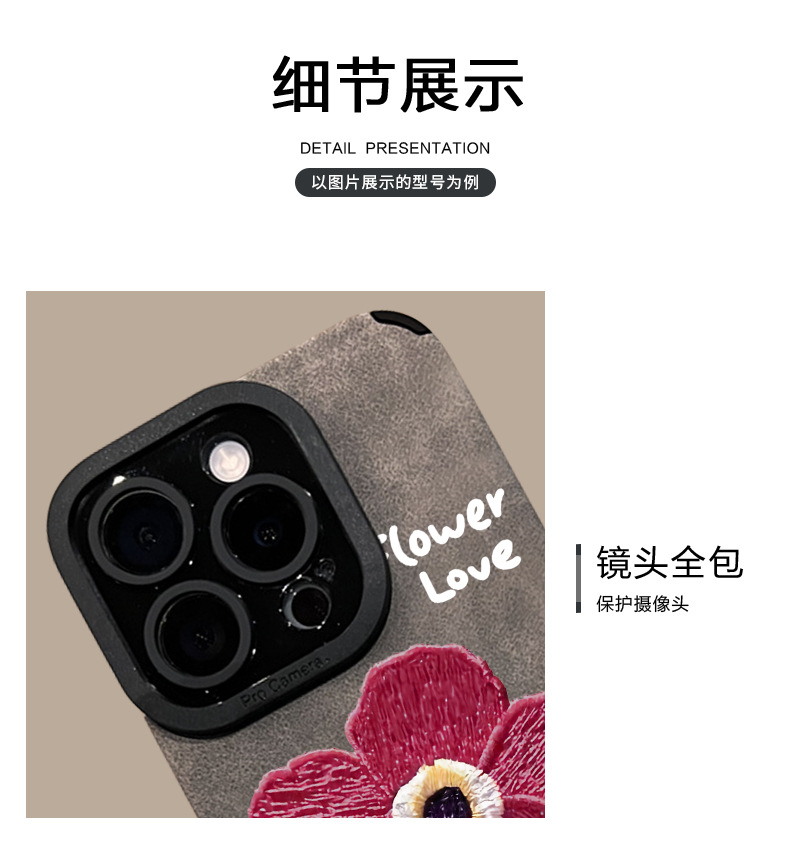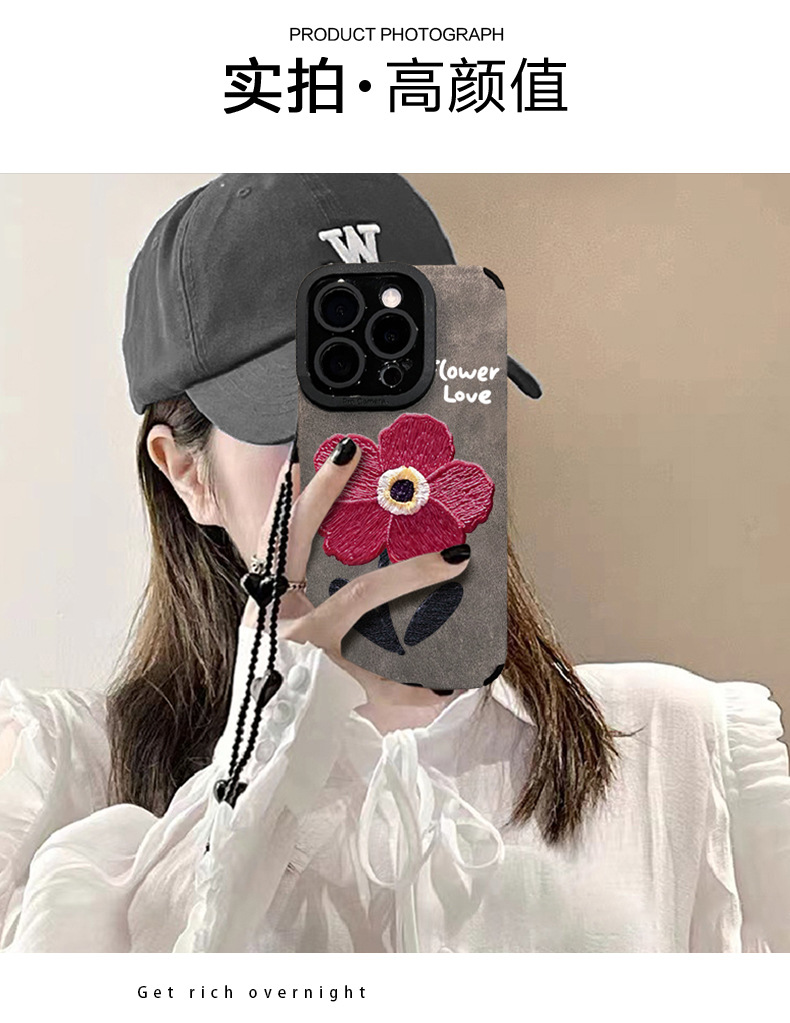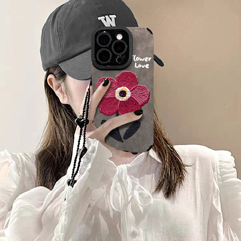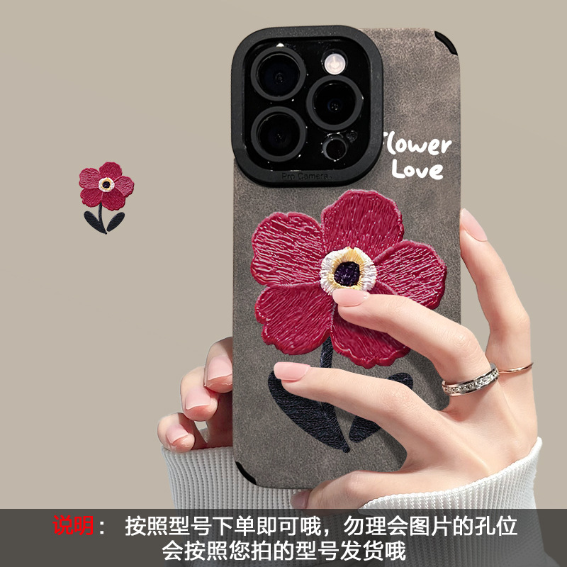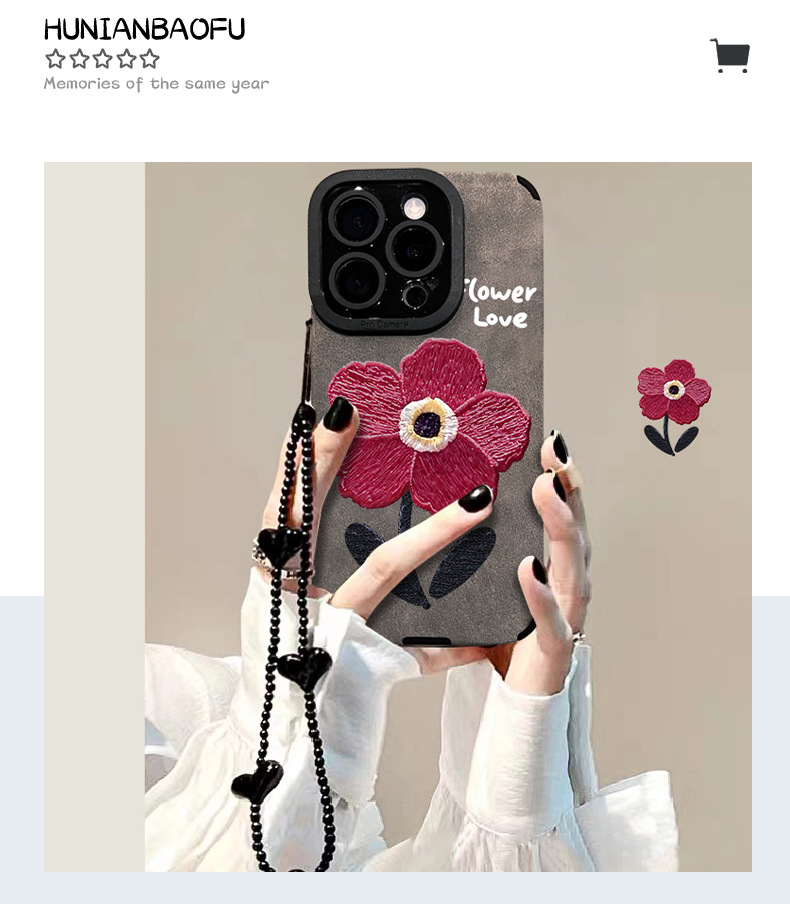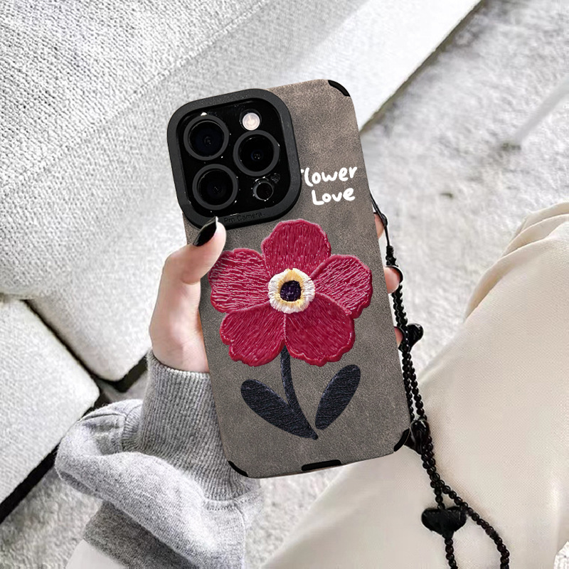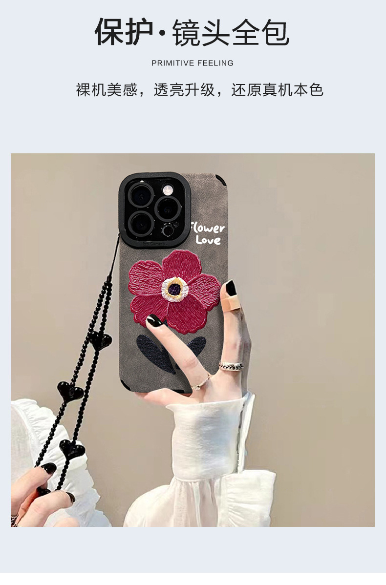 油画红花链条适用苹果16pro手机壳15/14硅胶防摔13翻毛皮12高级感