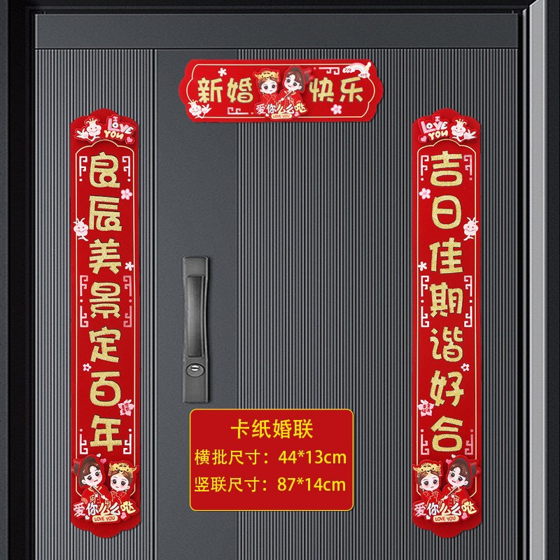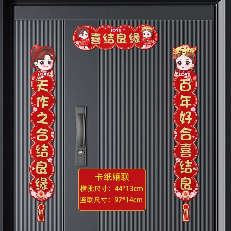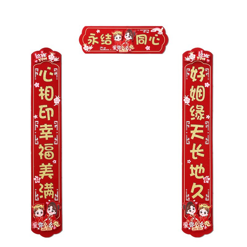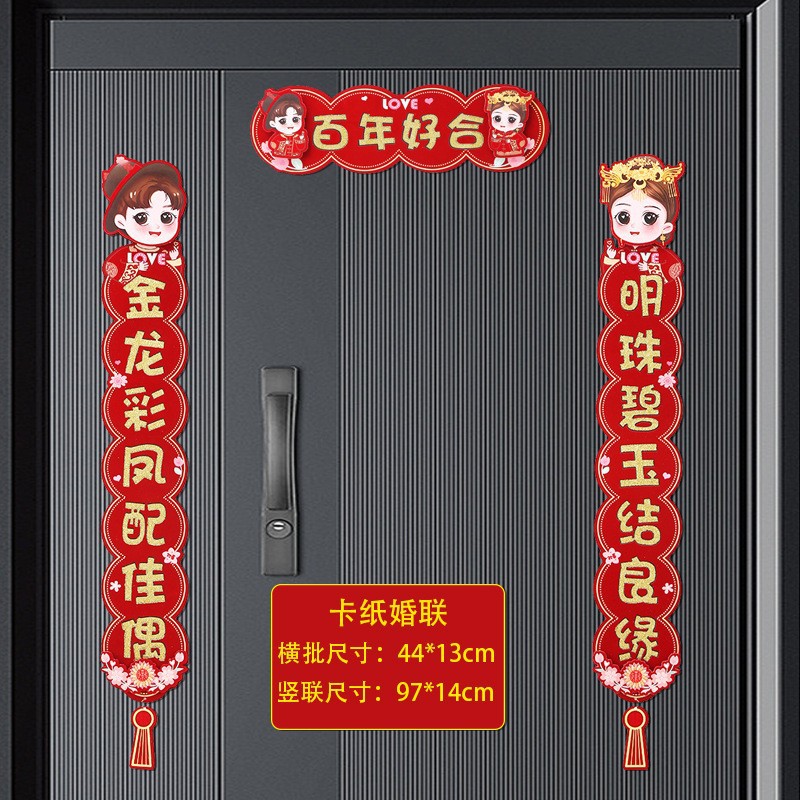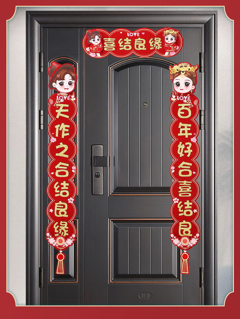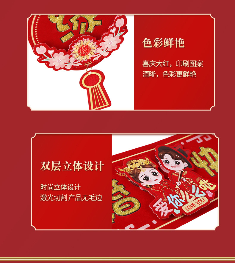男方女方布置新婚大门新款结婚对联植绒立体金粉喜联婚房装饰