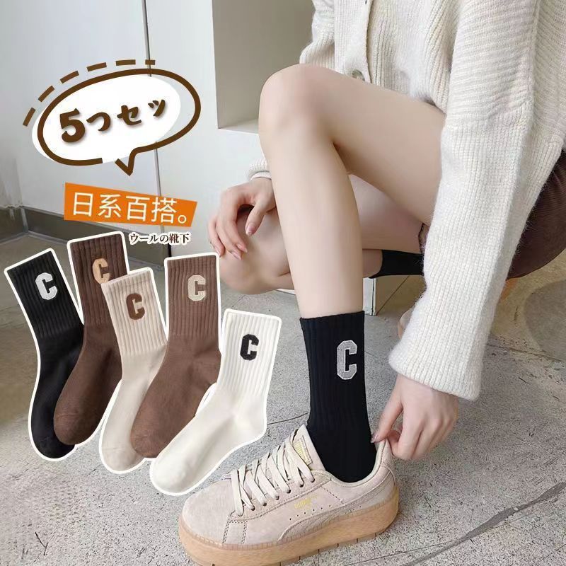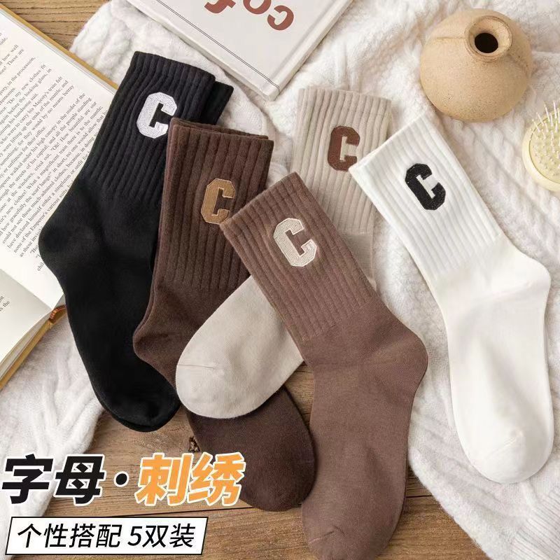 秋冬袜子女ins潮百搭字母中长筒学院风网红运动外穿冬季黑色长袜