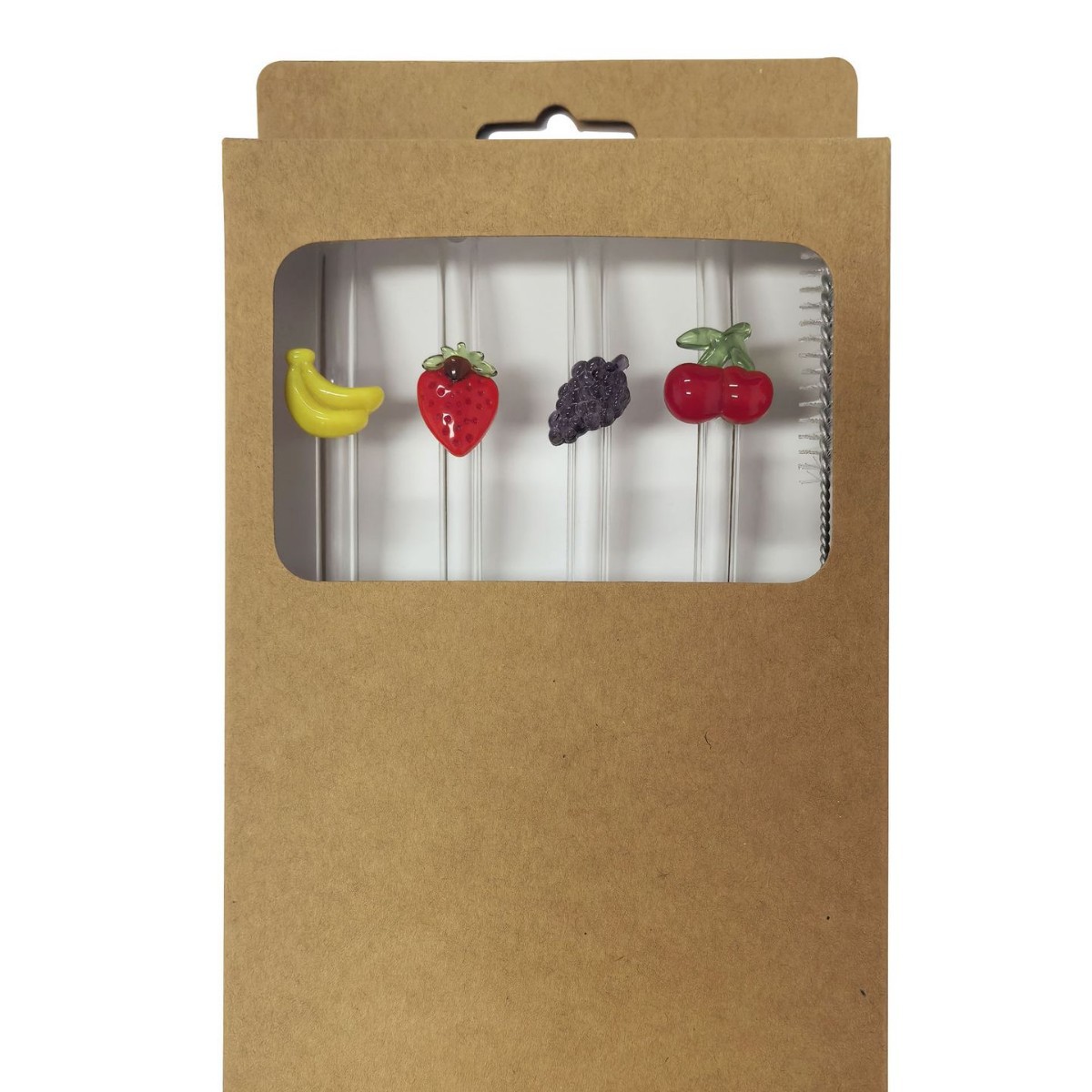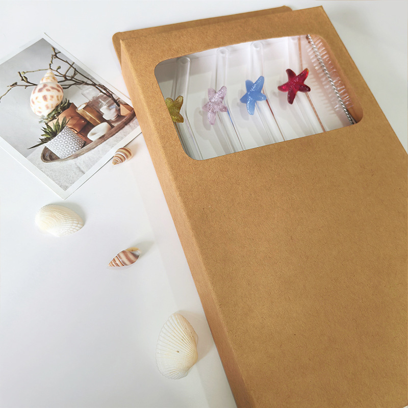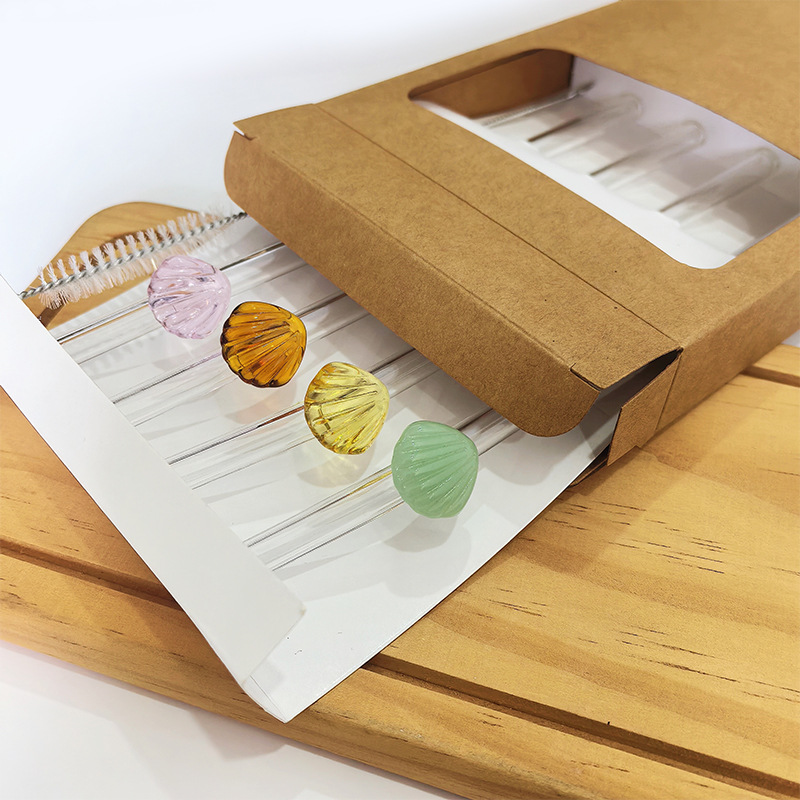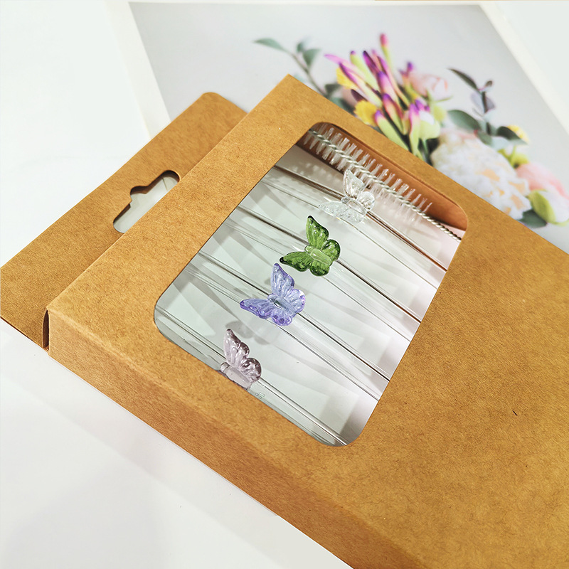 四支装玻璃吸管套装蝴蝶贝壳粘件带刷牛皮纸盒工厂供货可定制彩盒