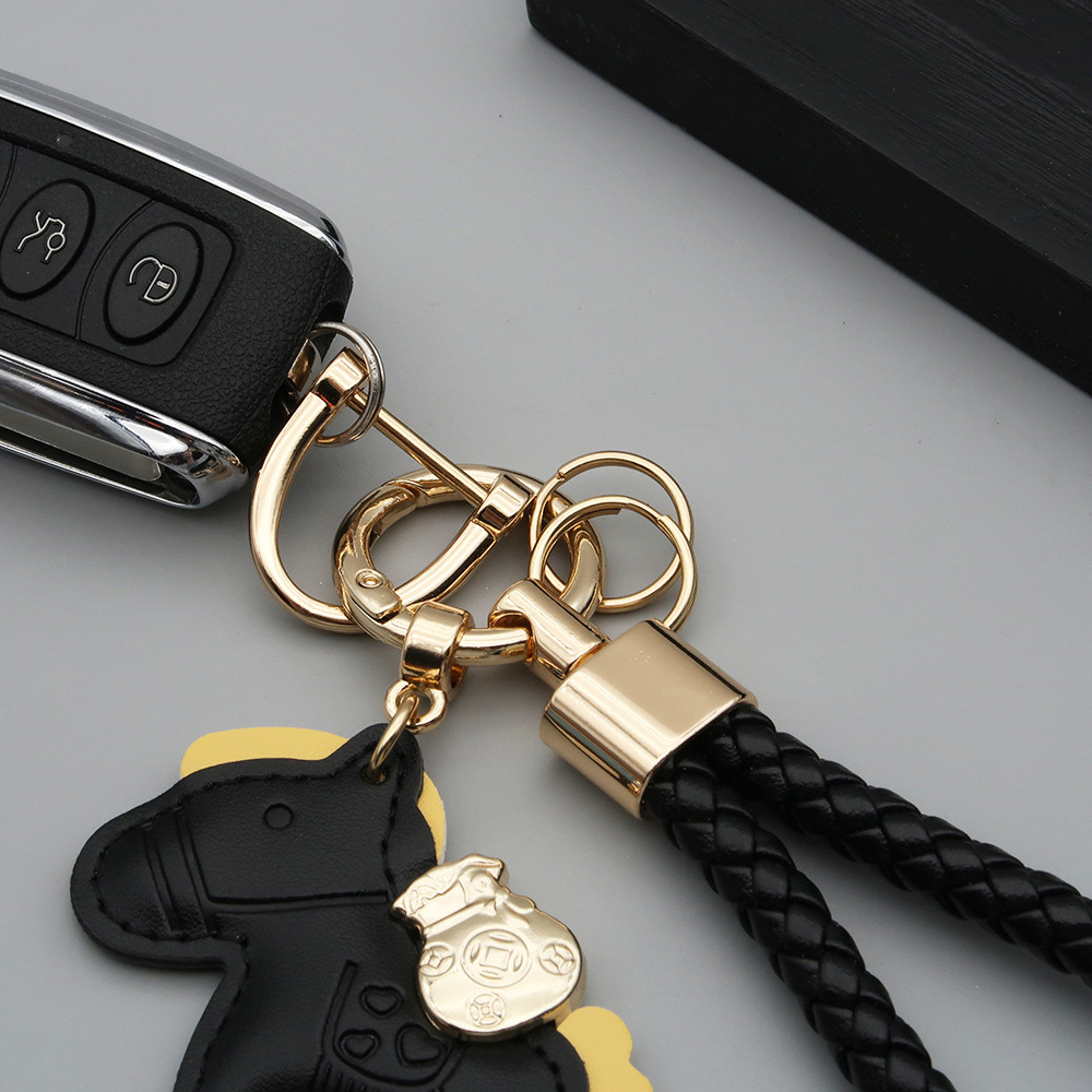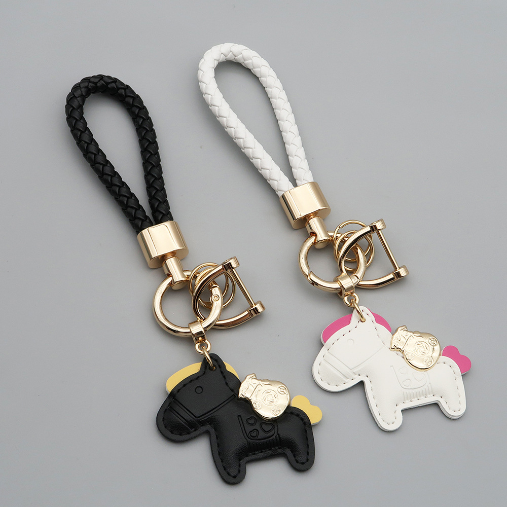 马上有钱钥匙扣精致皮质编织绳时尚卡通汽车钥匙链包可爱小马挂件