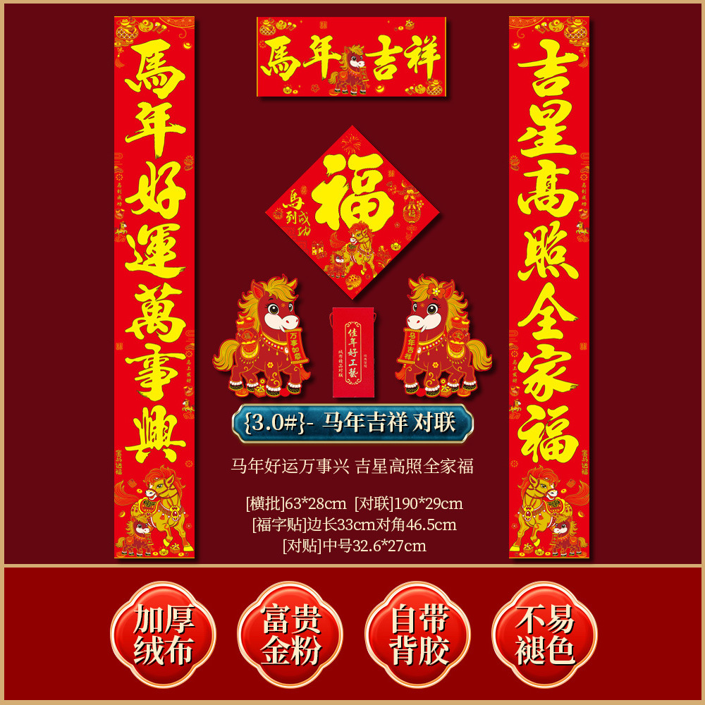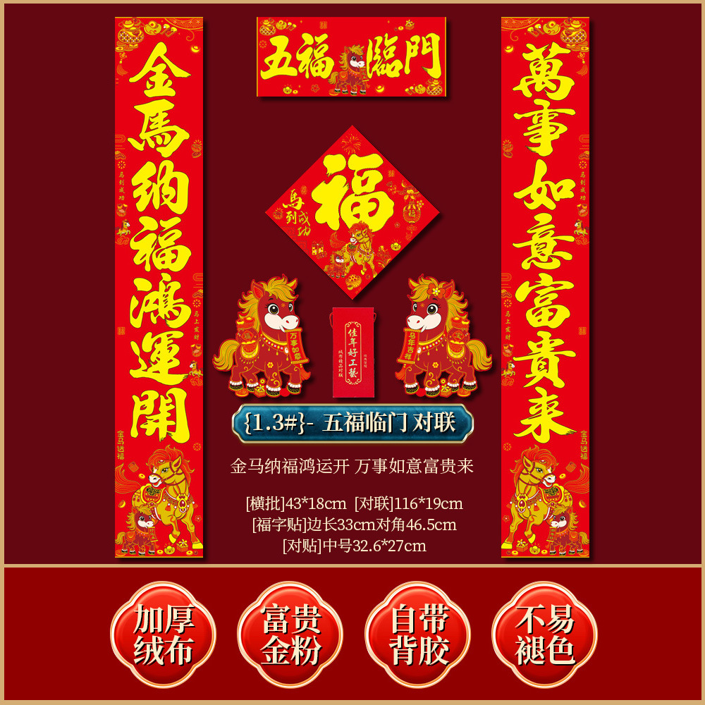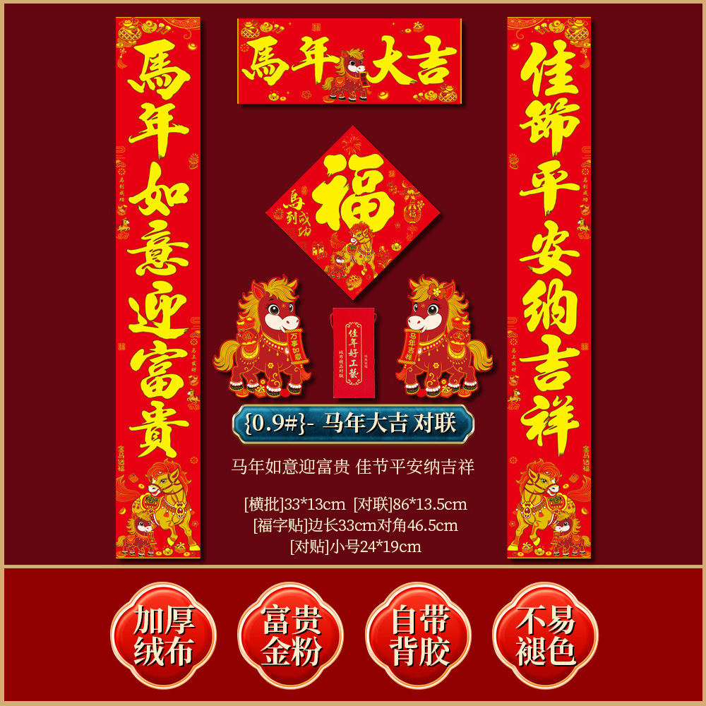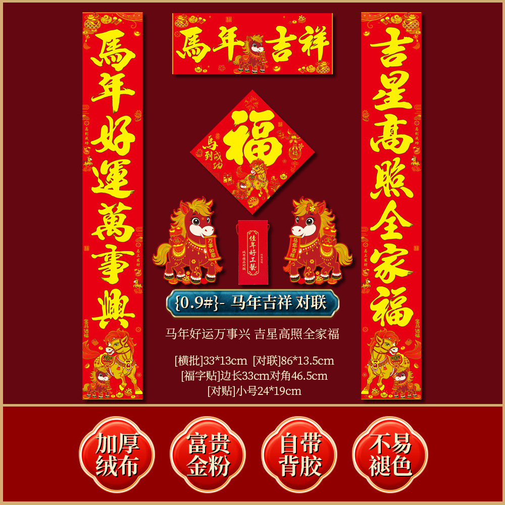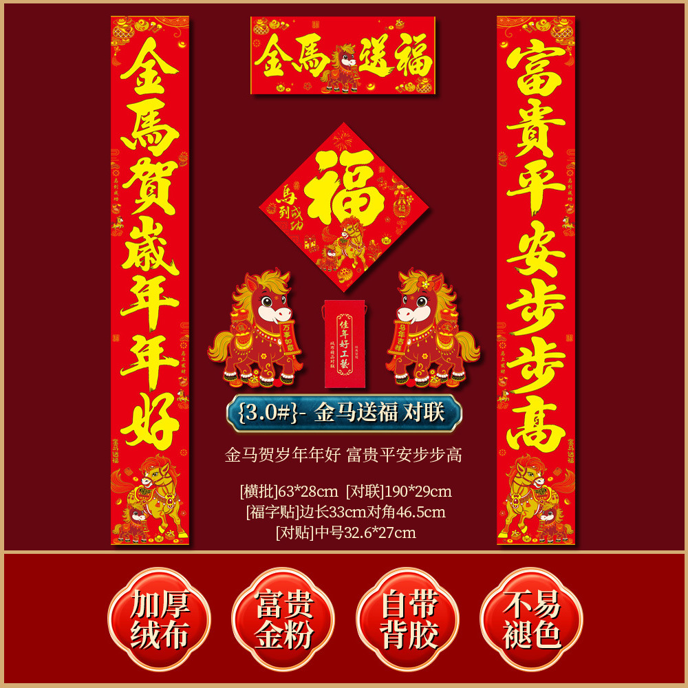 | golden horse sending blessing flannel couplet (with adhesive) (this option does not have fu character)(金马送福绒布对联(自带背胶)(此选项没有福字)) | USD $5.45 | 988 piece available |