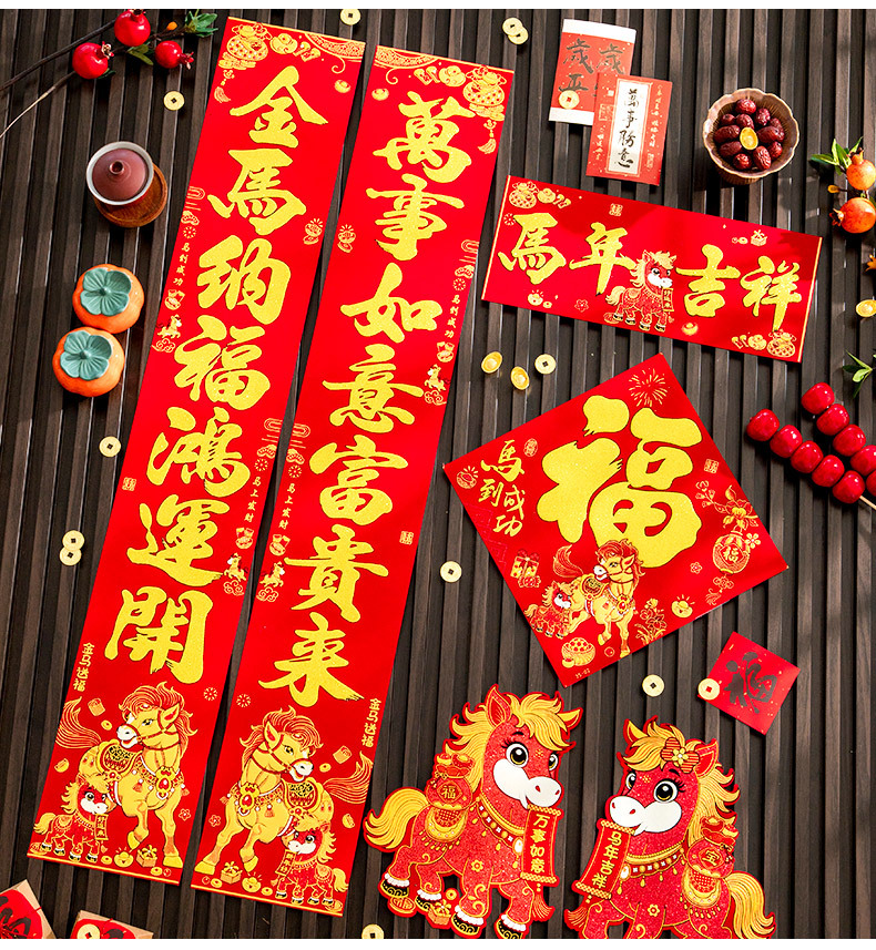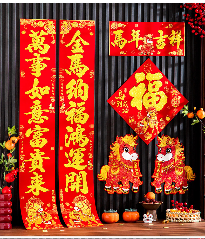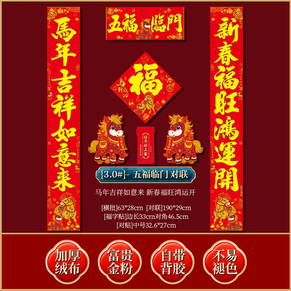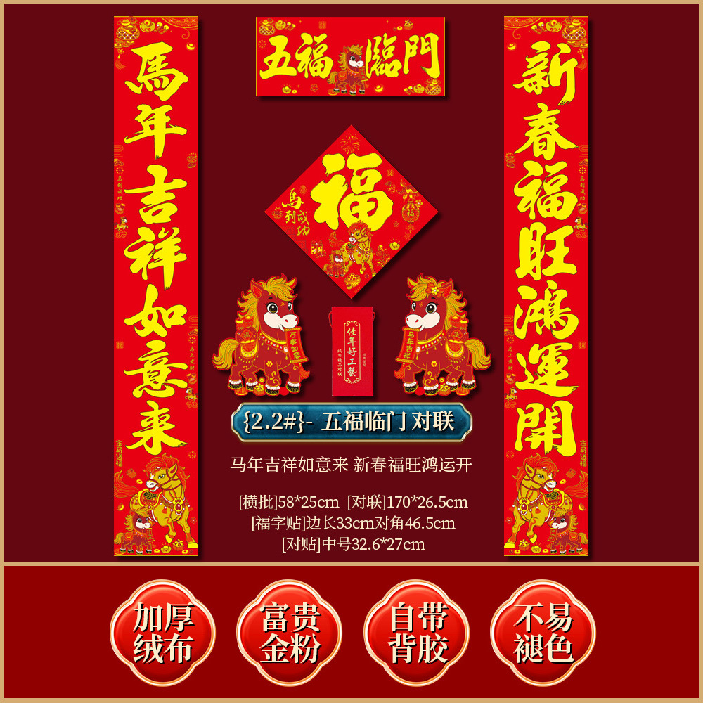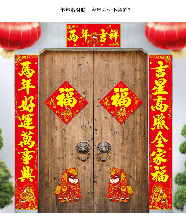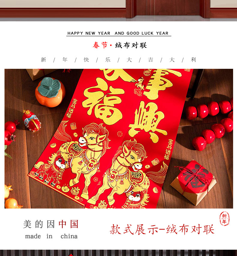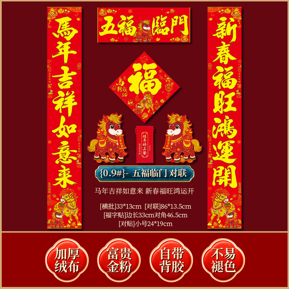 | golden horse sending blessing flannel couplet (with adhesive) (this option does not have fu character)(金马送福绒布对联(自带背胶)(此选项没有福字)) | USD $5.45 | 988 piece available |