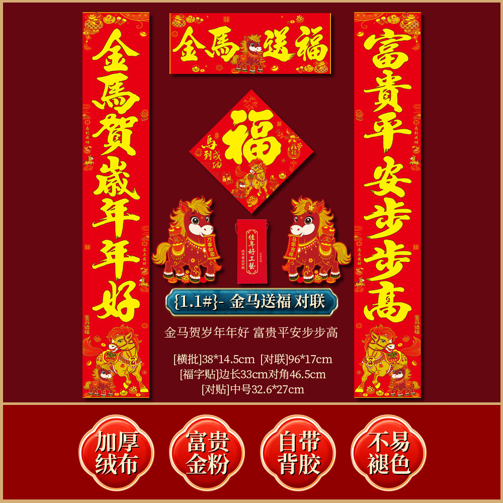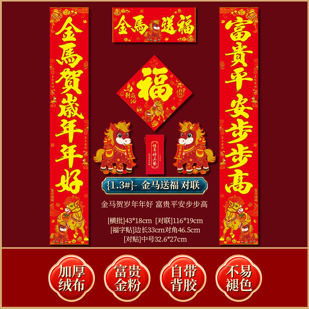 | golden horse sending blessing flannel couplet (with adhesive) (this option does not have fu character)(金马送福绒布对联(自带背胶)(此选项没有福字)) | USD $1.92 | 983 piece available |
