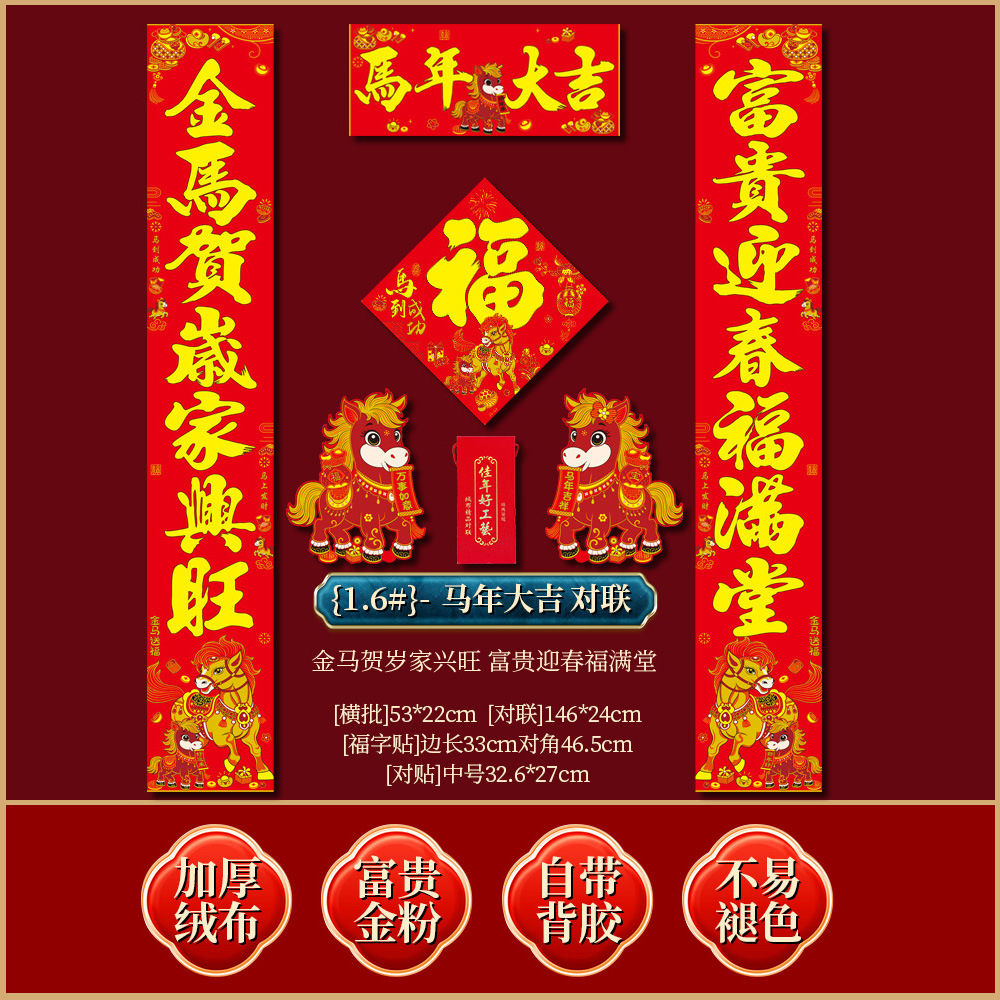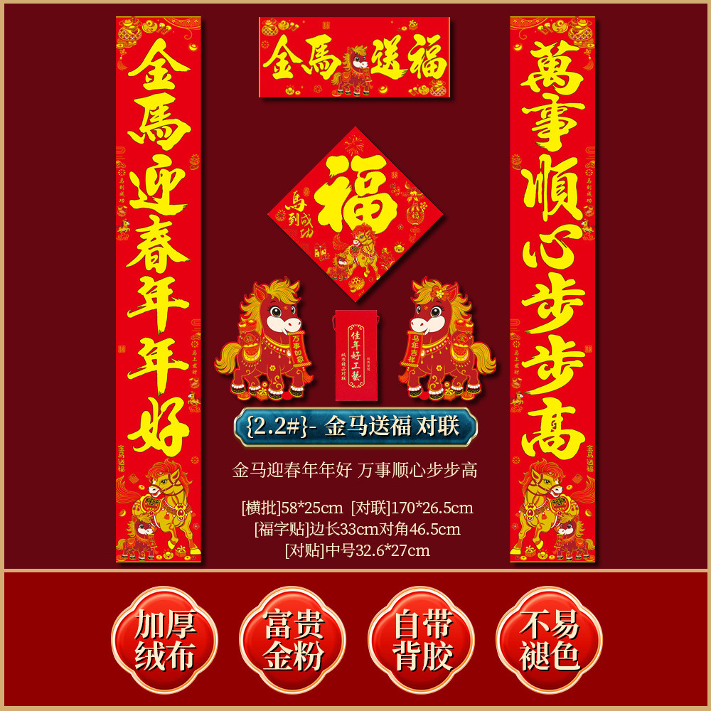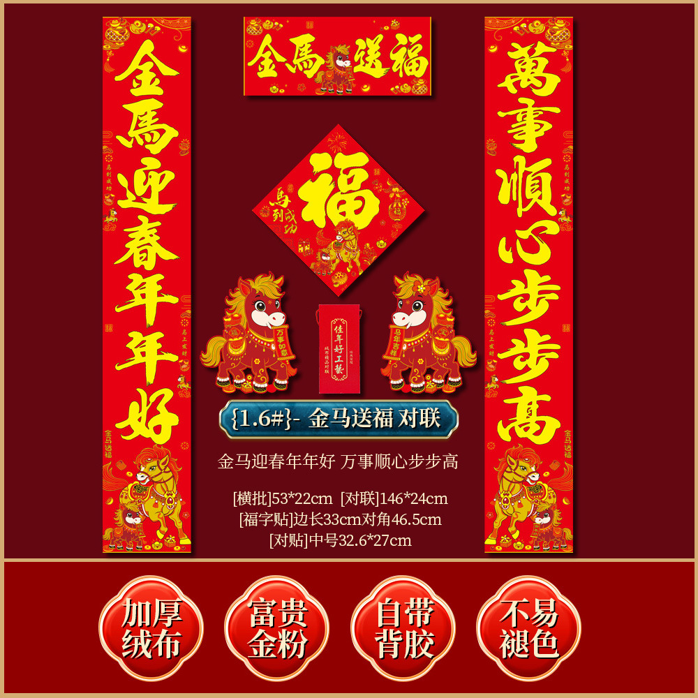 | golden horse sending blessing flannel couplet (with adhesive) (this option does not have fu character)(金马送福绒布对联(自带背胶)(此选项没有福字)) | USD $1.92 | 981 piece available |