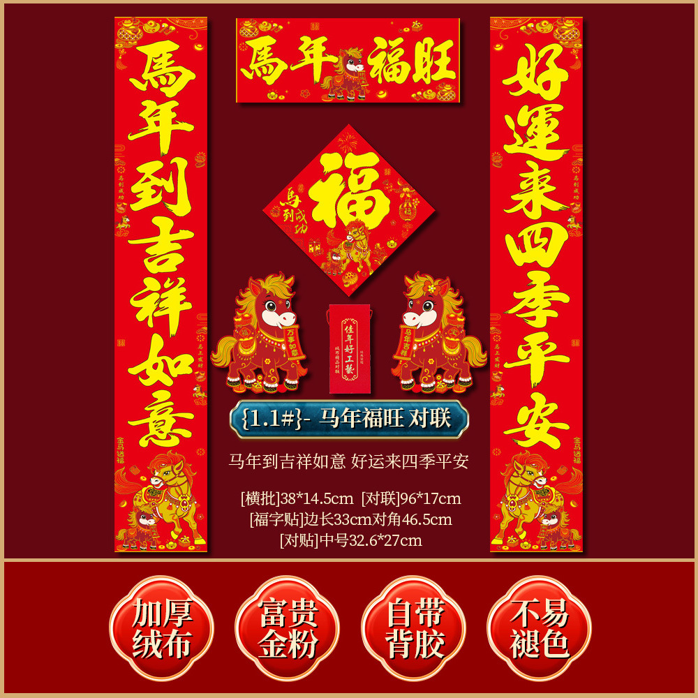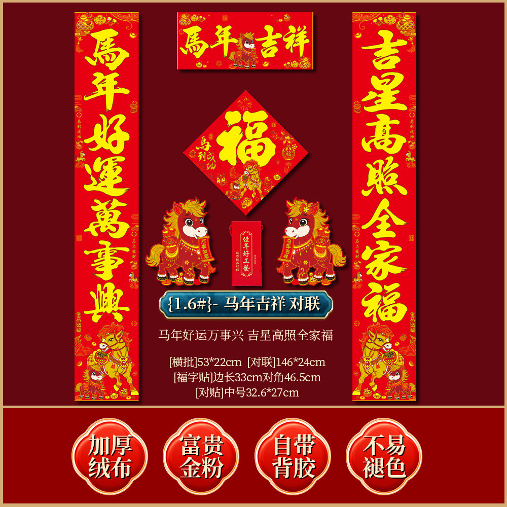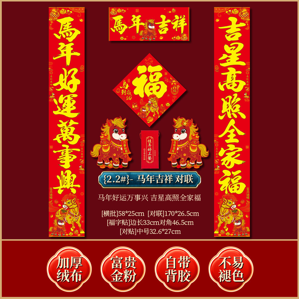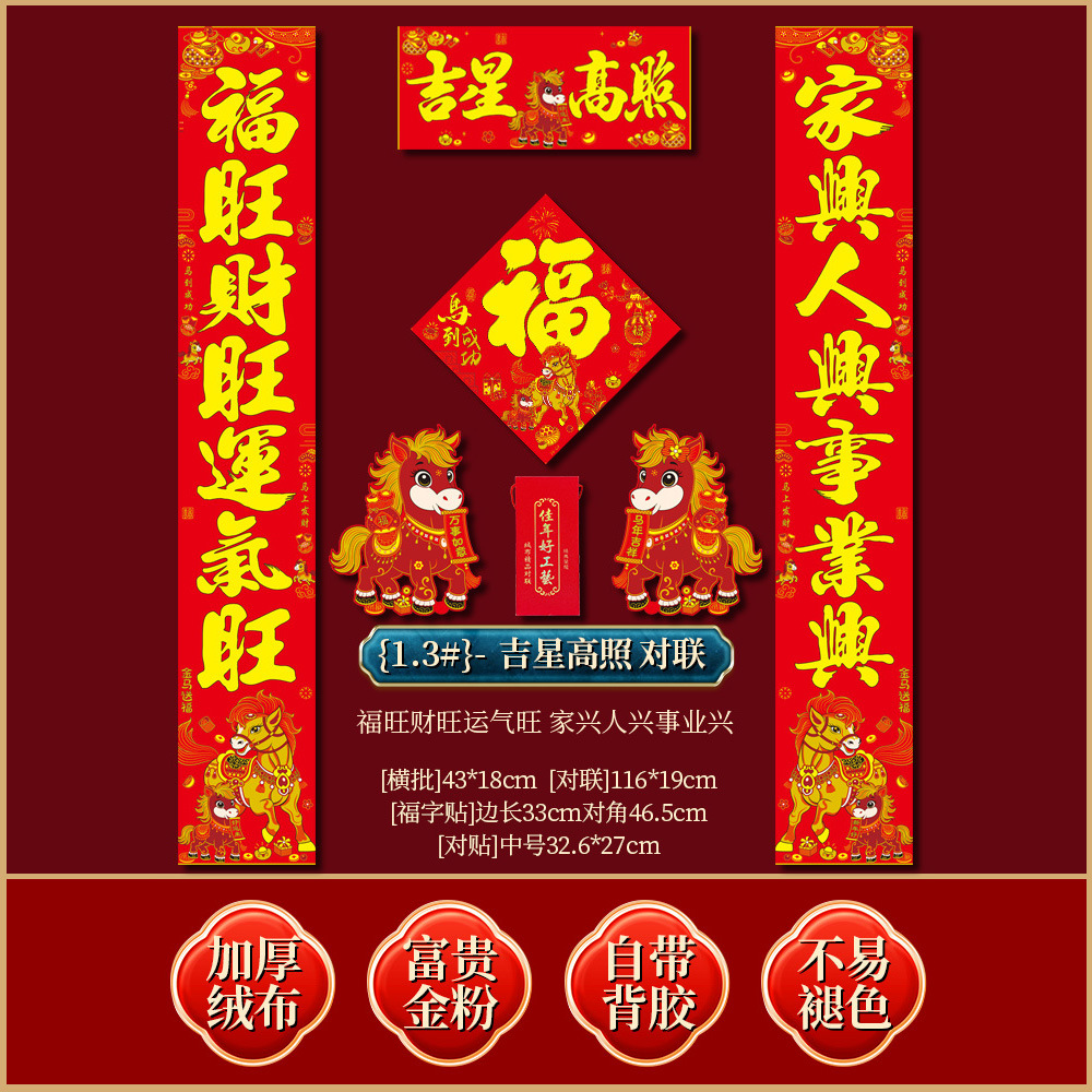 | golden horse sending blessing flannel couplet (with adhesive) (this option does not have fu character)(金马送福绒布对联(自带背胶)(此选项没有福字)) | USD $1.92 | 982 piece available |