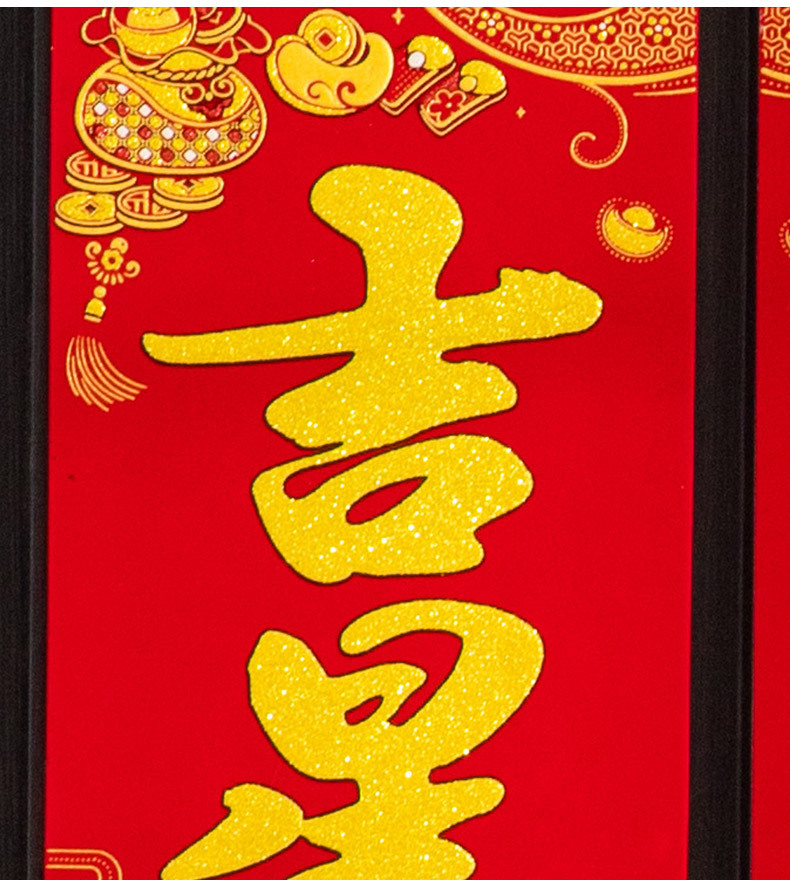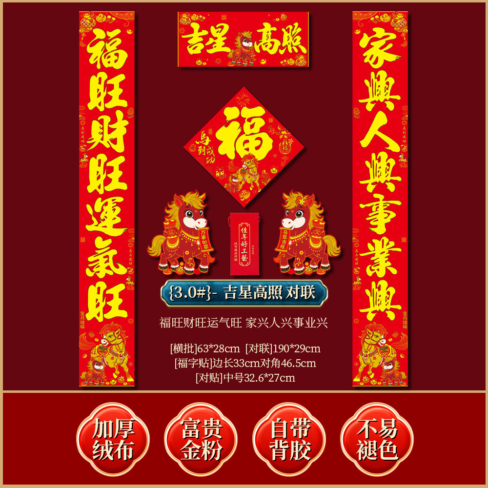 | golden horse sending blessing flannel couplet (with adhesive) (this option does not have fu character)(金马送福绒布对联(自带背胶)(此选项没有福字)) | USD $2.81 | 989 piece available |